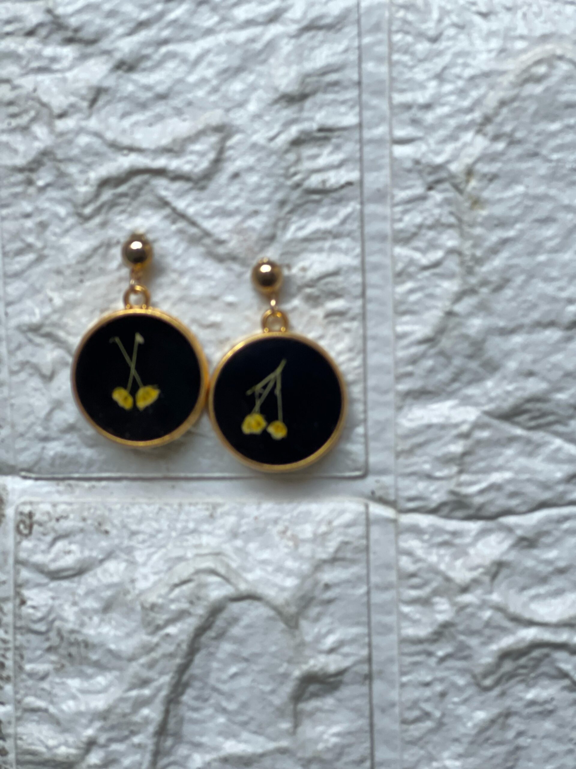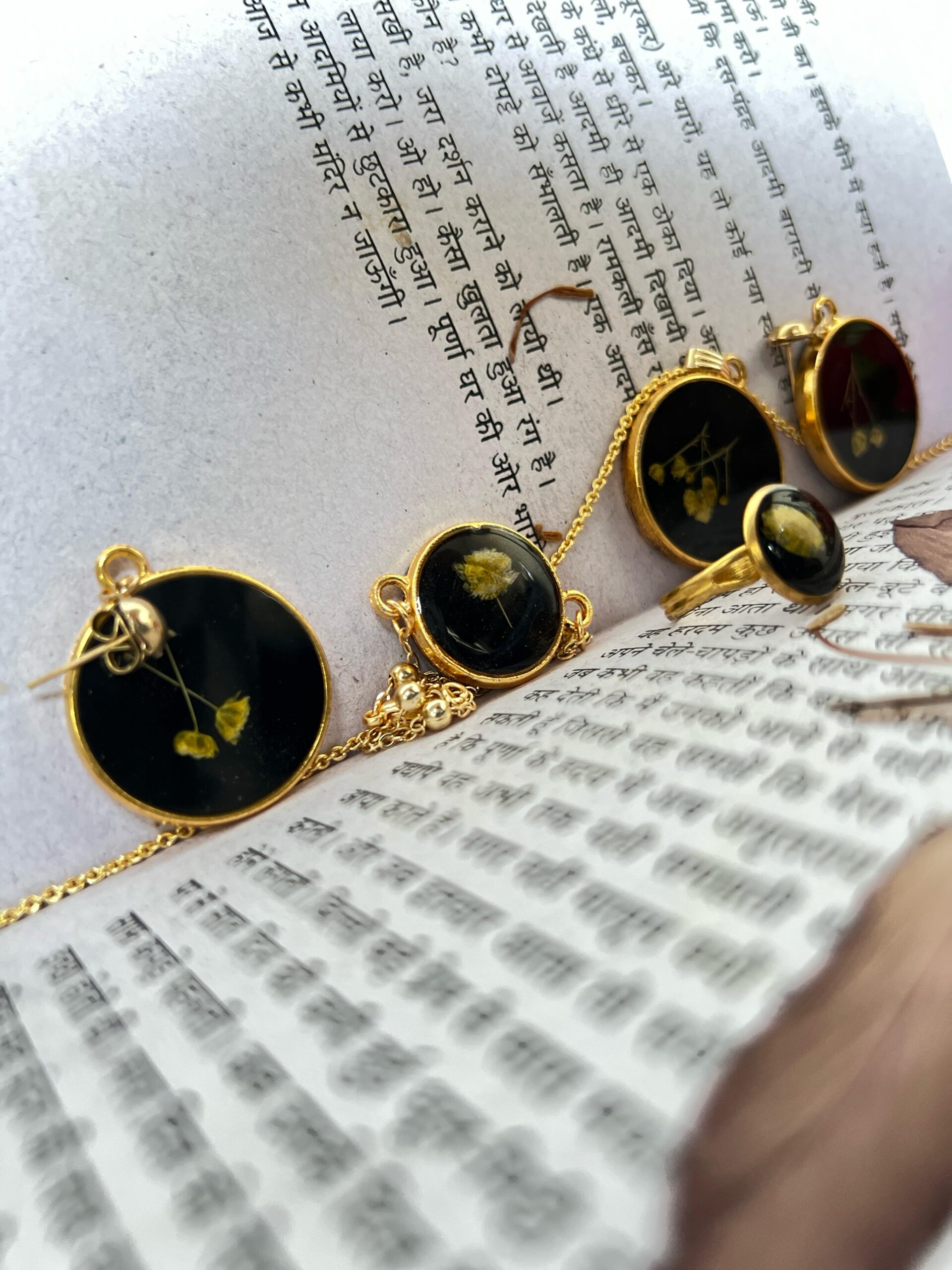 This resin jewellery set is a beautiful mix of nature and art. The set includes one resin ring, two round pendants, and two elegant earrings. Each piece is made with real dried yellow flowers, placed carefully inside black epoxy resin and finished with a golden border.