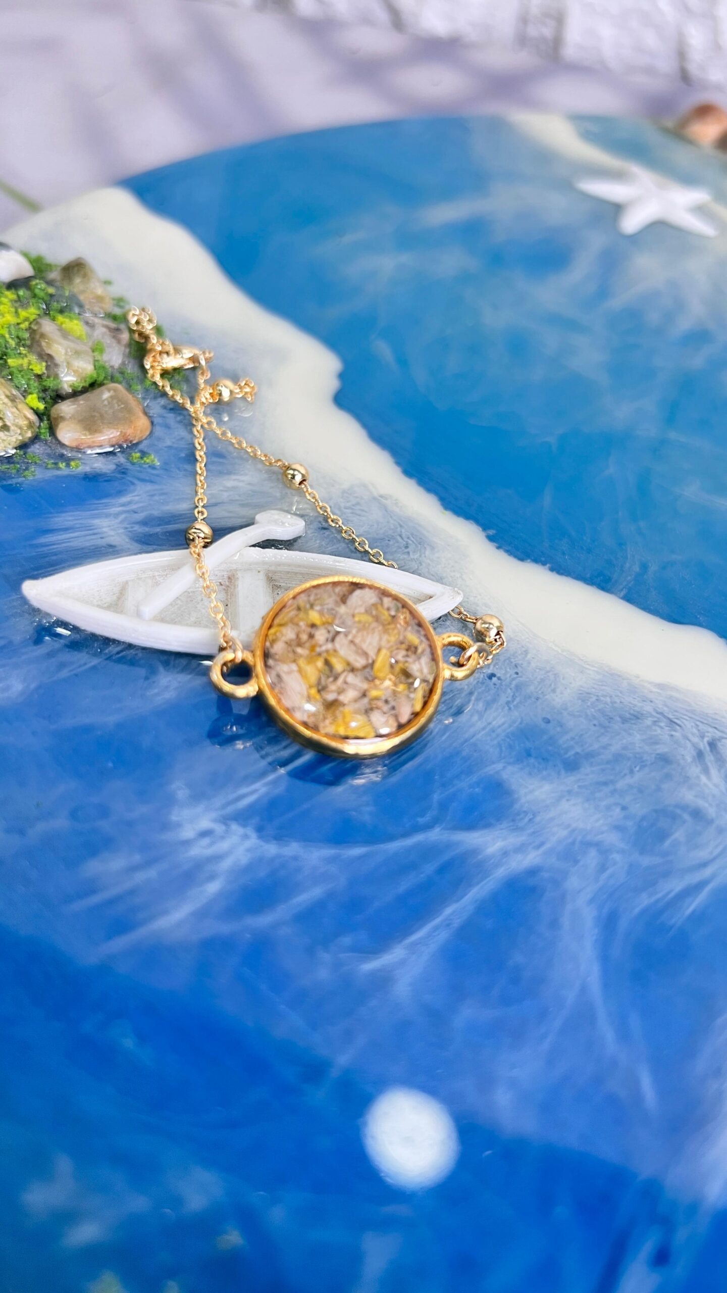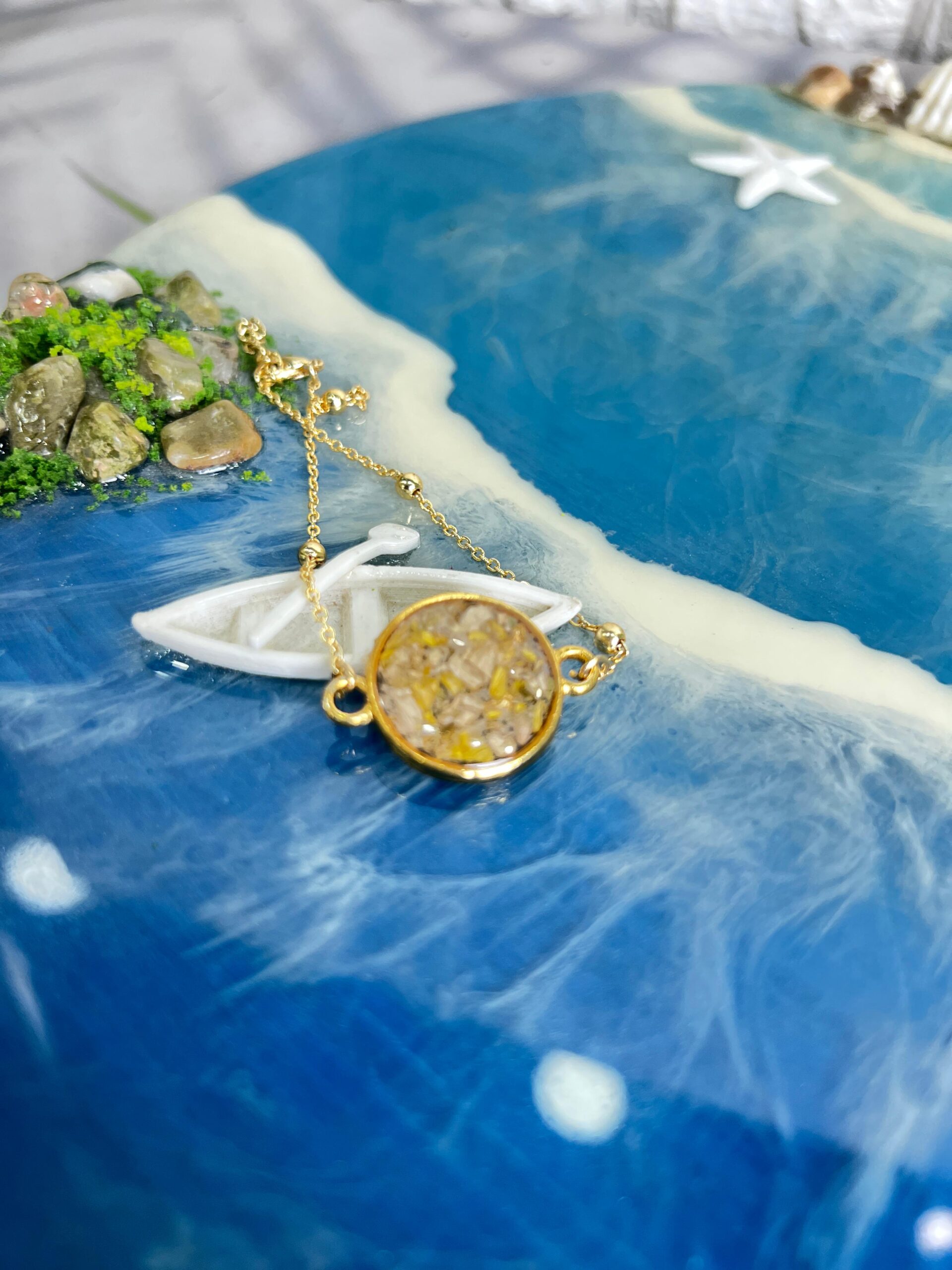 This golden resin bracelet is a simple and pretty piece made with real dried flower petals. The round charm holds these petals safely inside clear resin, making it look beautiful and unique. Each bracelet is handmade with love and care.