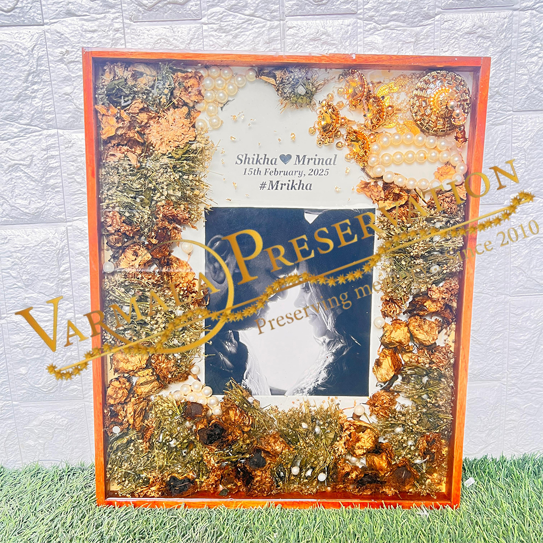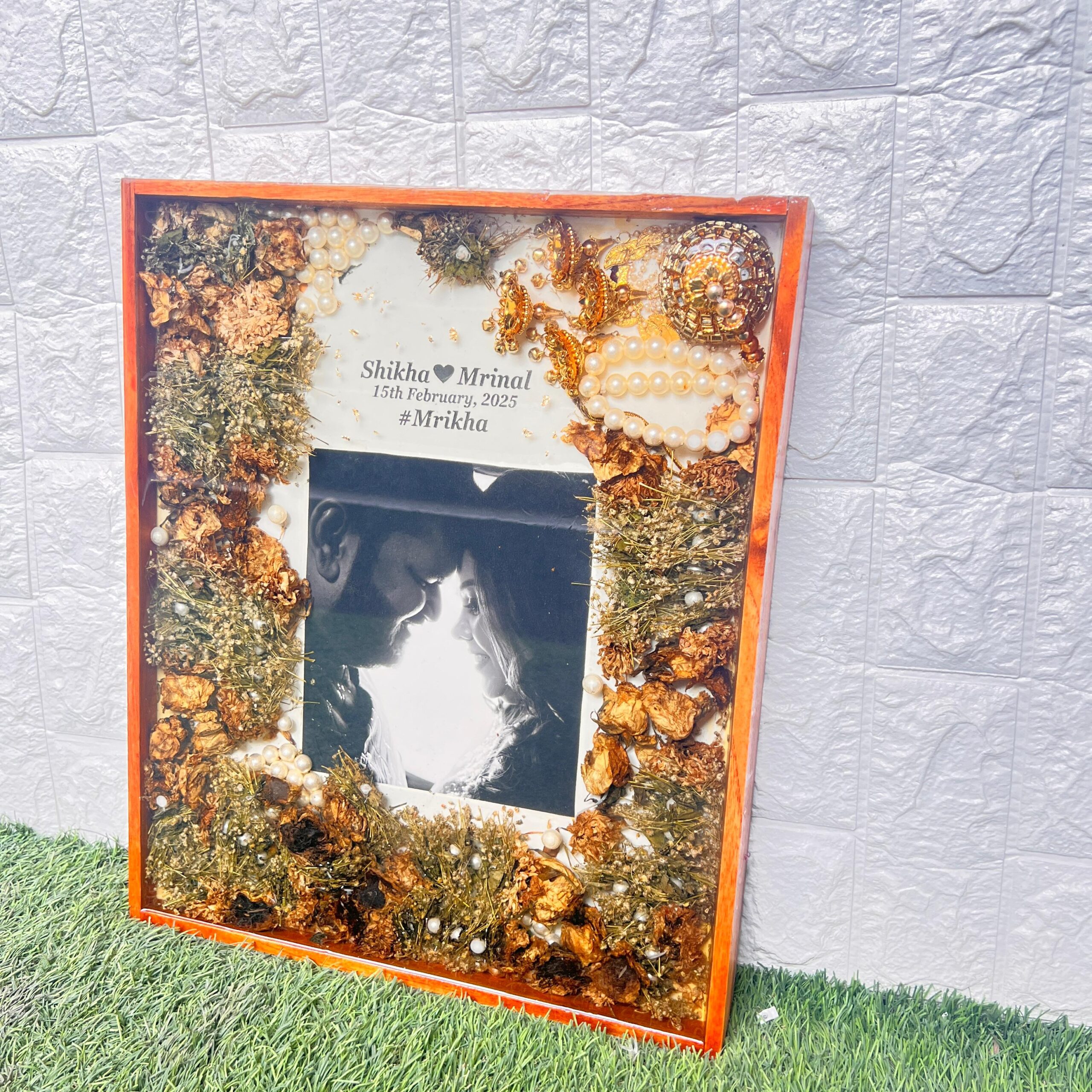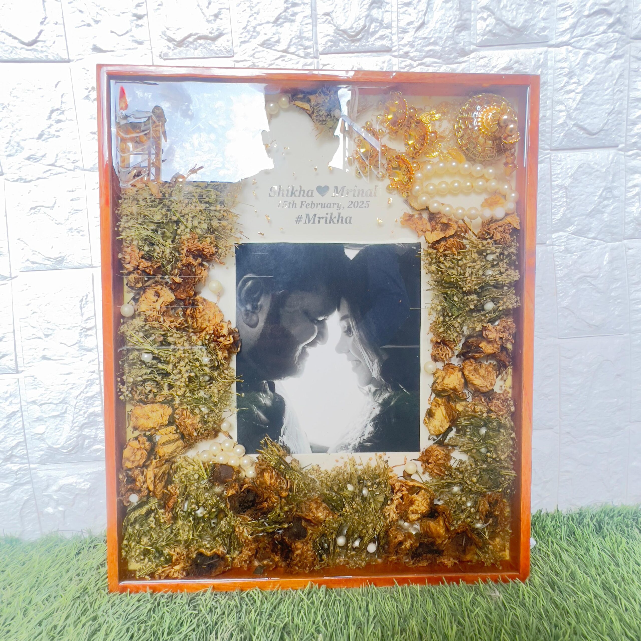 Celebrate love with our rectangle resin frame with photo & name, made specially to lock your memories forever. This eye-catching frame holds your beautiful wedding or pre-wedding photo right in the center, surrounded by real flowers, shimmer, kaleera, pearls, and custom text.