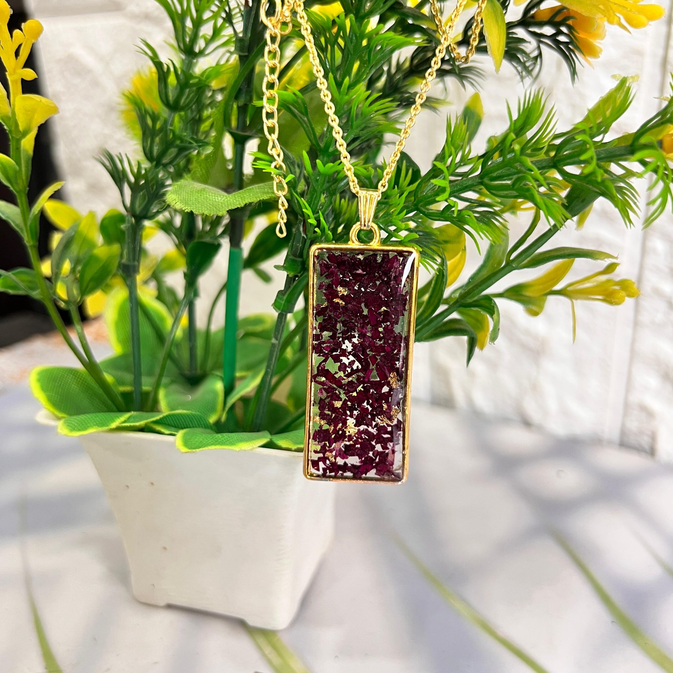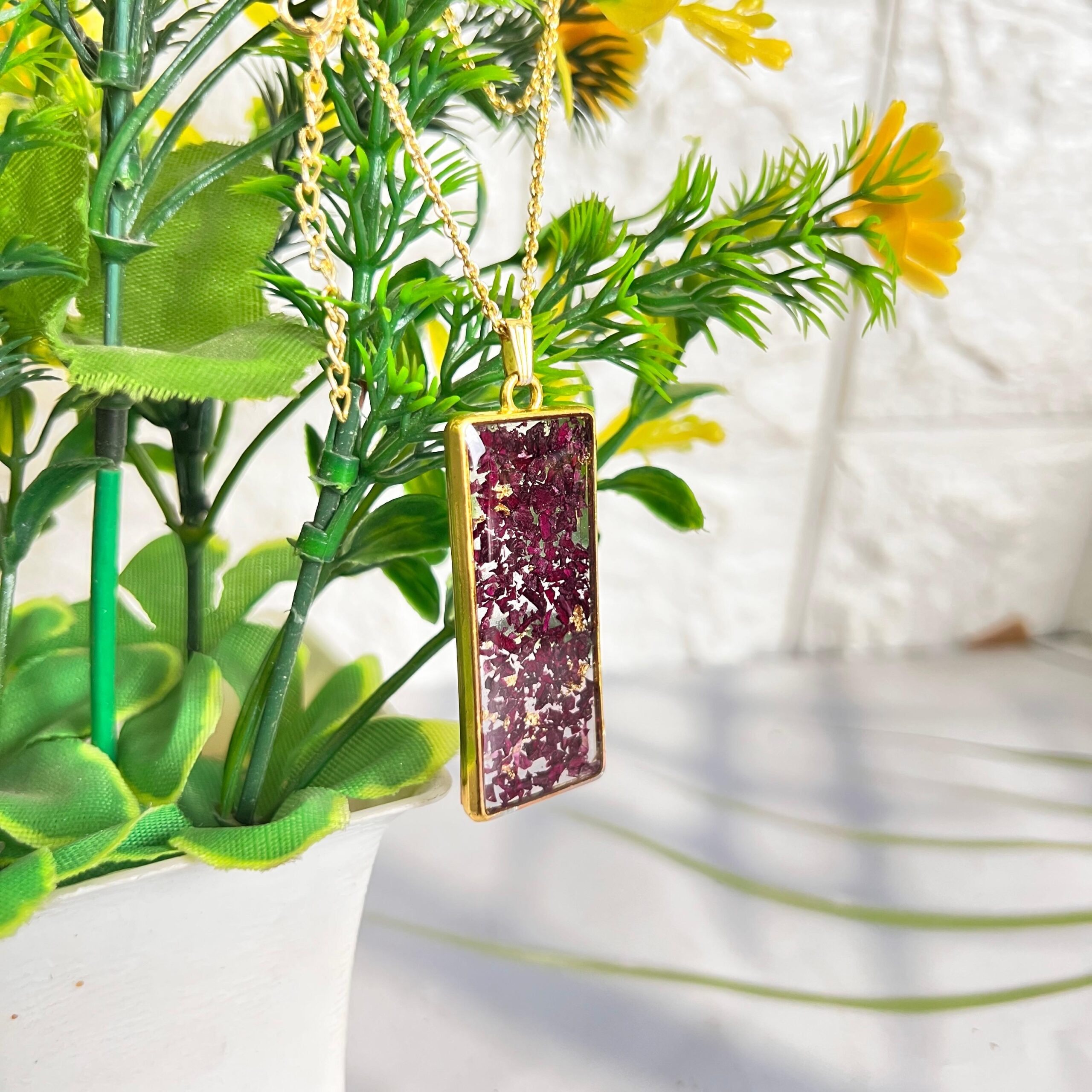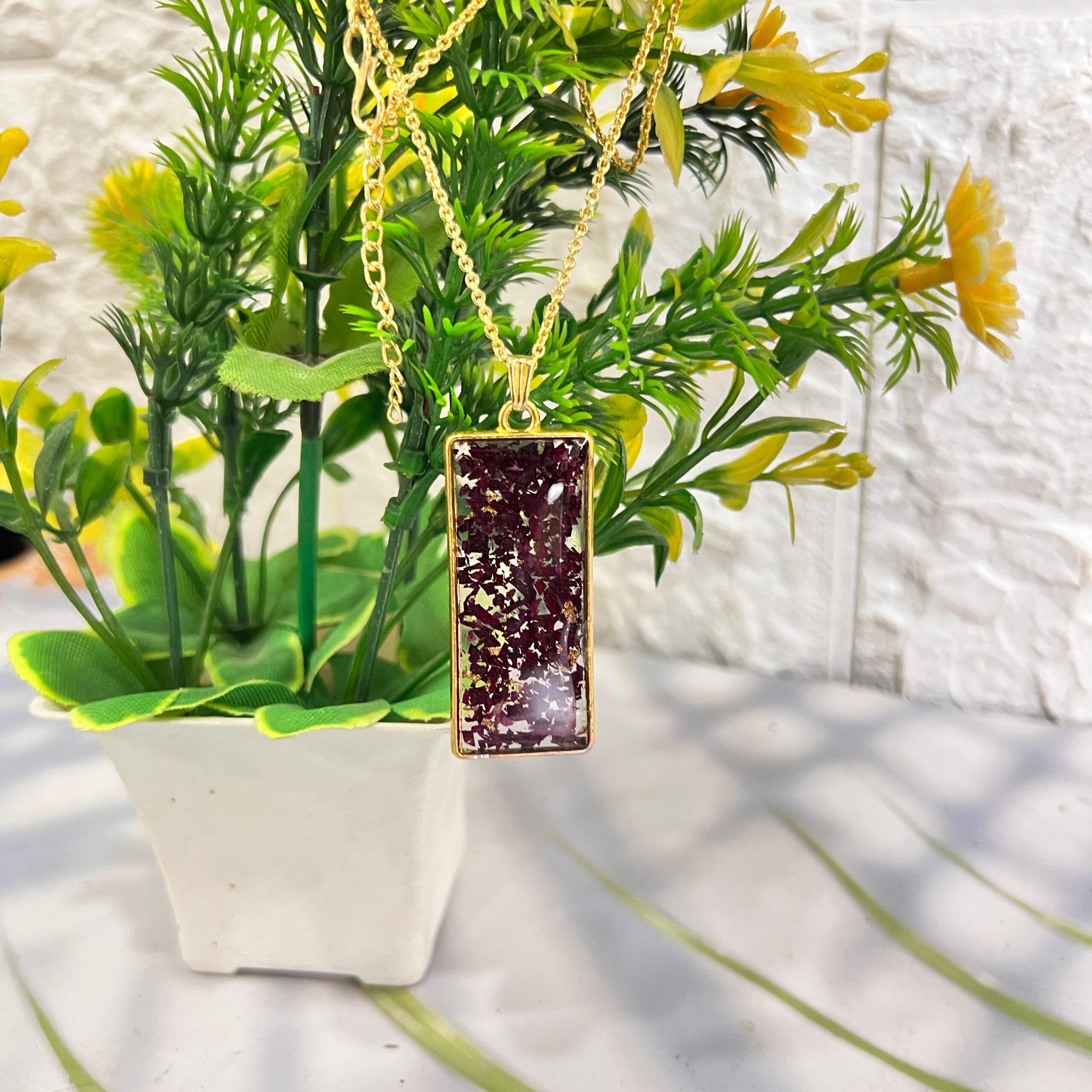 This stylish rectangle resin pendant necklace is made using real dried rose petals from varmala. The deep maroon petals are sealed inside a clear resin charm and decorated with shining gold flakes, giving it a rich and classy look. The pendant is set in a gold polish frame and comes with a matching lightweight chain.