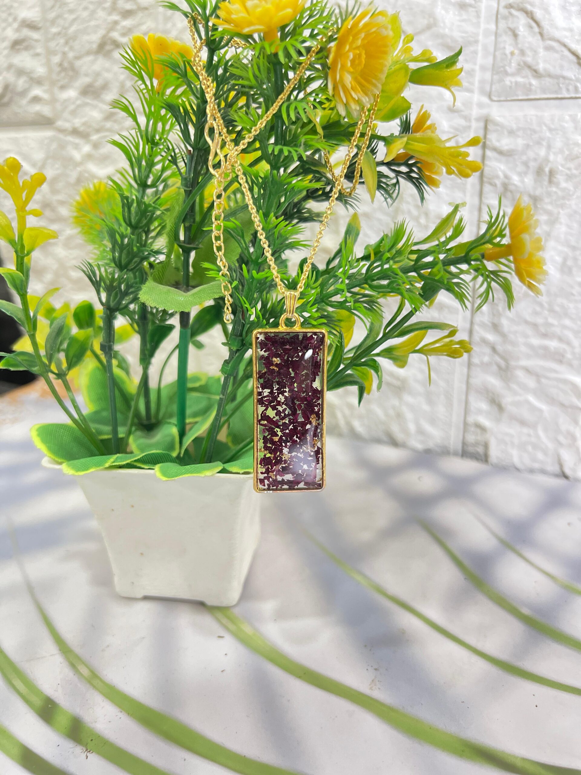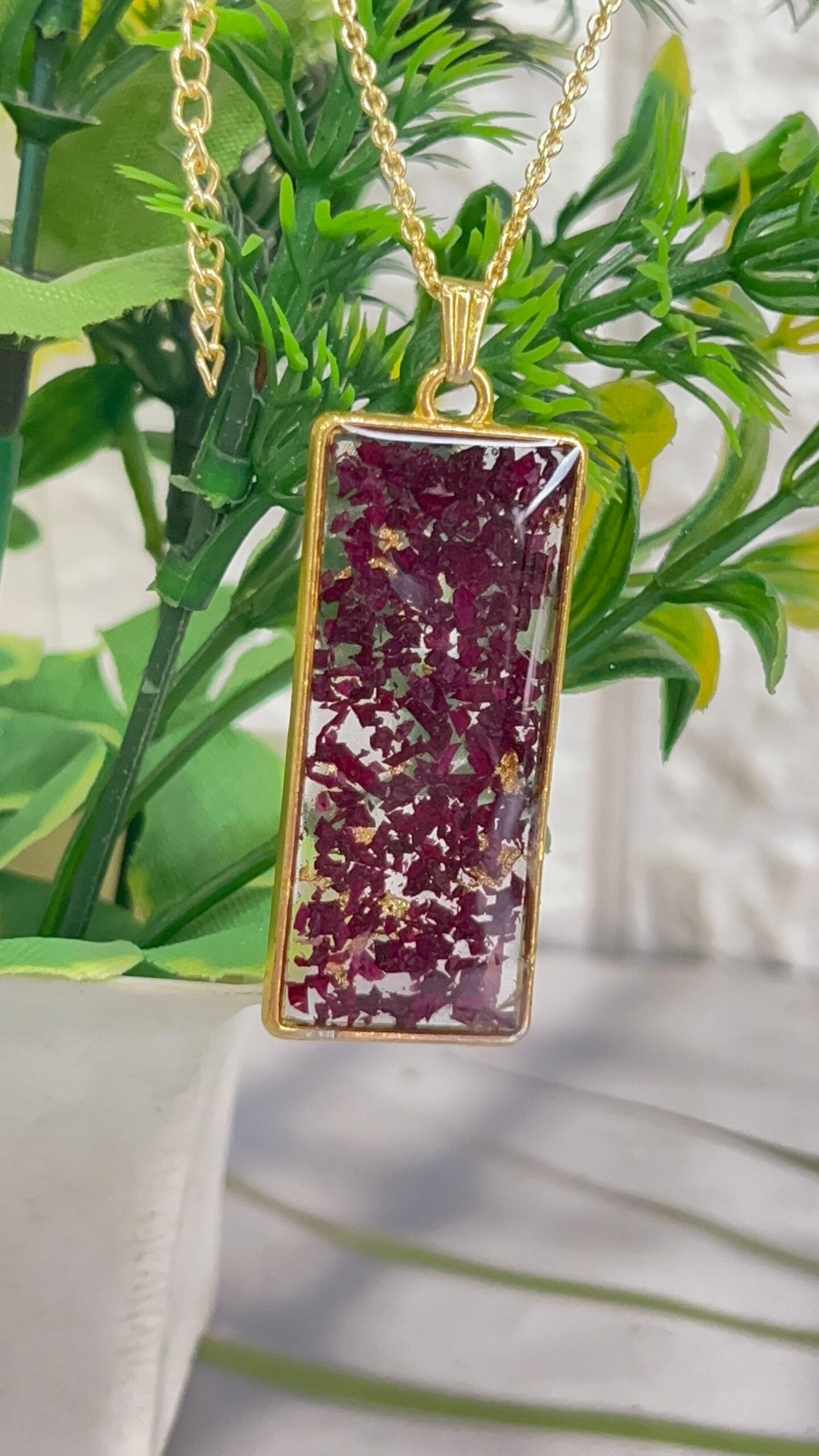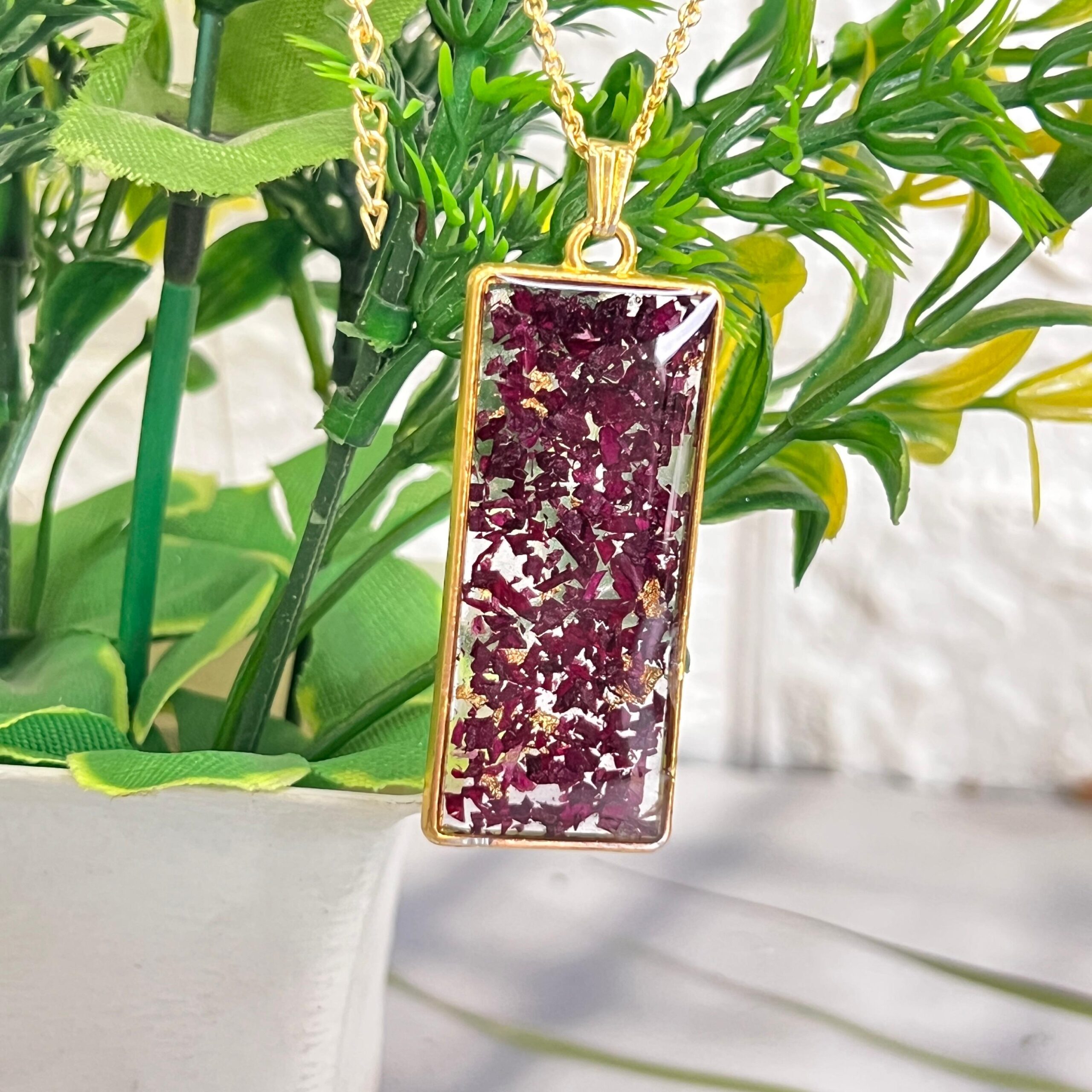 This stylish rectangle resin pendant necklace is made using real dried rose petals from varmala. The deep maroon petals are sealed inside a clear resin charm and decorated with shining gold flakes, giving it a rich and classy look. The pendant is set in a gold polish frame and comes with a matching lightweight chain.