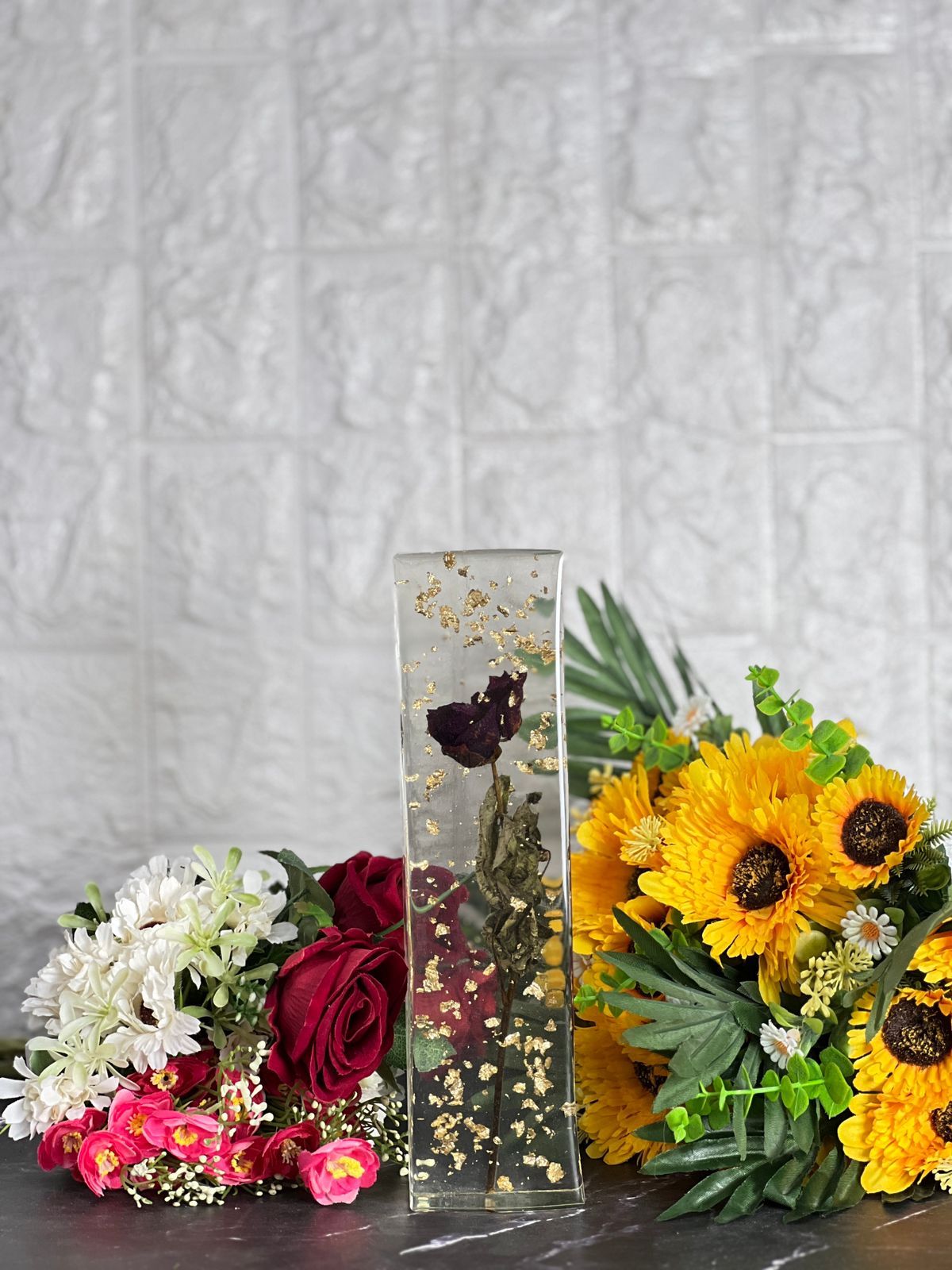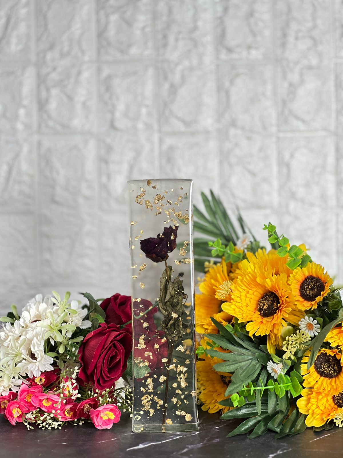 Turn your cherished flowers into a timeless keepsake with this LED Rectangular Resin Block for Single Rose Preservation. Whether it’s a rose from a special occasion or a flower with sentimental value, we encapsulate it in premium resin with delicate gold flakes for a stunning and luxurious design. This unique piece comes with integrated LED lighting, which enhances the beauty of the preserved flower, making it a perfect decor item for your home or a heartfelt gift for your loved ones. Each block is carefully handcrafted to ensure the flower's natural beauty is preserved for years to come. You can also preserve your wedding varmala or other wedding ornaments such as kaleere, kalangi, wedding cards, chooda, and many other items, turning them into a unique keepsake.
