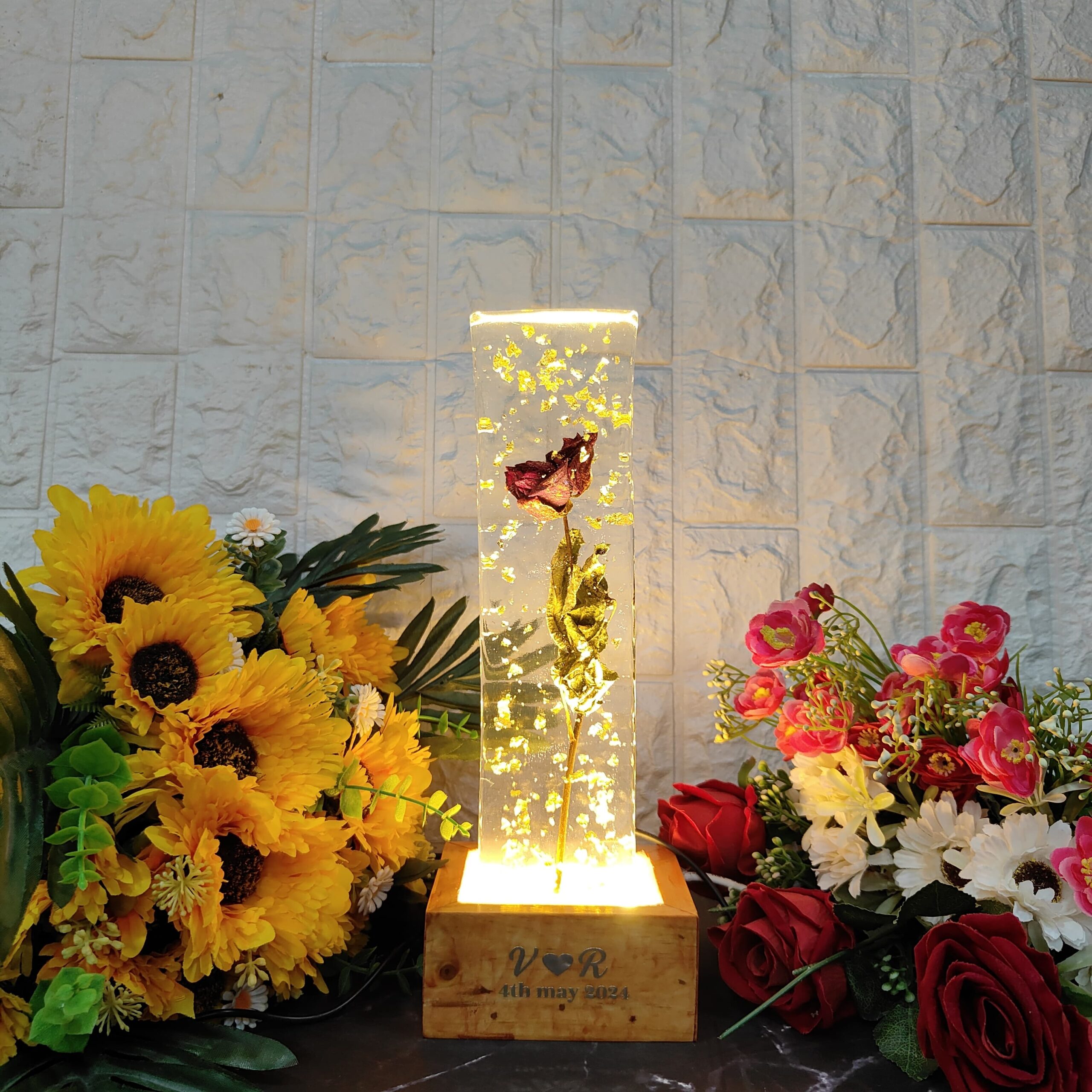 Preserve your special flower with our LED rectangular resin block. Handcrafted with gold flakes, this elegant keepsake is perfect for home decor or gifting.