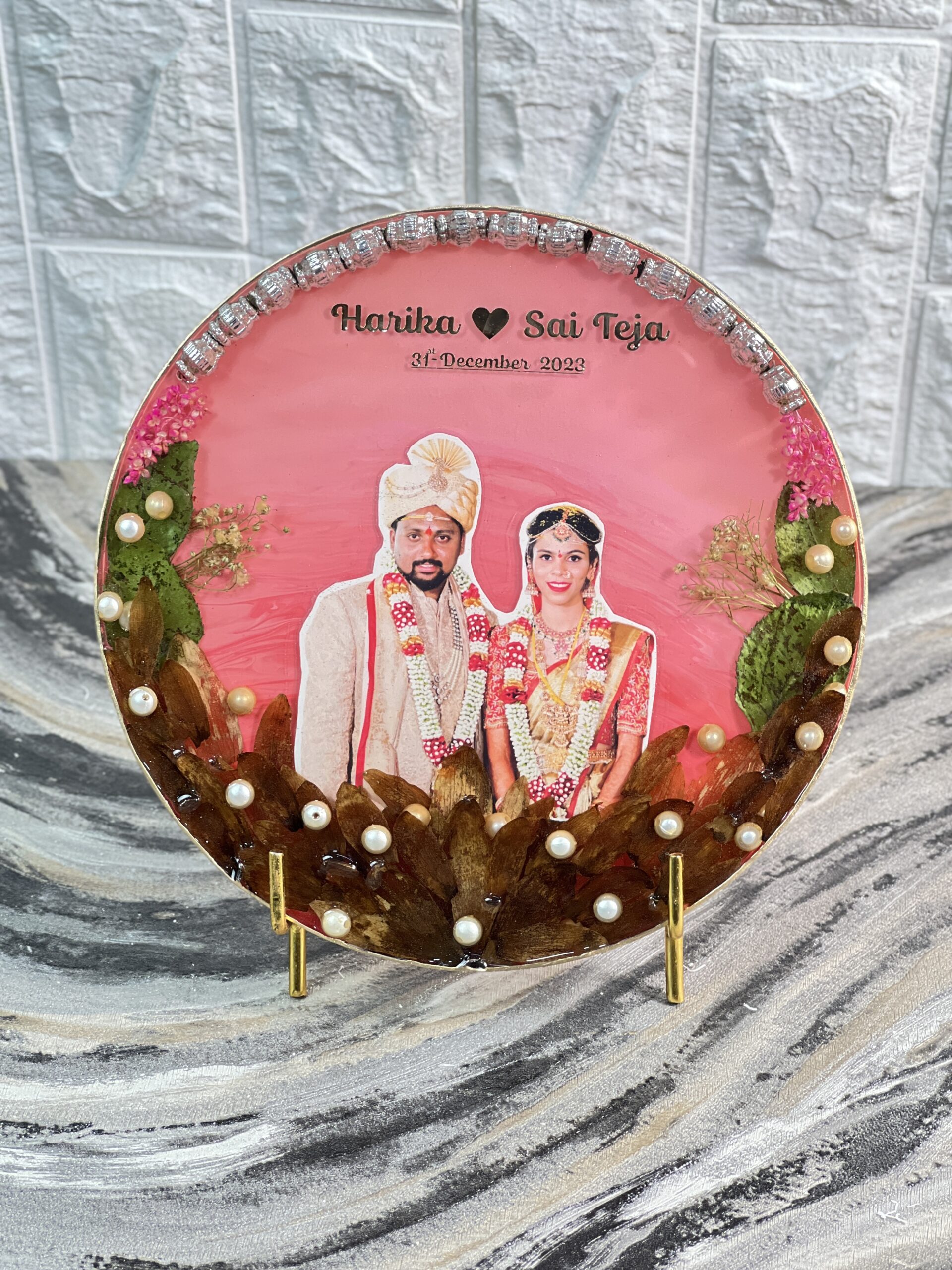 This elegant (8)-inch resin frame turns your wedding photo and varmala into a forever keepsake. It features your names, wedding date, and is decorated with original varmala parts, pearls, and golden leaves—all placed beautifully in a bright red backdrop. The plate is sealed with premium resin for a smooth, glass-like look that shines from every angle.