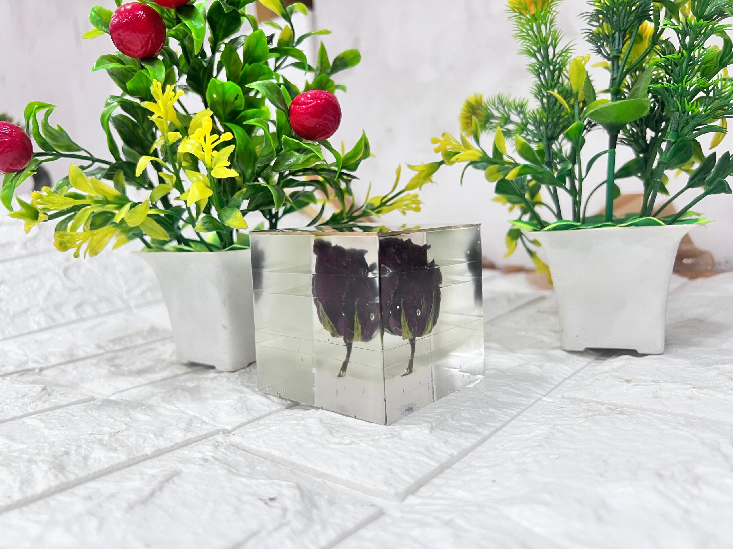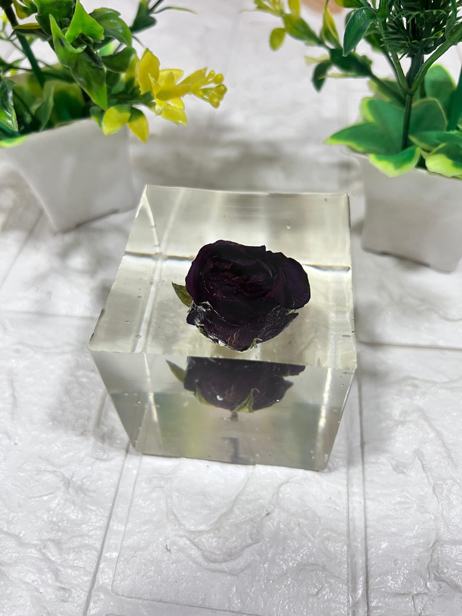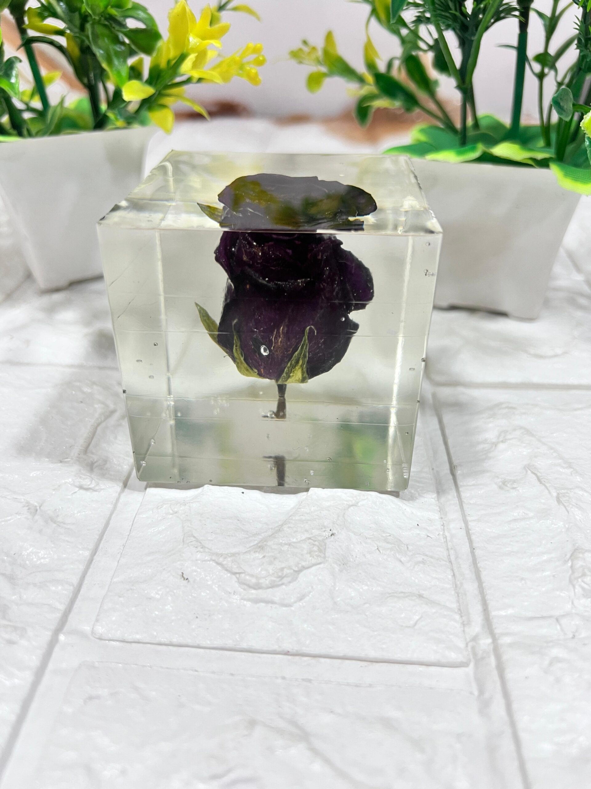 This Resin Block with Real Rosebud is a beautiful floral memory block made using a real dried rosebud sealed inside crystal-clear epoxy resin. The cube shape gives a clean, modern look and shows the rose from all sides. It’s a perfect way to keep your flower safe forever.