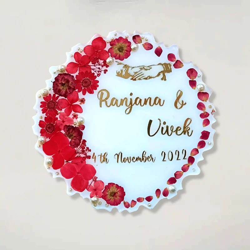 Make your engagement or wedding unforgettable with our Resin Curve Shaped Varmala Preservation Frame. This 8.5-inch curve frame preserves your real red wedding flowers inside high-quality resin, keeping their beauty fresh for years.
