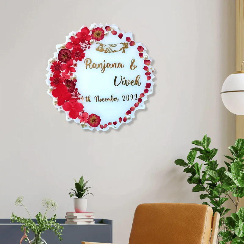 The unique curved design and white frame make the red flowers stand out beautifully, giving your wedding memory a modern and elegant look. You can also add names, wedding date, or a special message, making it a personal and meaningful keepsake.