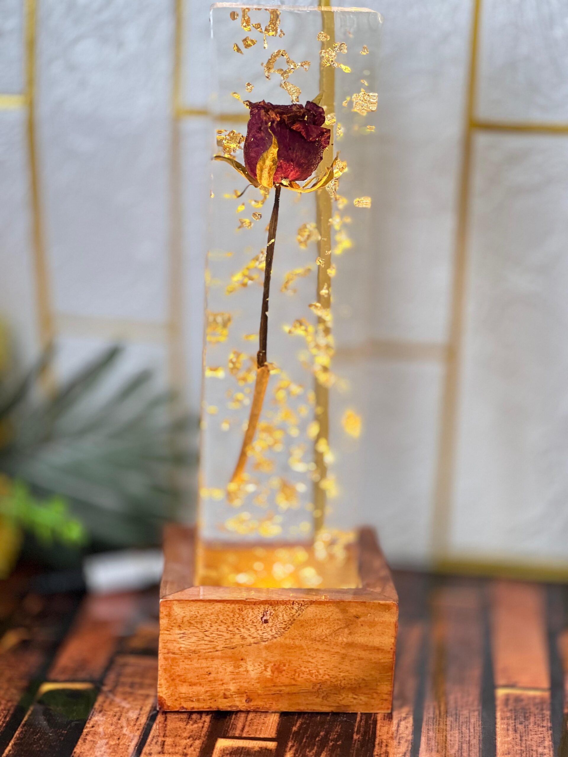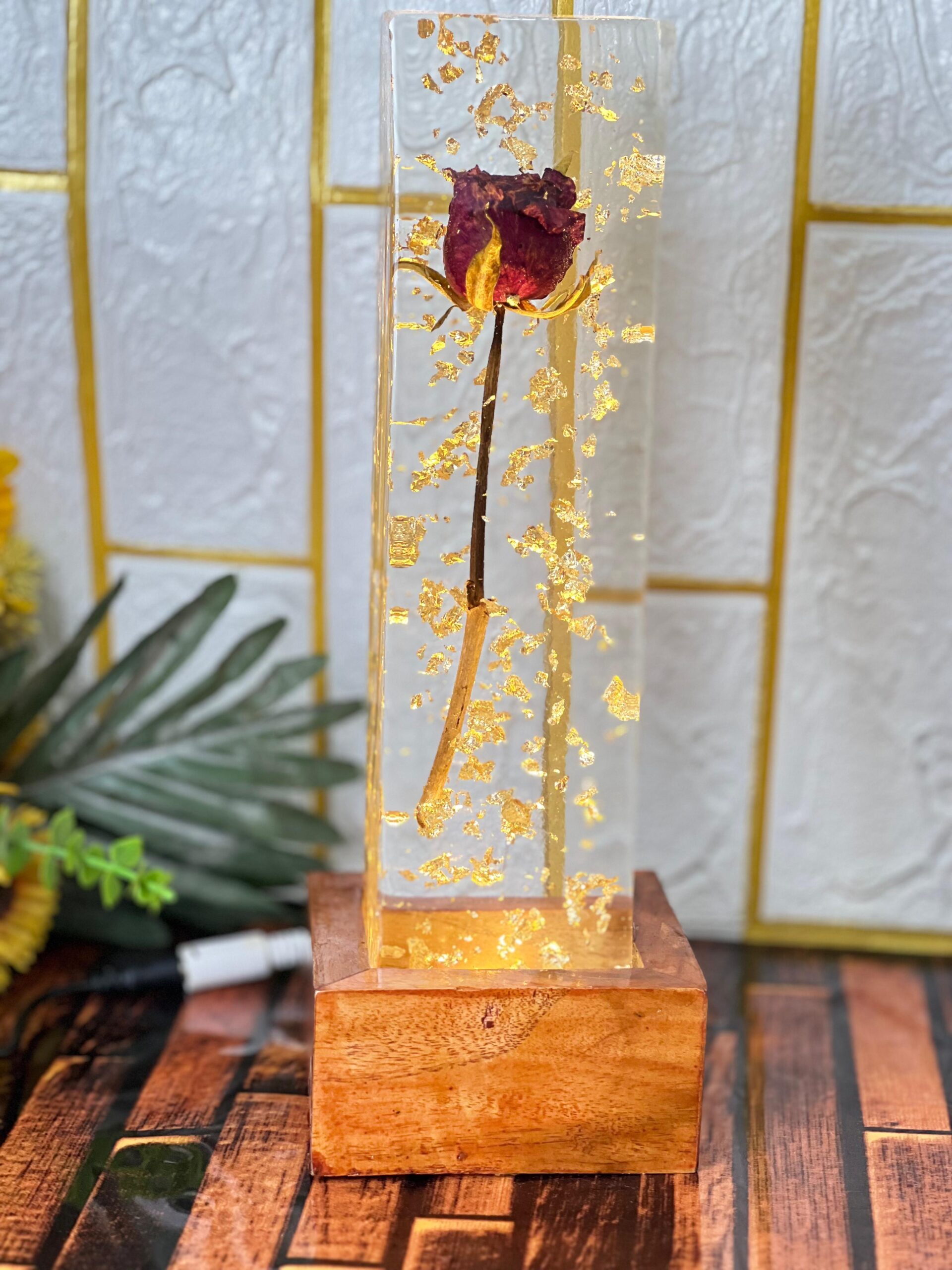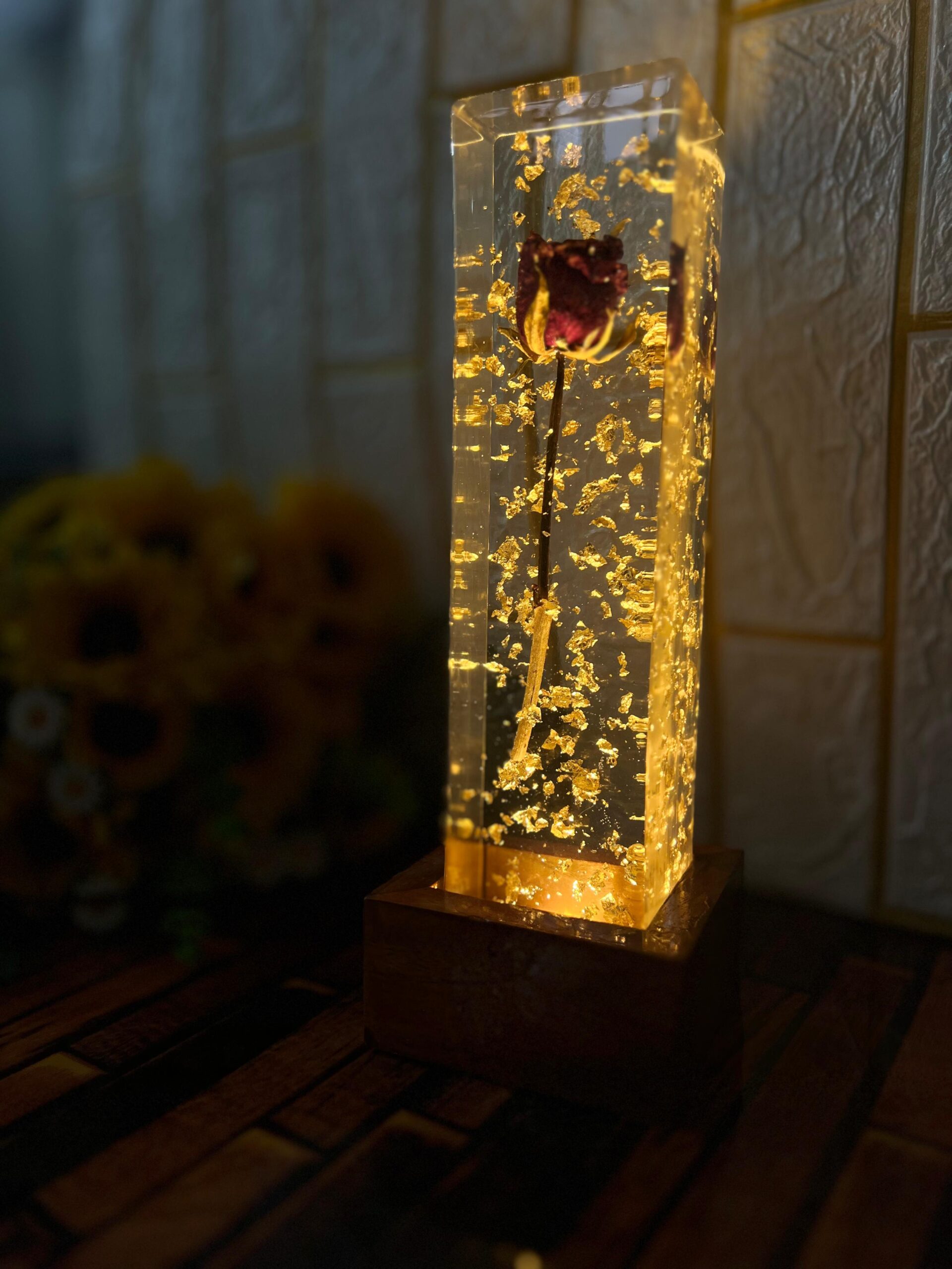 This Resin Flower Preserved LED Lamp is a perfect mix of art and memory. Inside this glowing block, a real rose is beautifully preserved with golden flakes, giving it a soft, romantic shine.