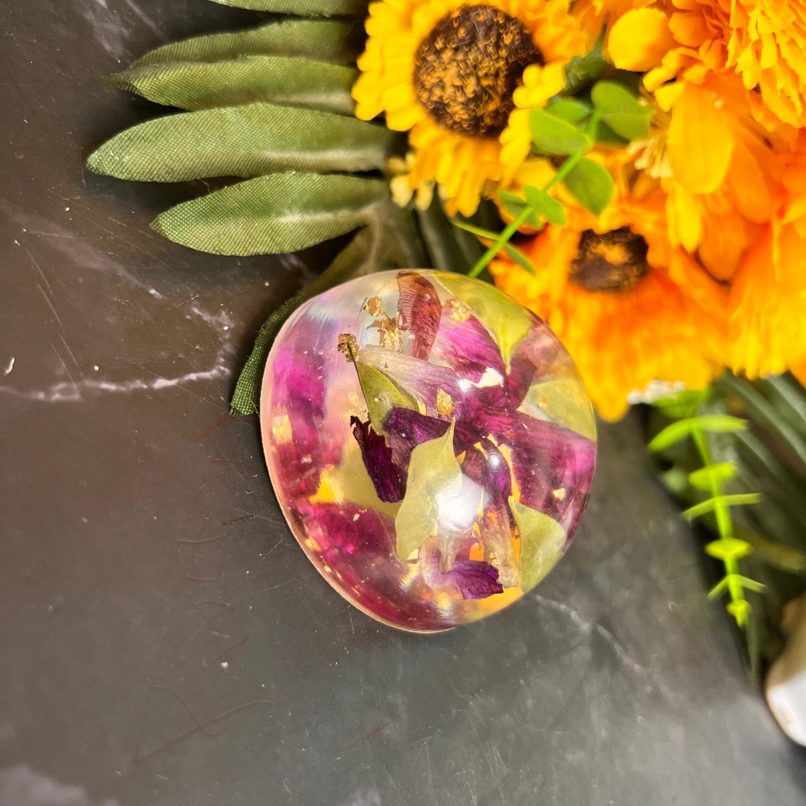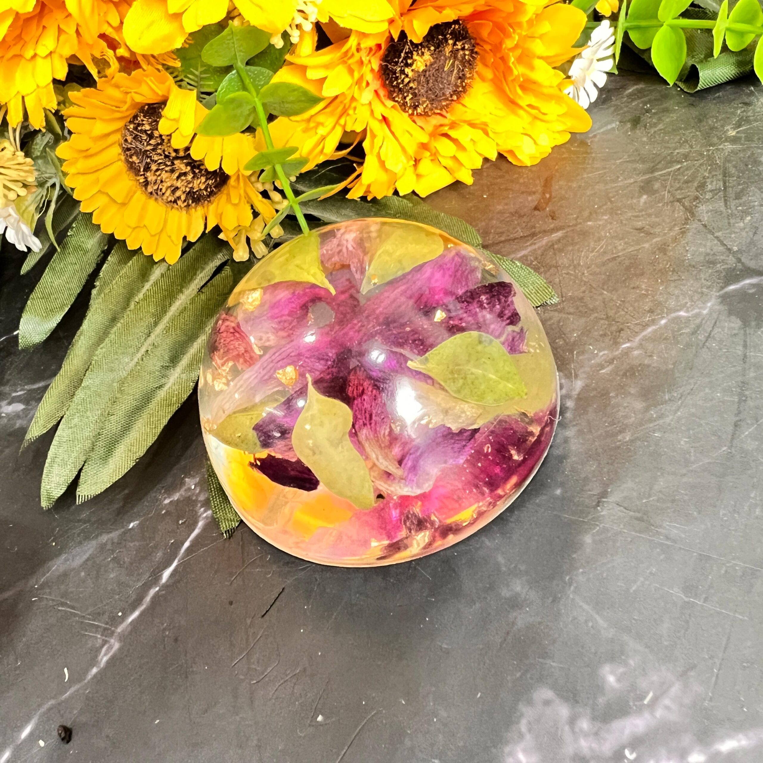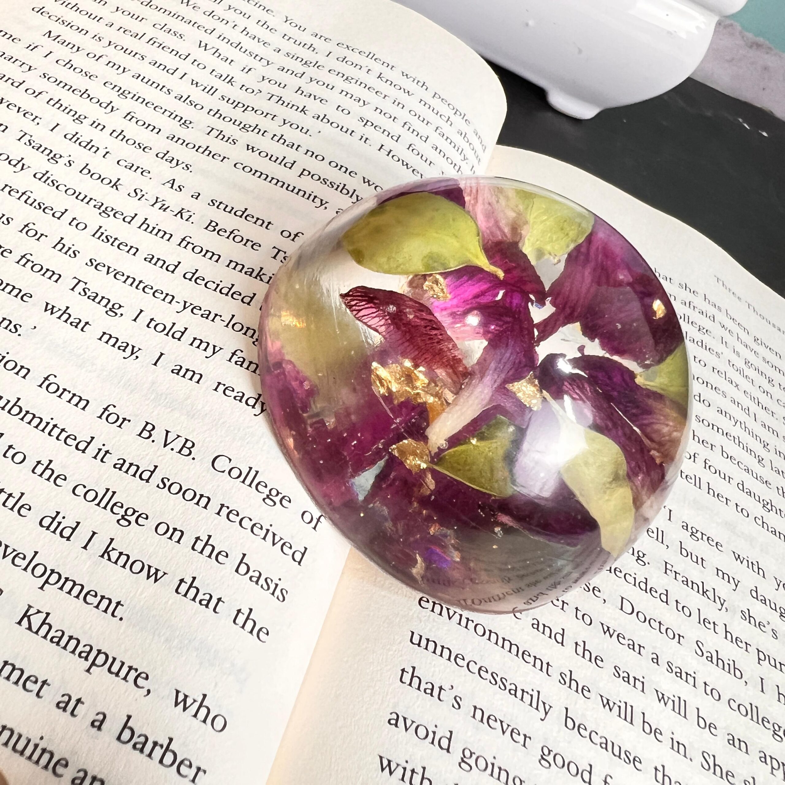 This resin paperweight is a lovely mix of beauty and function. Made with real flower petals and shiny gold flakes, it’s shaped like a soft dome that sits perfectly on books or papers. The flowers inside are sealed forever, giving you a piece of nature and memory on your desk.