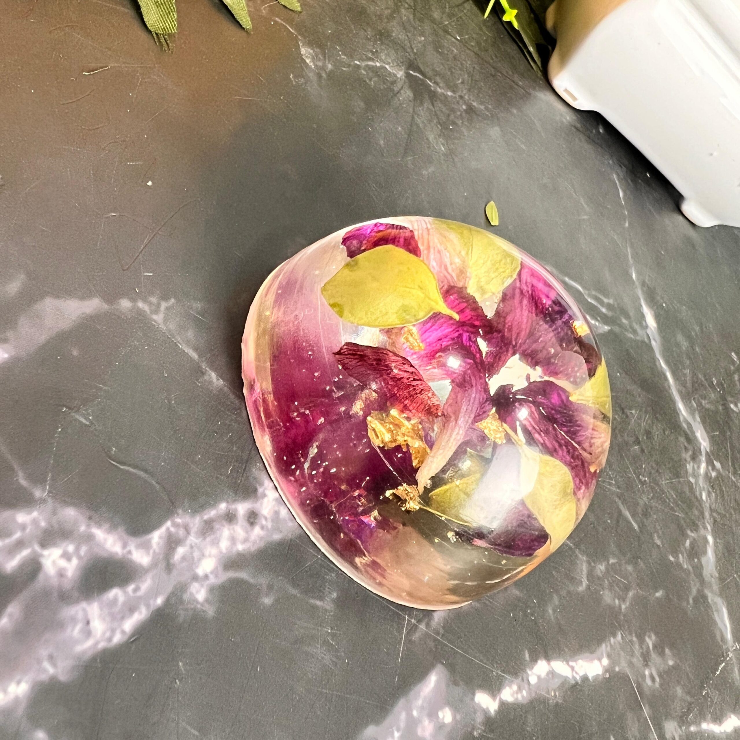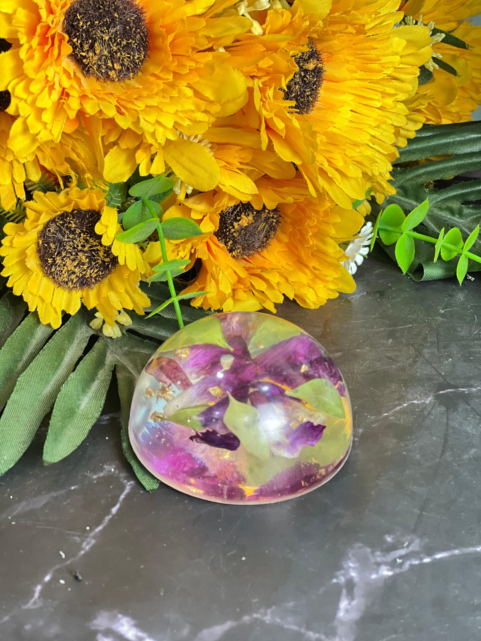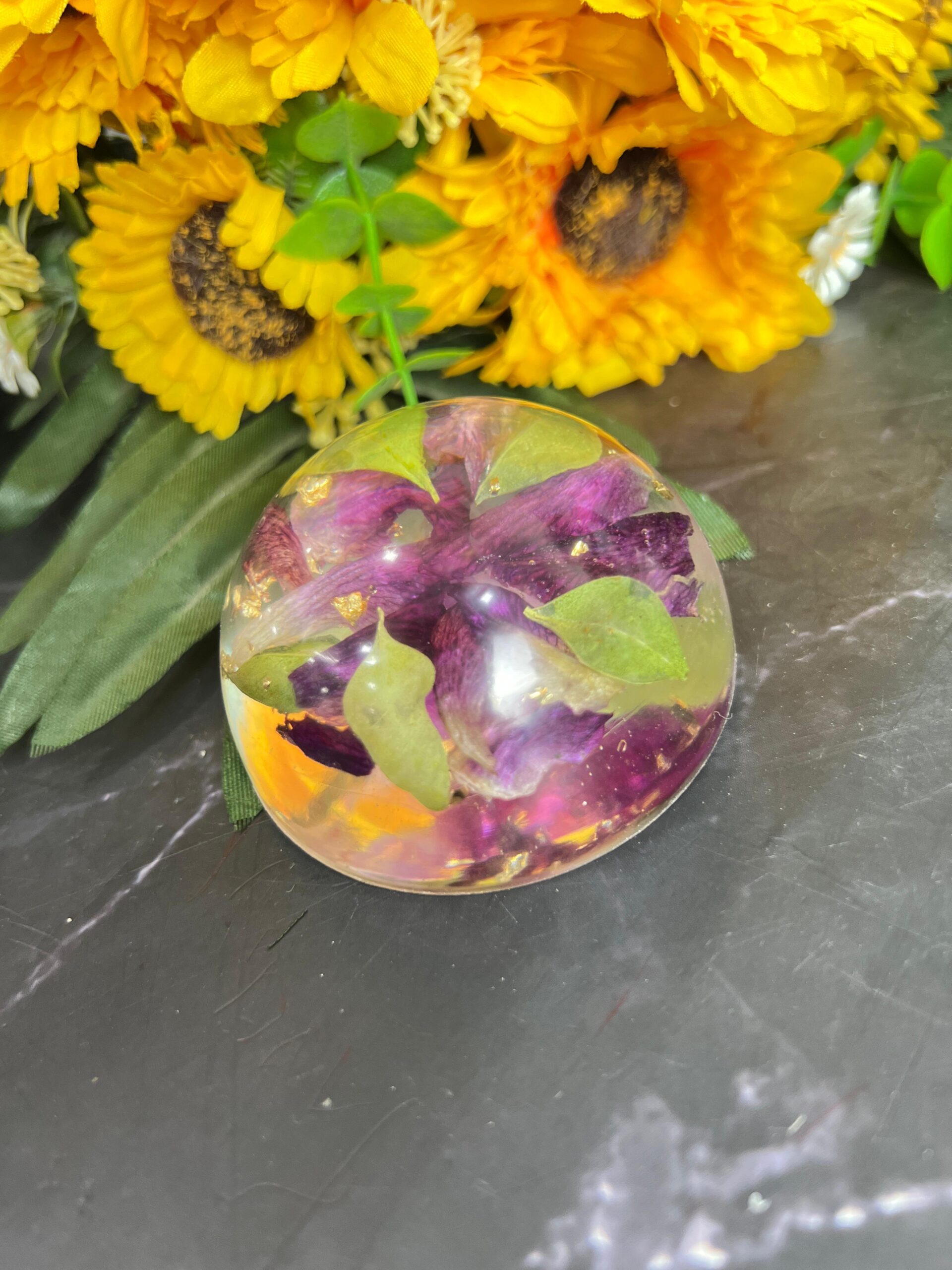 This resin paperweight is a lovely mix of beauty and function. Made with real flower petals and shiny gold flakes, it’s shaped like a soft dome that sits perfectly on books or papers. The flowers inside are sealed forever, giving you a piece of nature and memory on your desk.