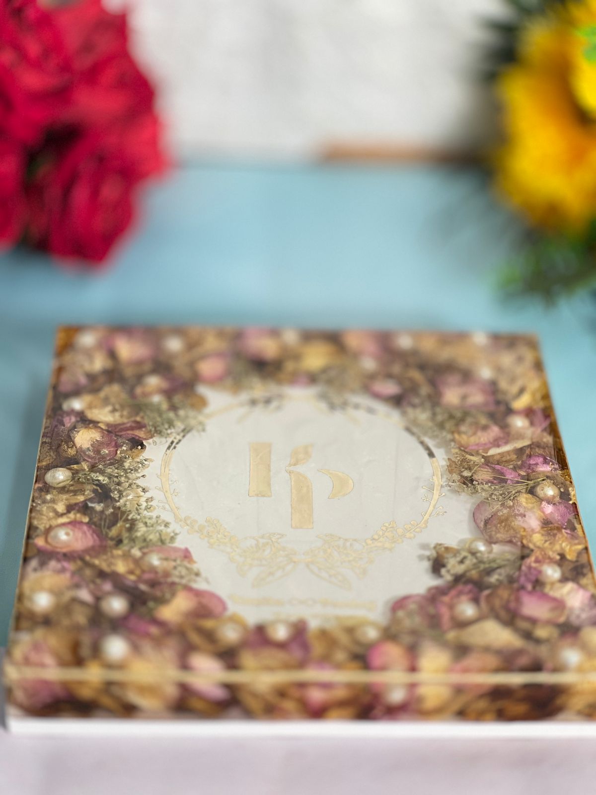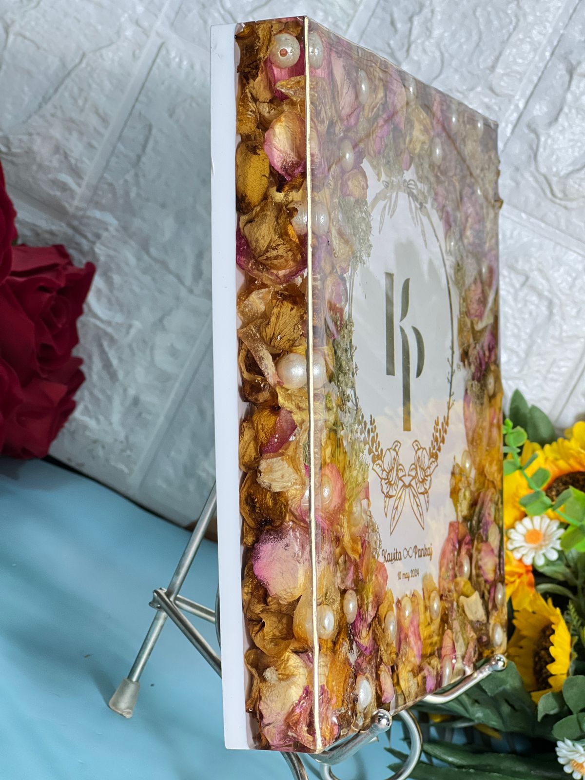 Product Description: The Wedding Flower Souvenir Preservation Frame (8 inch) is a unique way to preserve your wedding flowers in a decorative and meaningful manner. Featuring a beautiful combination of yellow and red petals, this keepsake is accented with motti (pearls) for an elegant finish. Customized with your names and logo, the souvenir is displayed with a stylish metal stand and a lamp that brings warmth and light to your cherished memories. This square-shaped keepsake is not only a tribute to your wedding flowers but also a piece of art that adds charm to any space. Features: