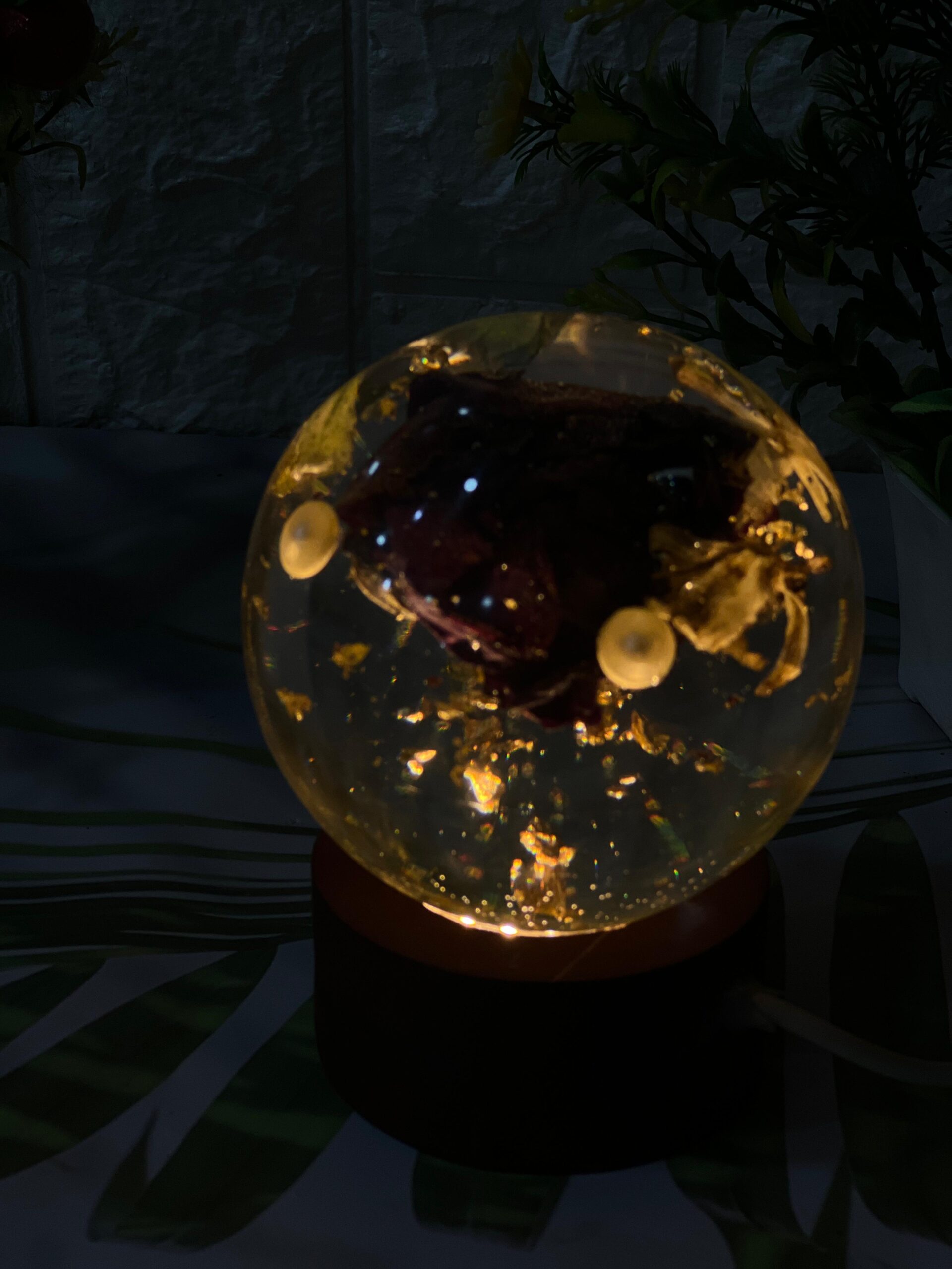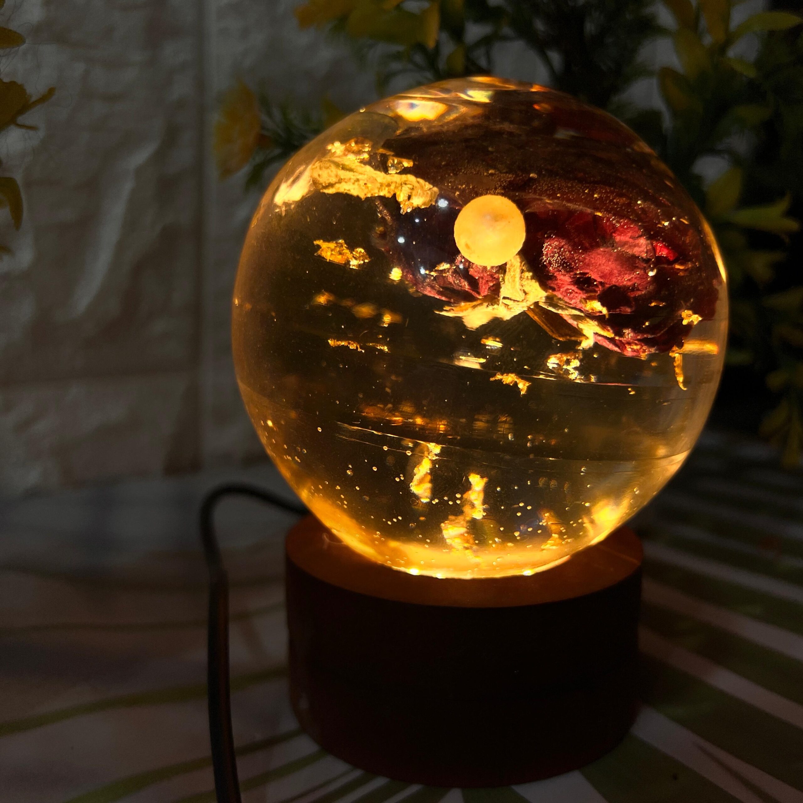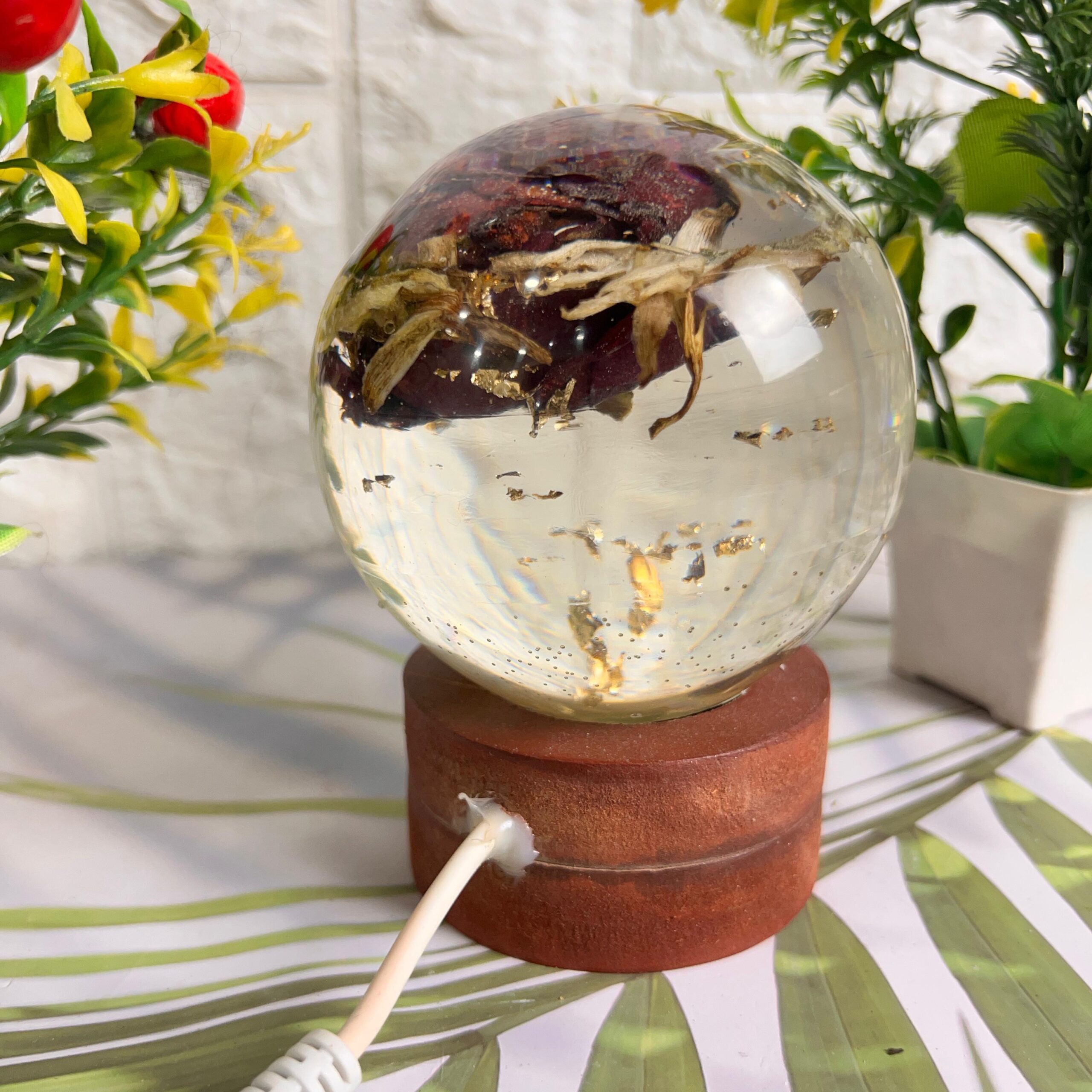 This beautiful resin globe is made using real varmala flower petals and shiny golden flakes. The petals are carefully preserved forever inside crystal-clear resin, giving it a rich and glowing look. When the light is on, it creates a magical warm glow that highlights each detail of the flower. The globe sits on a wooden LED base that adds charm and makes it perfect for display.