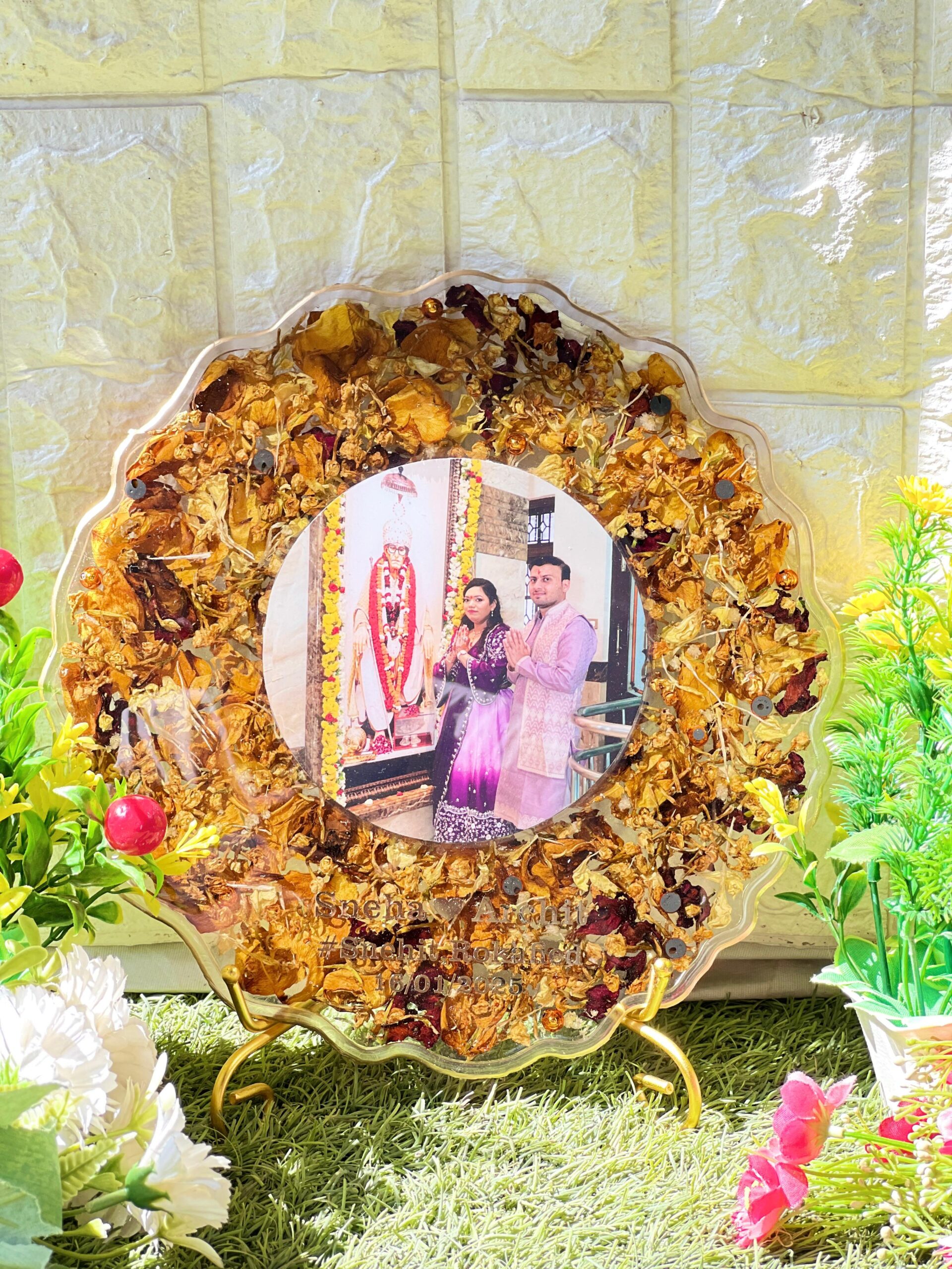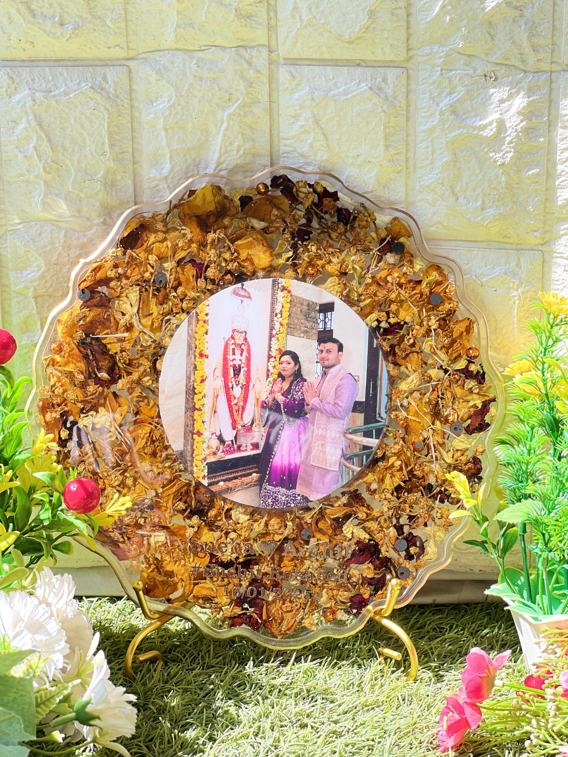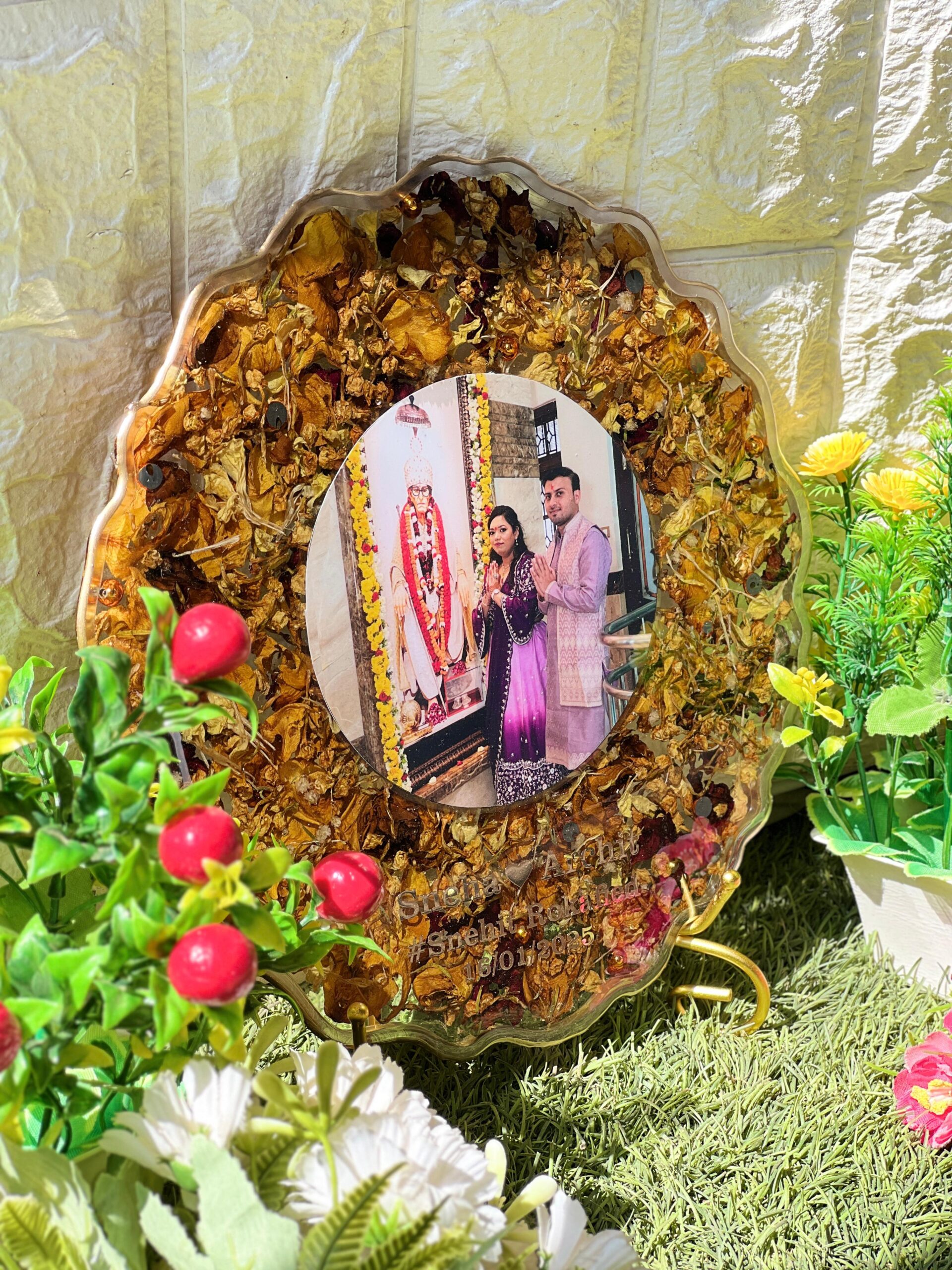 This Resin Mandir Varmala Photo Frame is a stunning memory piece made with real mandir garland petals and your favorite photo. The designer floral wave edges give it a divine and festive feel. It is made using clear epoxy resin to keep your sacred wedding moment fresh forever.