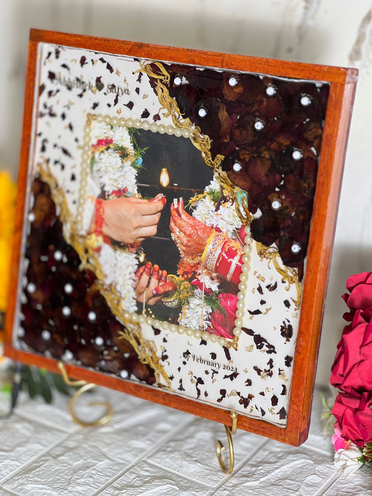 Product Description: Preserve your wedding memories in a beautiful and timeless way with this Teakwood Square-Shaped Varmala Preservation Photo Frame. Crafted with high-quality teakwood, this 12×12 inch frame is designed to keep your varmala, along with any other wedding ornaments like kaliras or wedding cards, safe and vibrant. The frame features a deep-casting design, which is perfect for showcasing your precious wedding items in a unique and stylish way. The LED lights around the frame add a warm, soft glow, making your wedding keepsake even more special. Features: