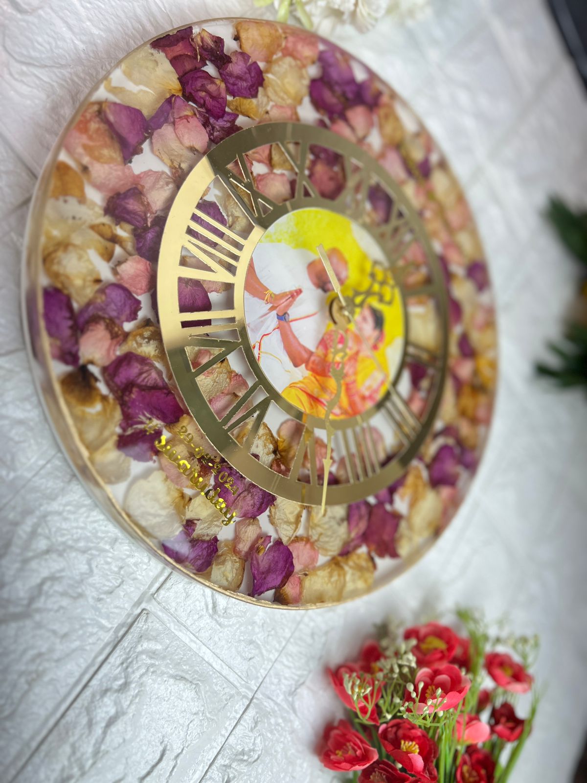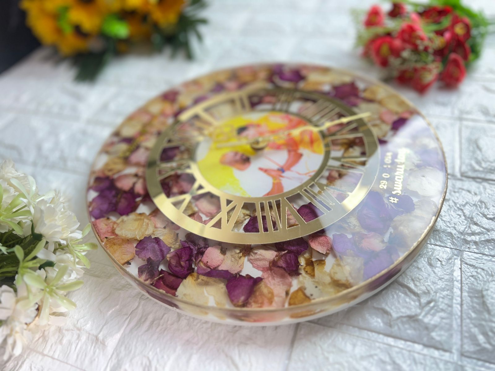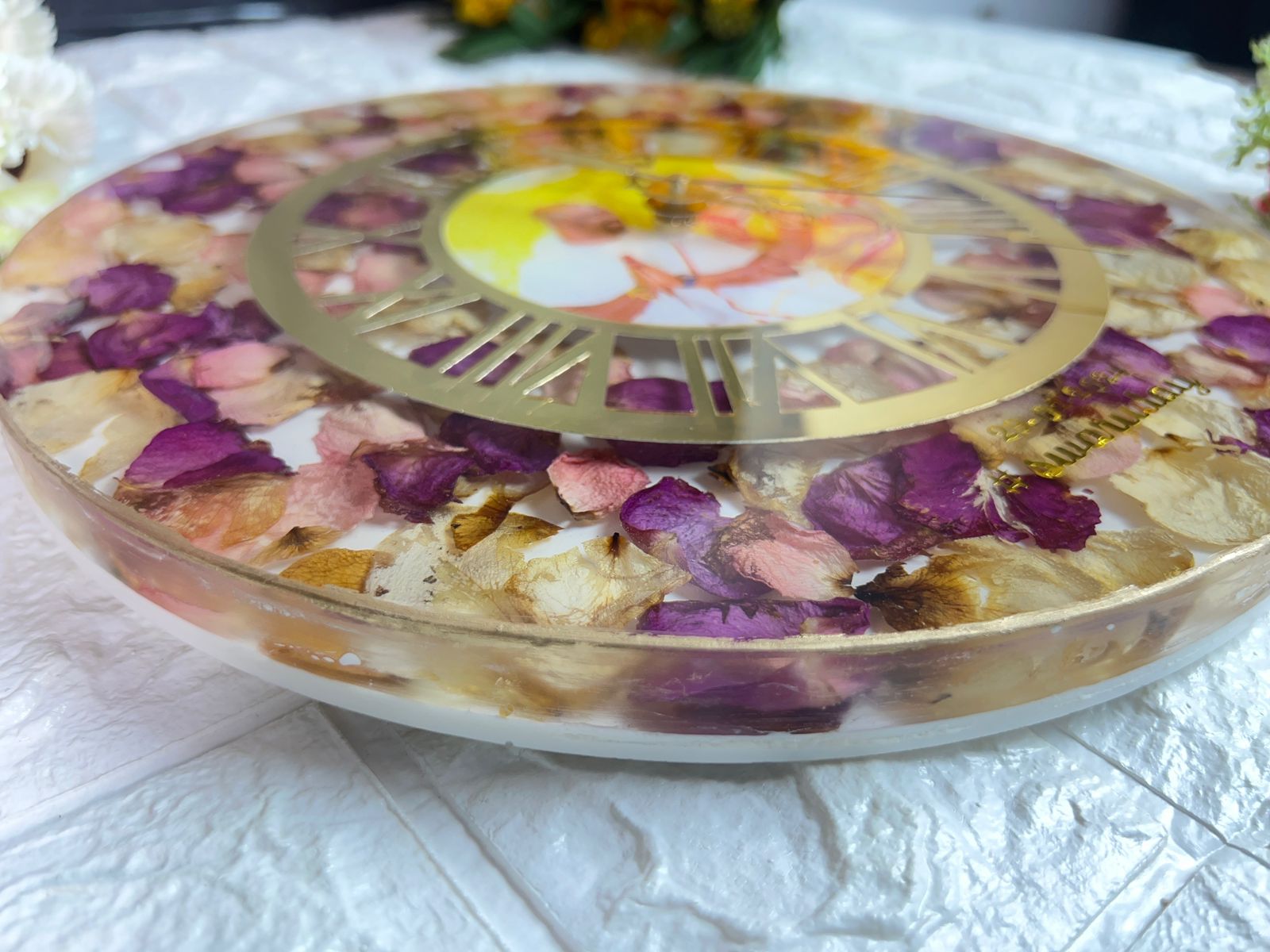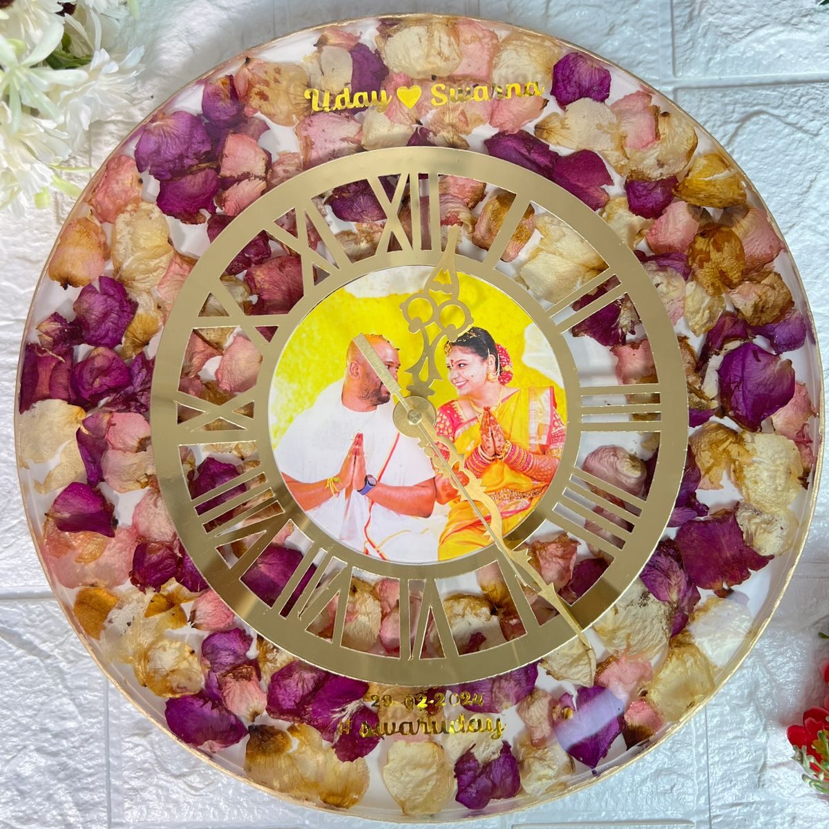 Product Description: Preserve the essence of your wedding day with the Round Shape Reminiscent Epoxy Wedding Varmala Art (12 inch). This beautiful keepsake features a pristine white base adorned with a delicate combination of petals, symbolizing purity and love. Personalized with your names and a unique hashtag, this piece is designed to capture the timeless beauty of your wedding garland. Expertly crafted using premium epoxy resin, it ensures long-lasting preservation and makes for a perfect addition to your home décor. Features:
