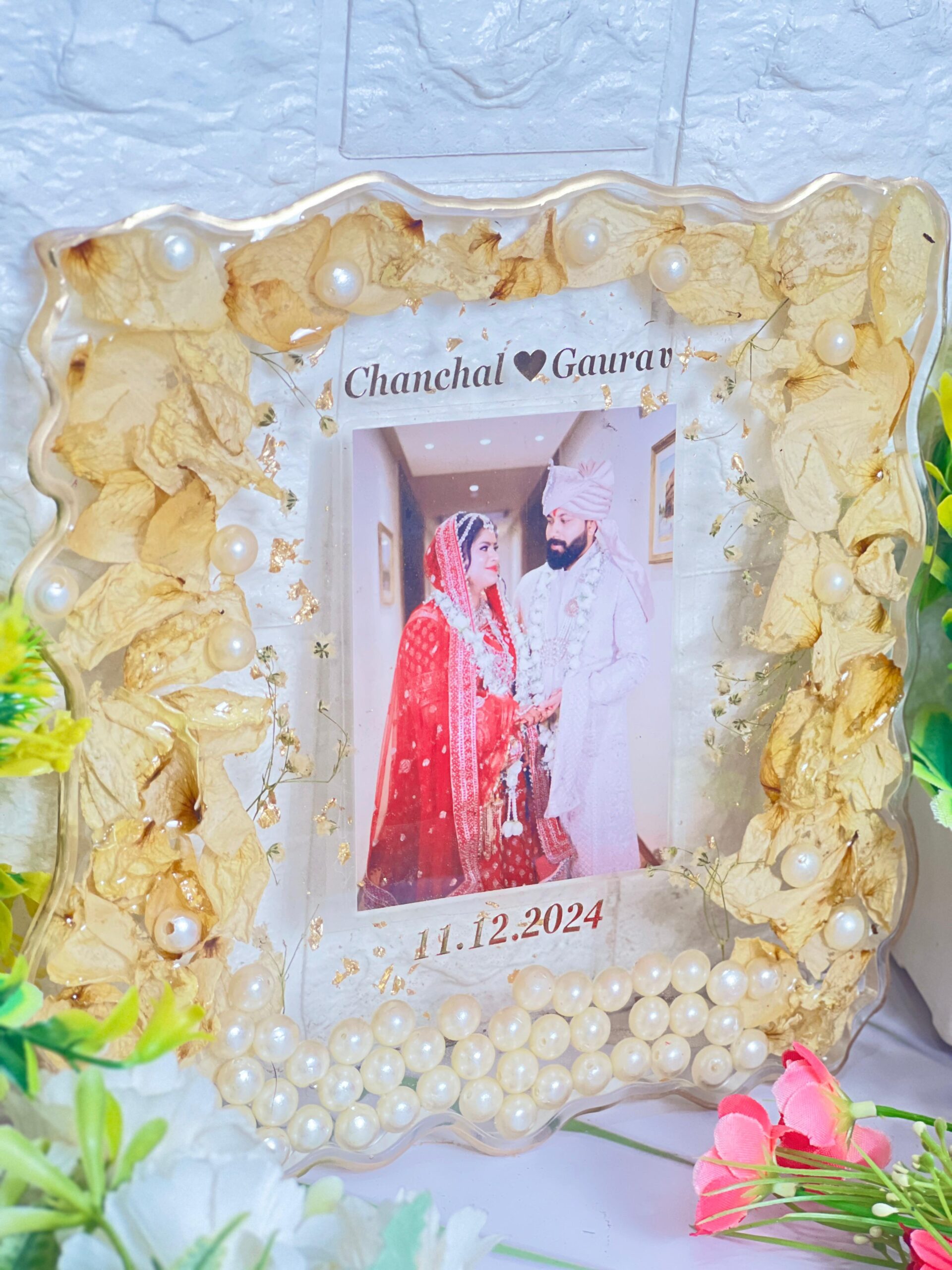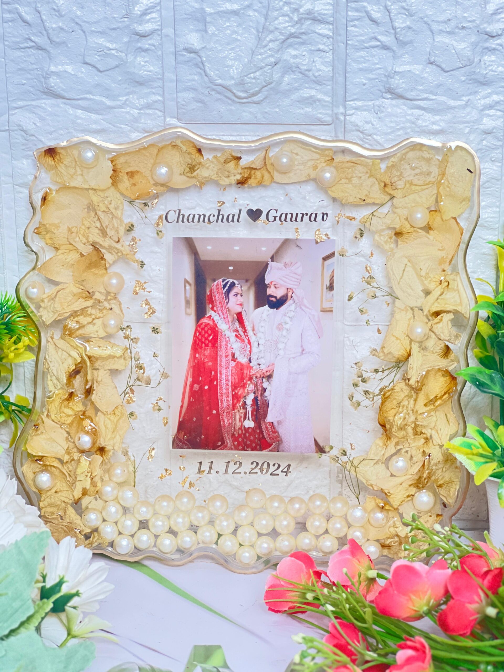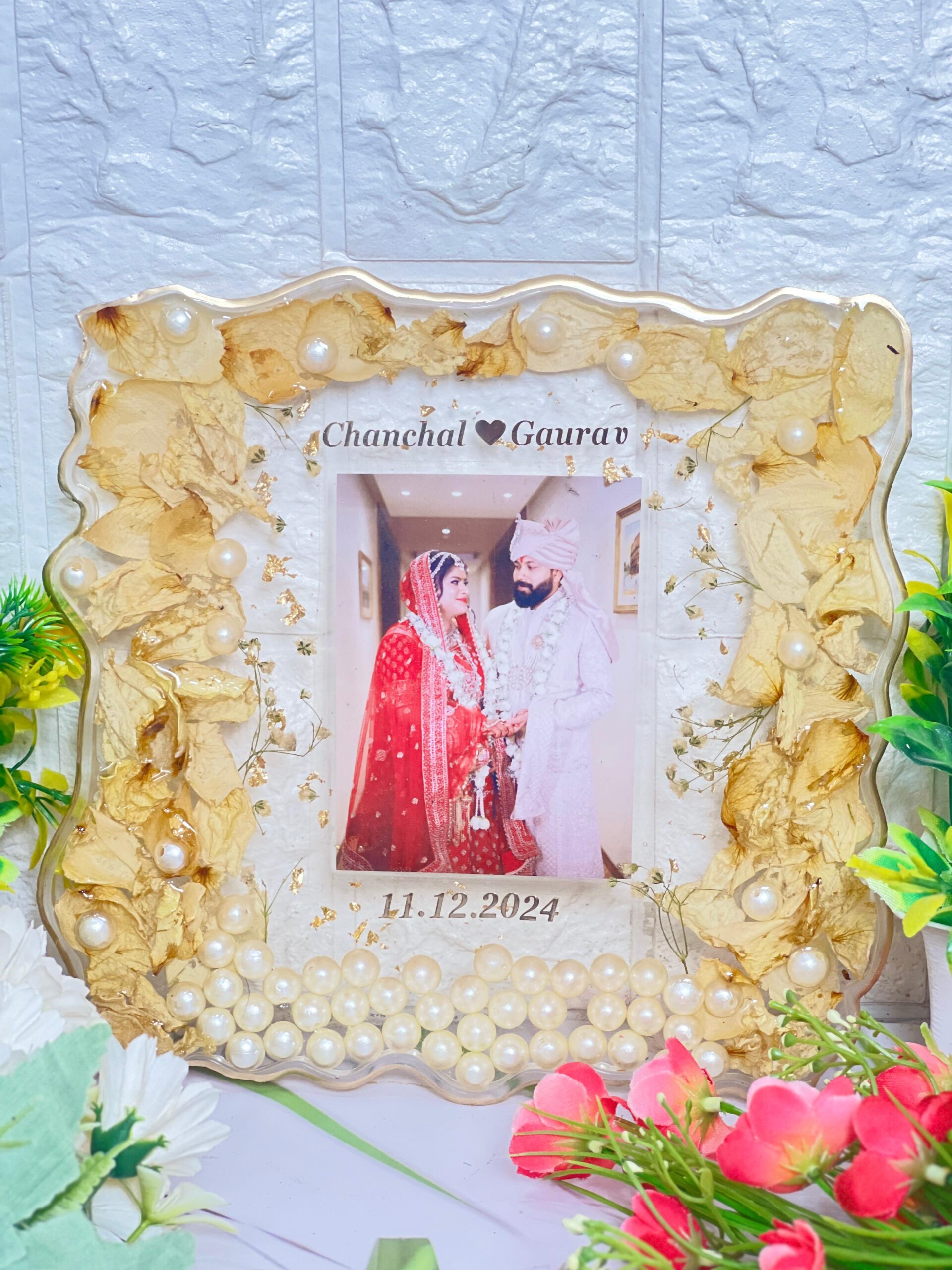 Capture your wedding memory in this beautiful Resin Wedding Photo Frame in Curve Shape with Golden Petals & Pearls. This custom resin frame features a unique wave-shaped border filled with real golden flowers, white pearls, and gold foil flakes.