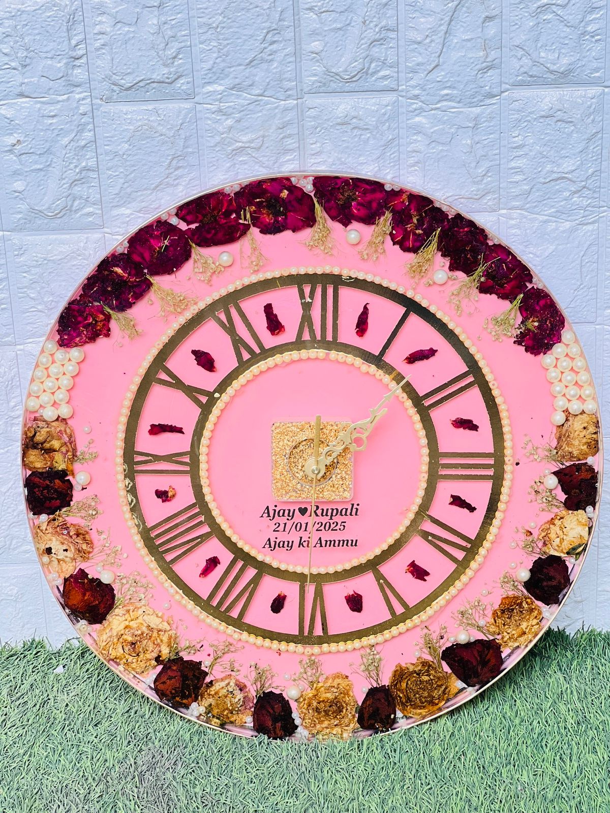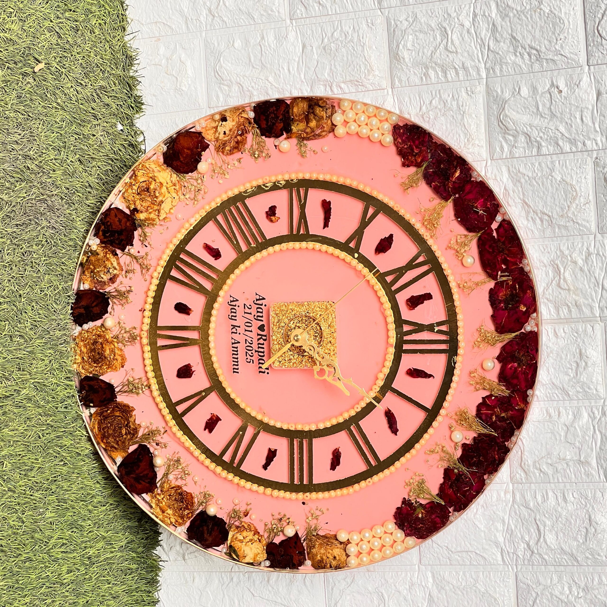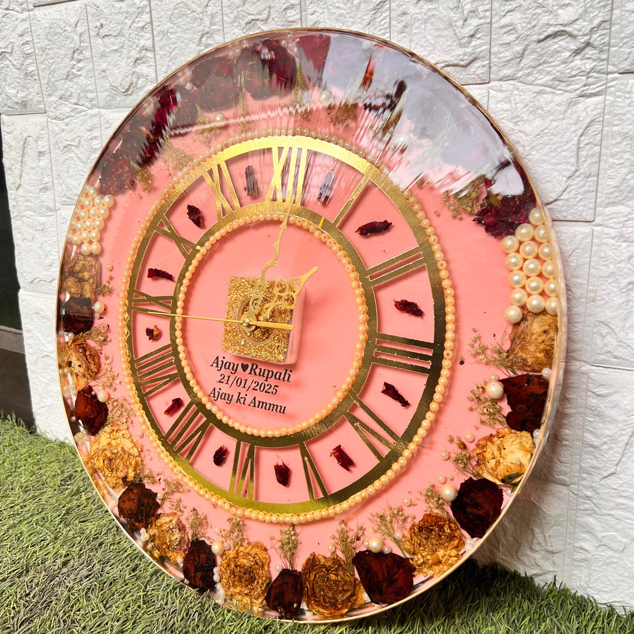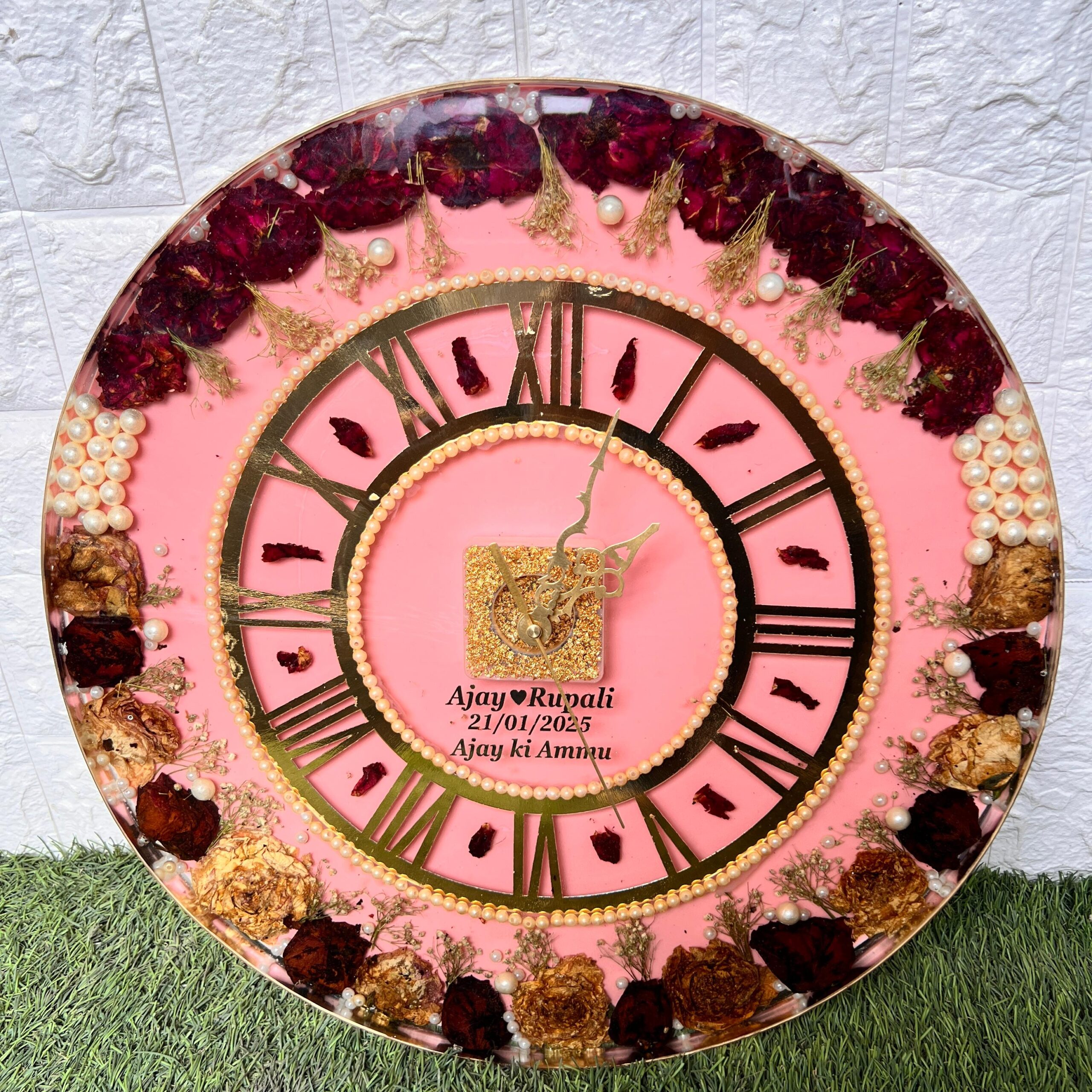 Turn your wedding varmala into something you’ll see every day—a beautiful (18)-inch resin wall clock. This clock isn’t just for time; it’s a memory. Decorated with real varmala roses and gold pearls, this handcrafted piece keeps your wedding close to your heart.