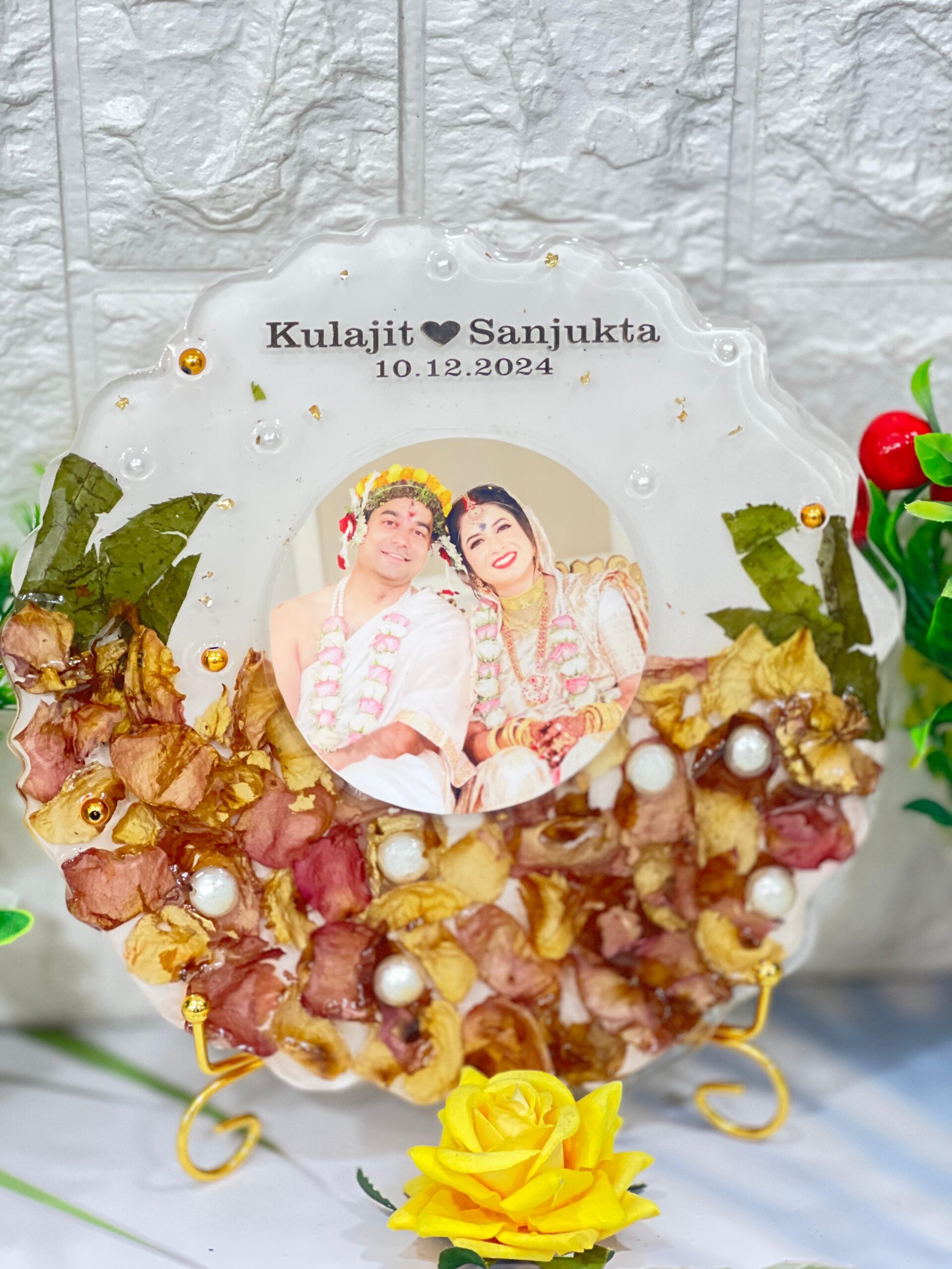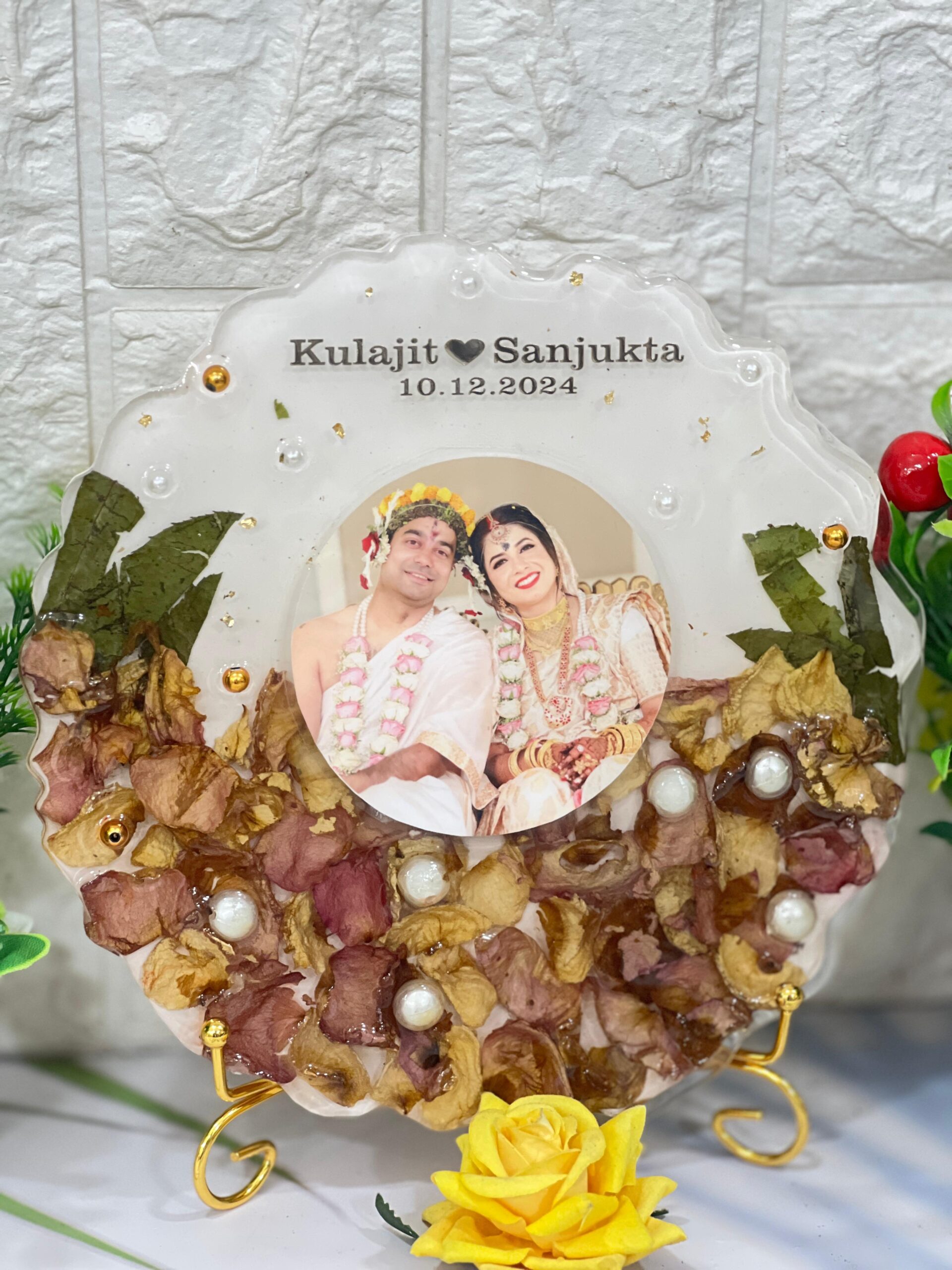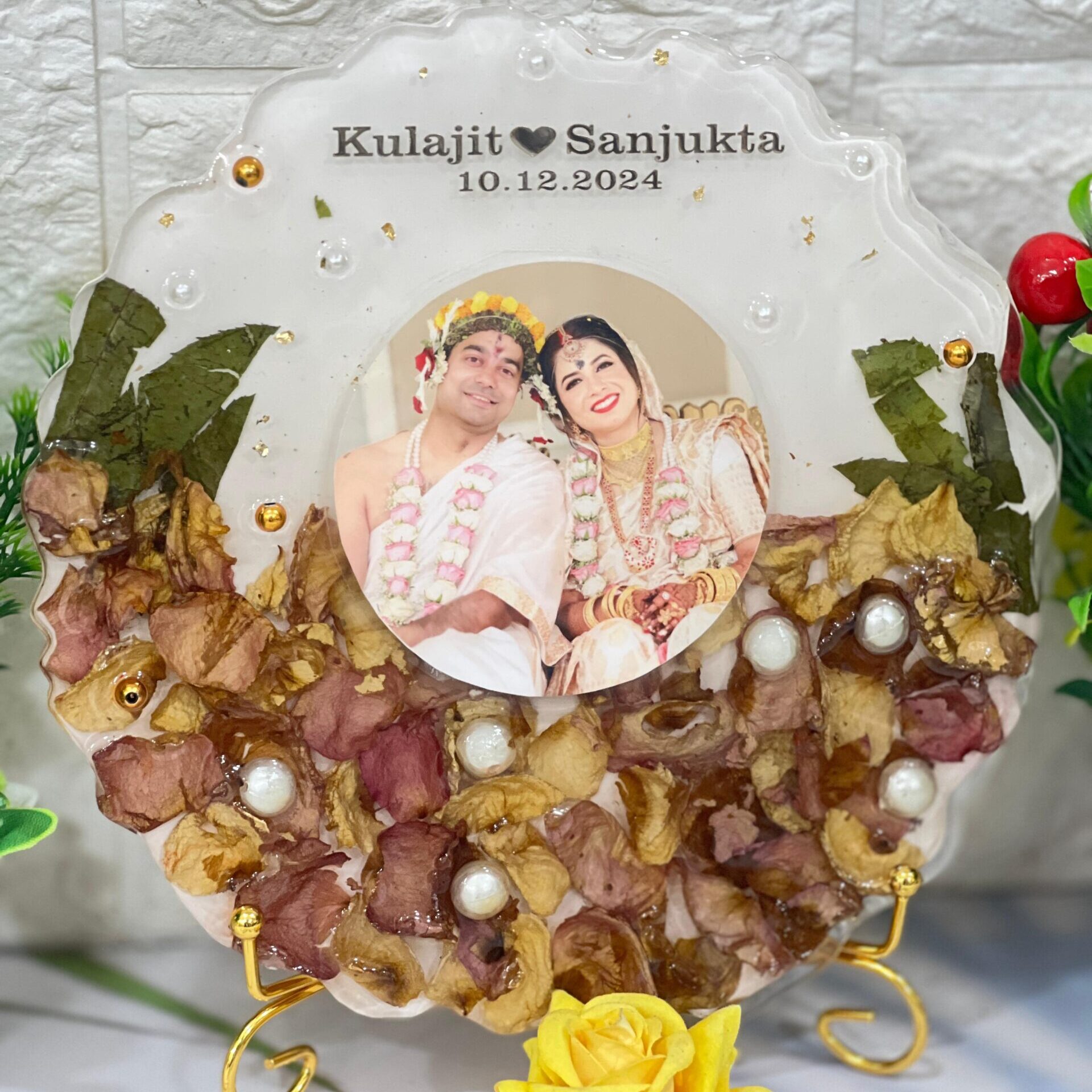 Celebrate your wedding forever with this beautiful Resin Wedding Varmala Photo Frame. This round-shaped frame is made from clear epoxy resin and holds real preserved varmala petals and wedding memories. The center features a custom photo with your names and wedding date on top. Each frame is fully customizable and includes pearl decorations, golden beads, and natural leaves, giving it an elegant and rich look.