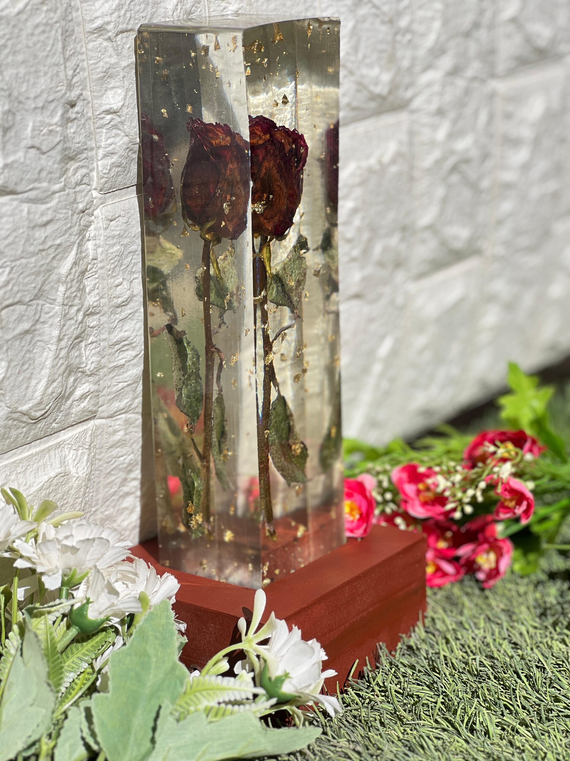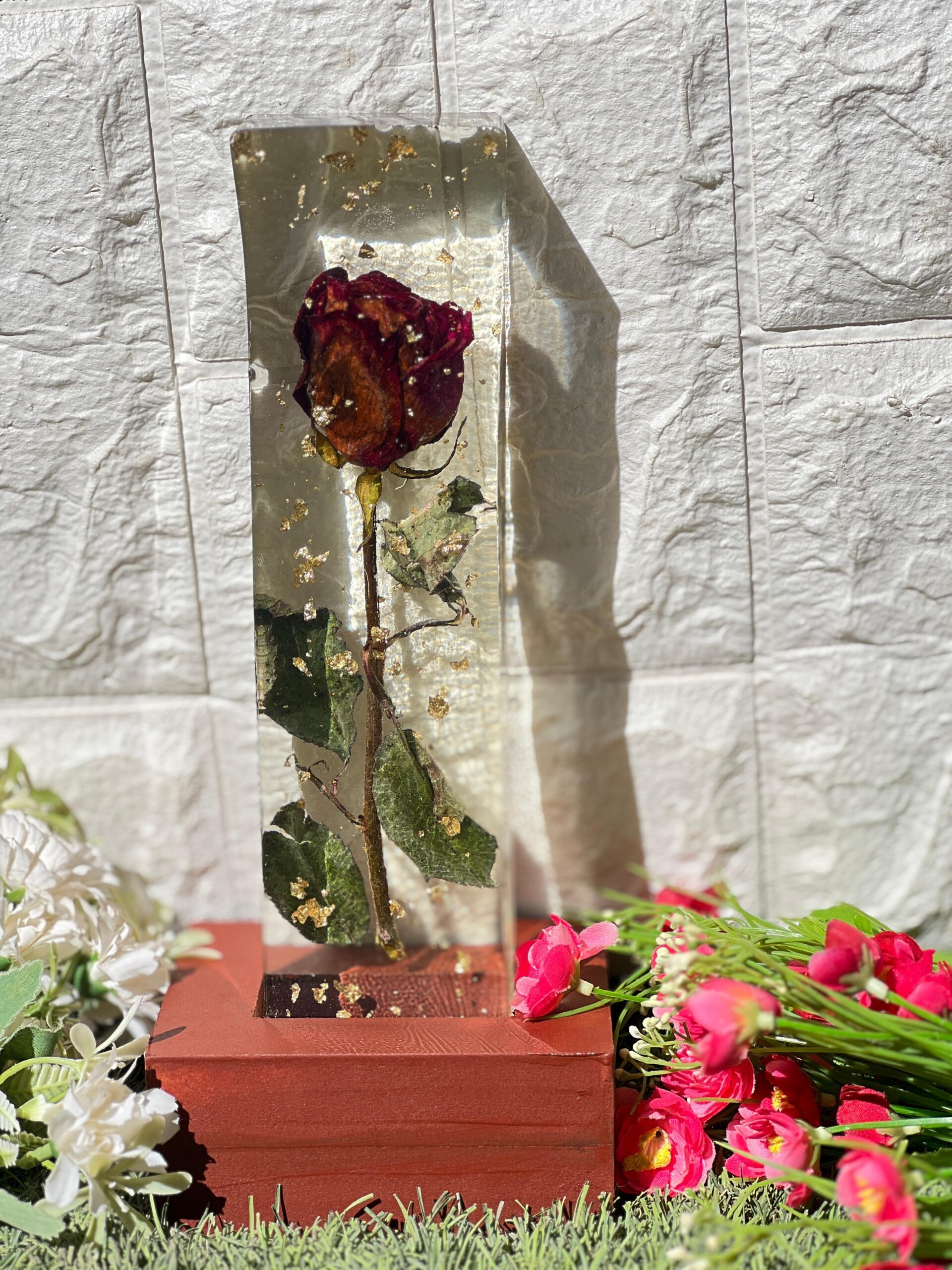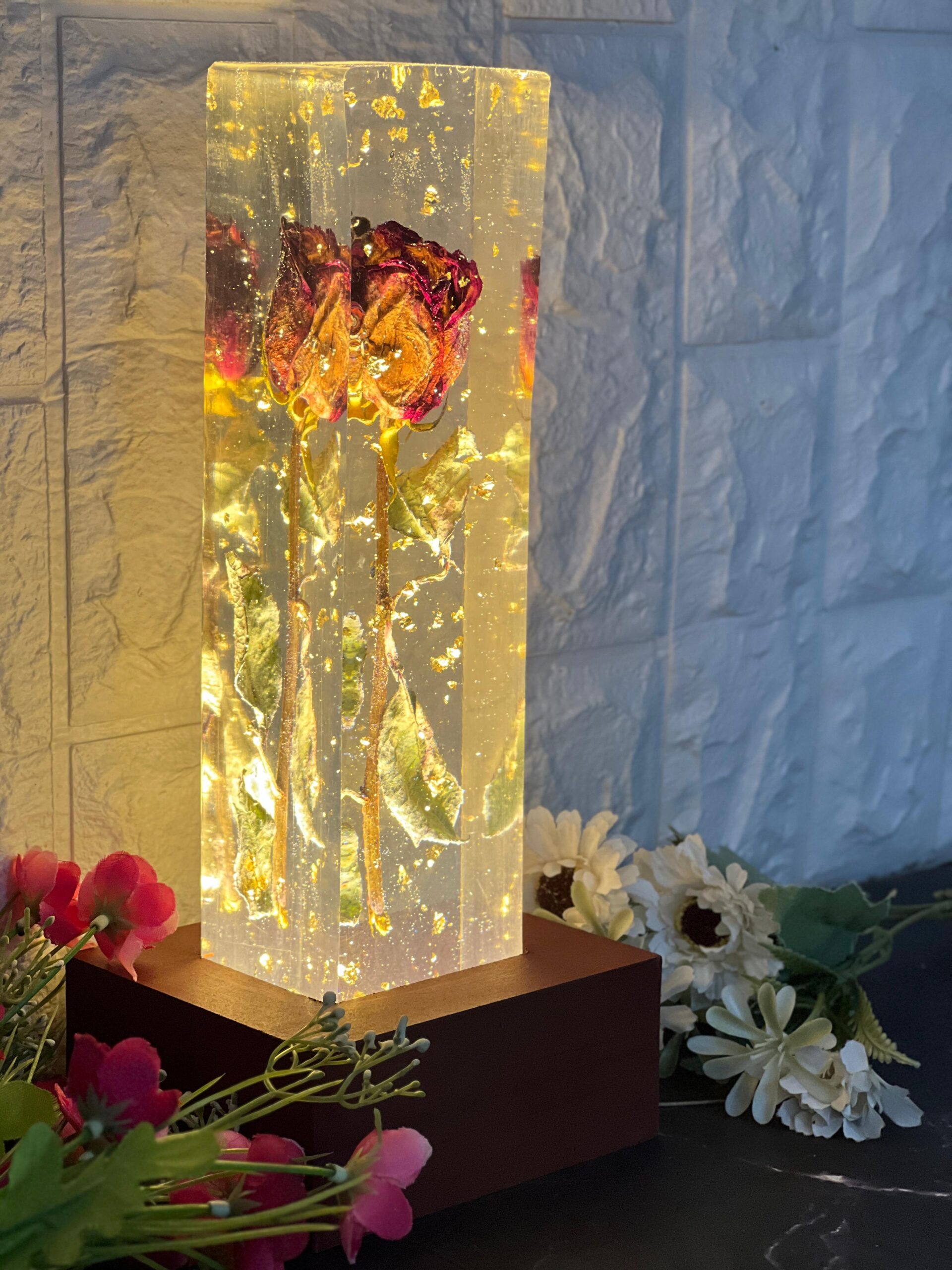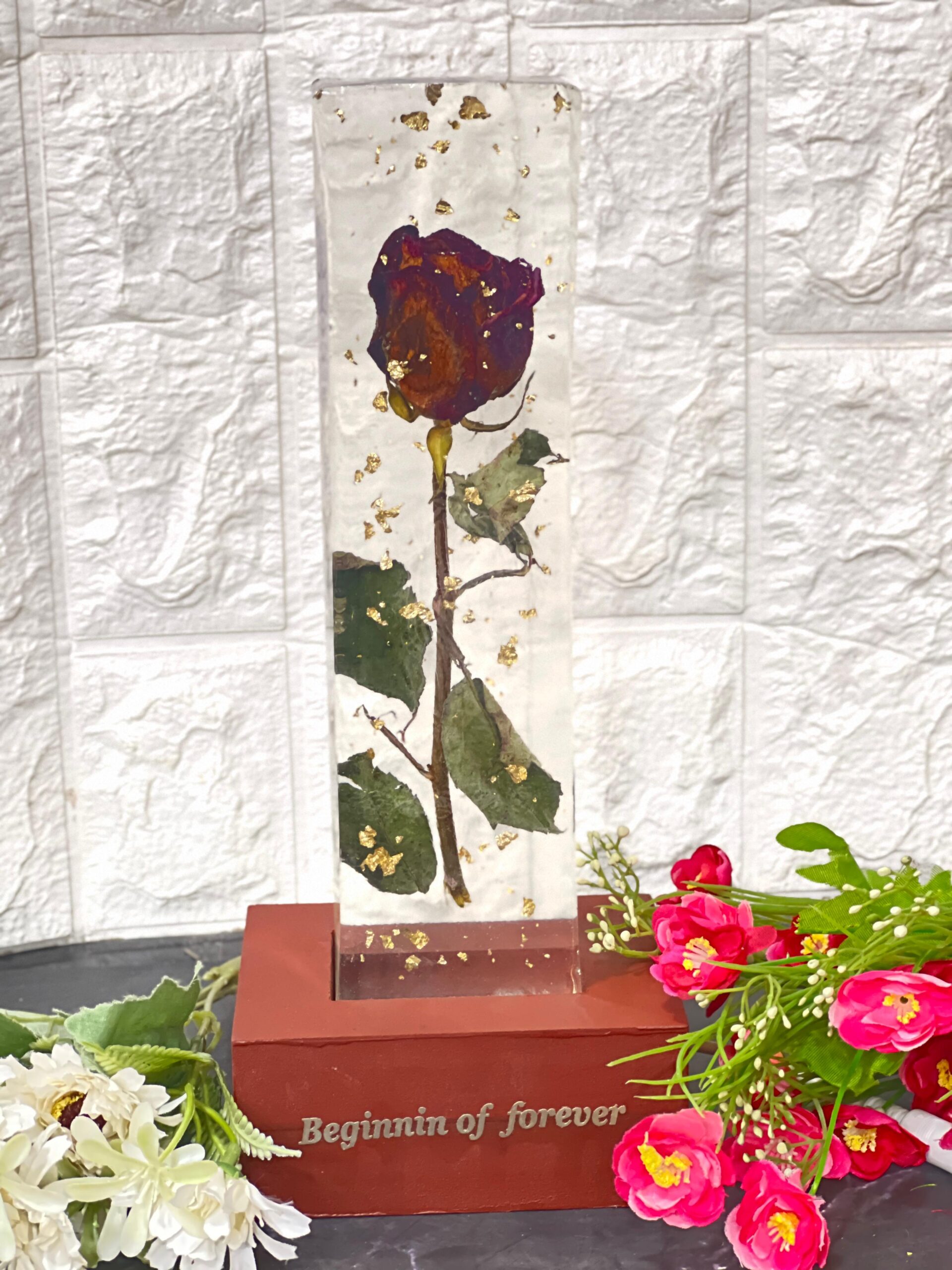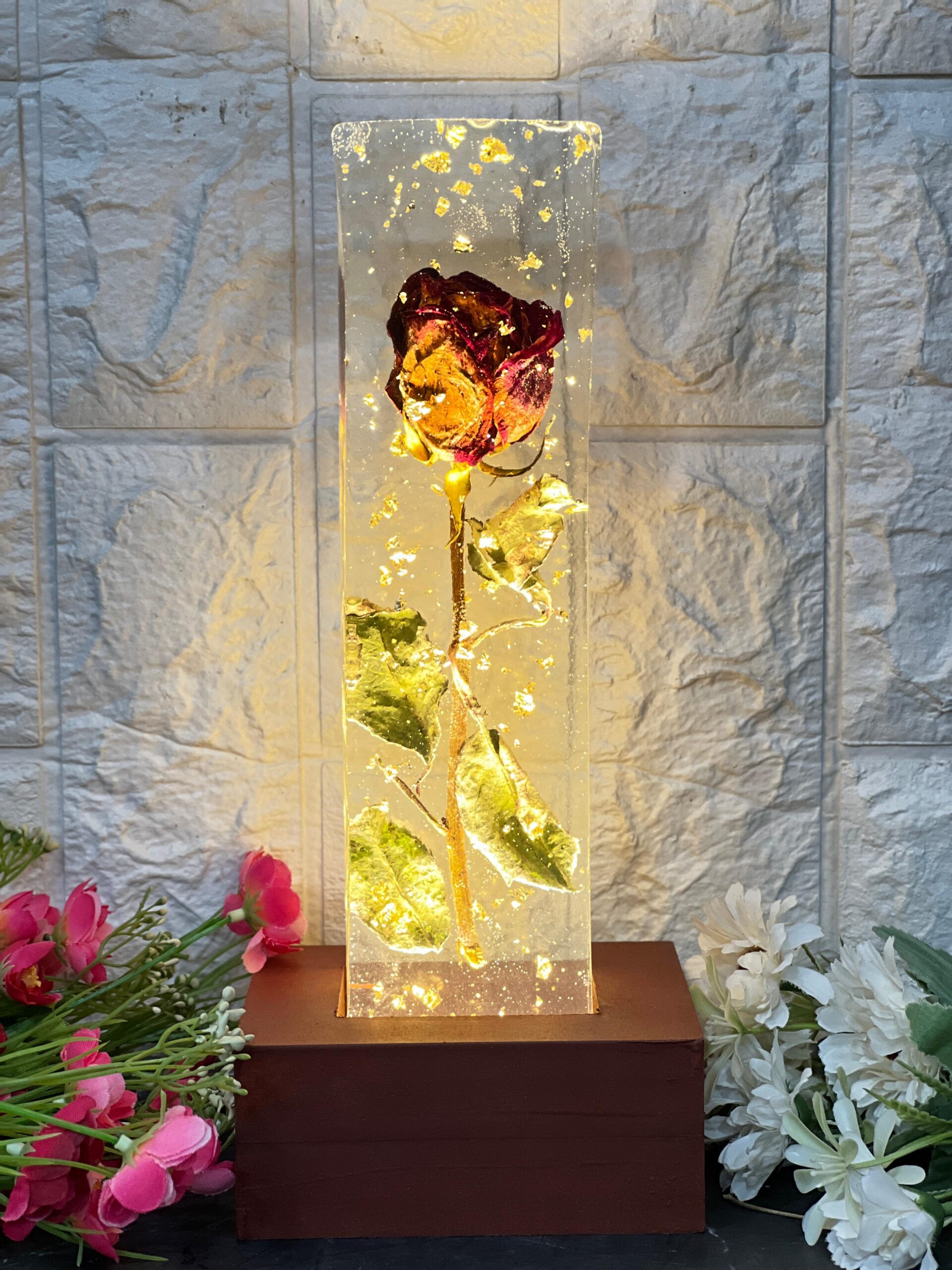 Keep your special rose forever with this Rose Preserved Resin LED Frame. This beautiful gift holds a real dried rose with leaves inside a clear resin block. Gold flakes are added for a luxury feel. The wooden base has a light that makes the rose glow warmly, perfect for romantic and emotional moments.