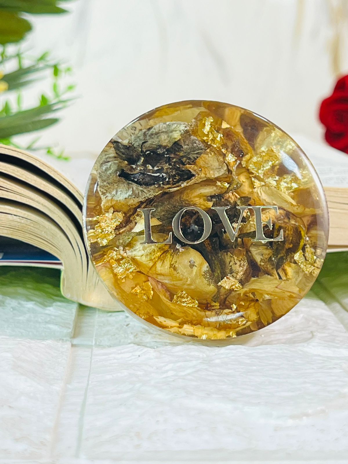 Preserve your precious memories with the Round Deep Casting Resin Paperweight with a Preserved Single Rose. This stunning keepsake features a real rose, carefully preserved in clear resin, creating a beautiful display that lasts a lifetime. Whether it’s a flower from your wedding, varmala, or any other special occasion, this paperweight turns your favorite bloom into a timeless reminder of your cherished moments. The round shape gives the paperweight a modern, elegant look, making it not only functional as a paperweight but also a unique piece of décor for your desk, living room, or anywhere you wish to keep your memories close. It’s a heartfelt and meaningful gift for any special occasion or milestone, ensuring that your memories are forever preserved in an elegant form.