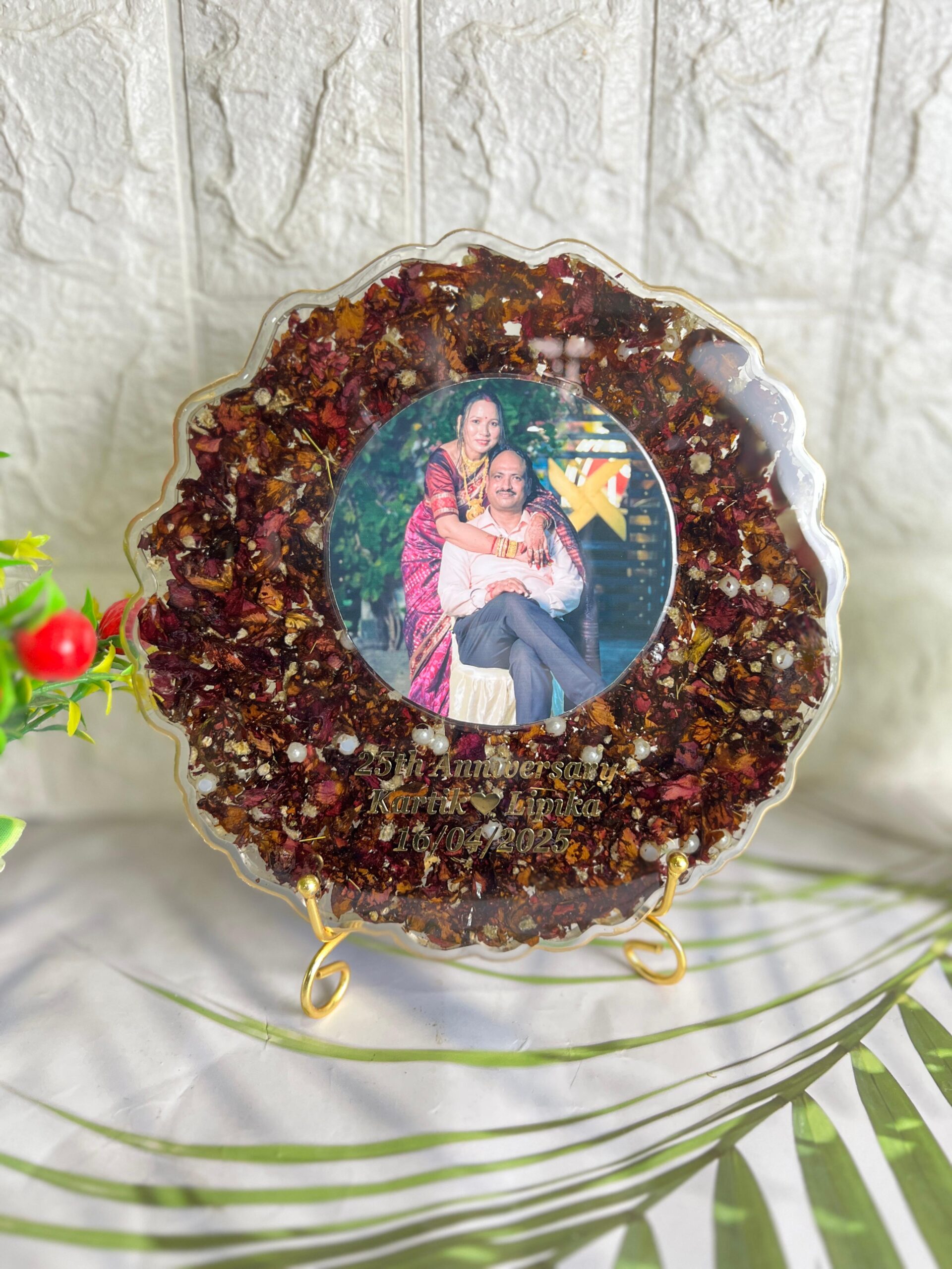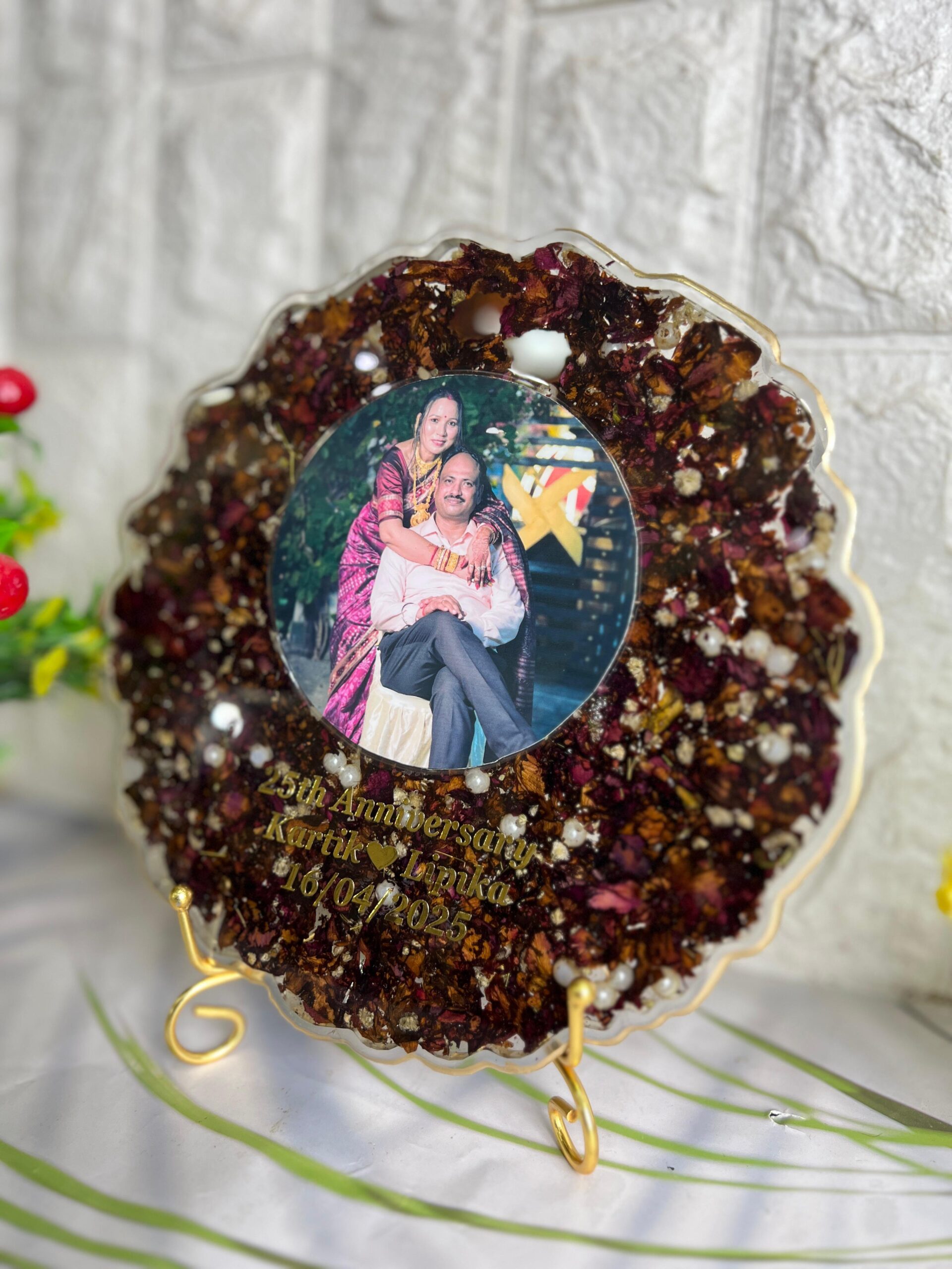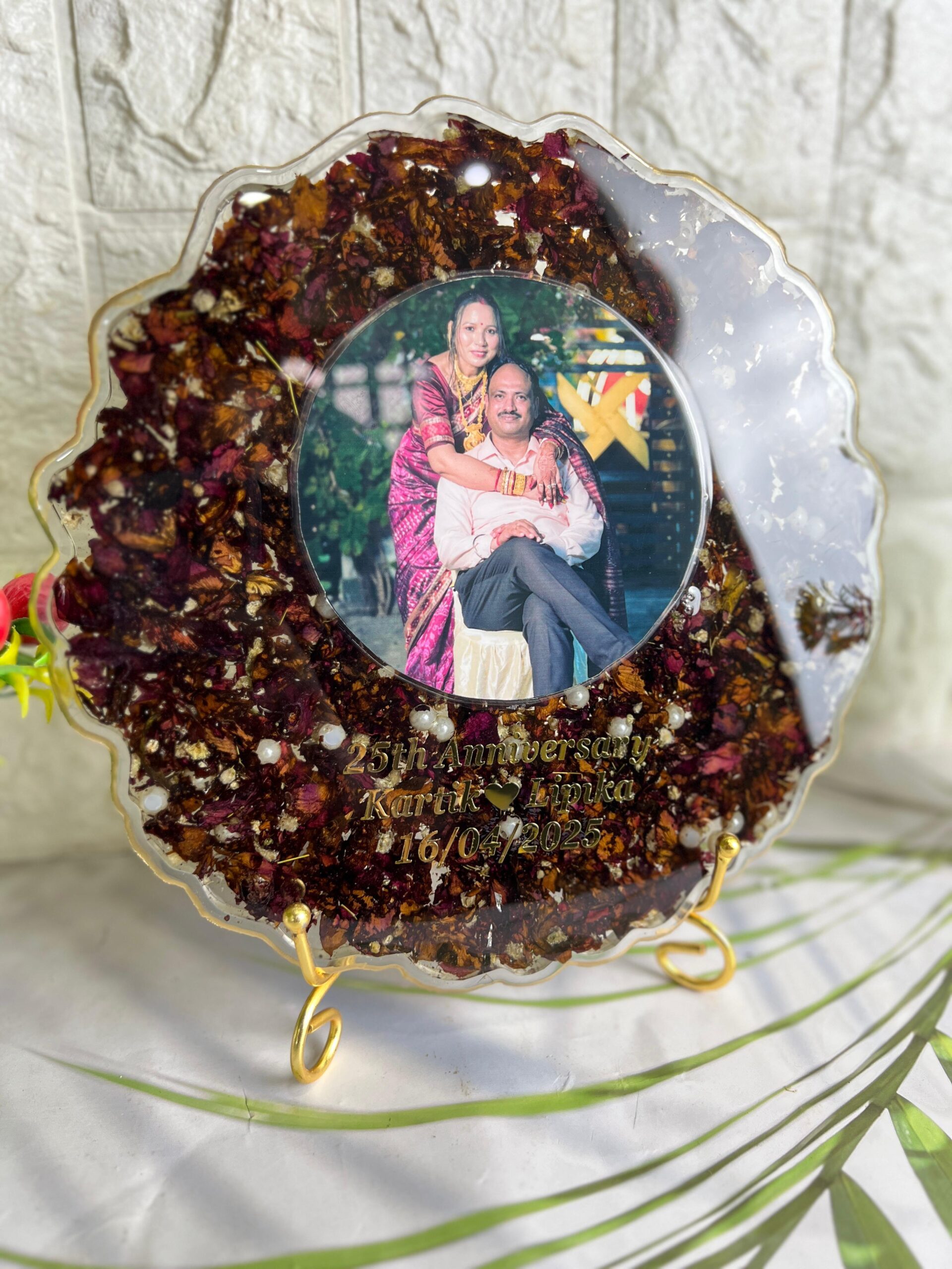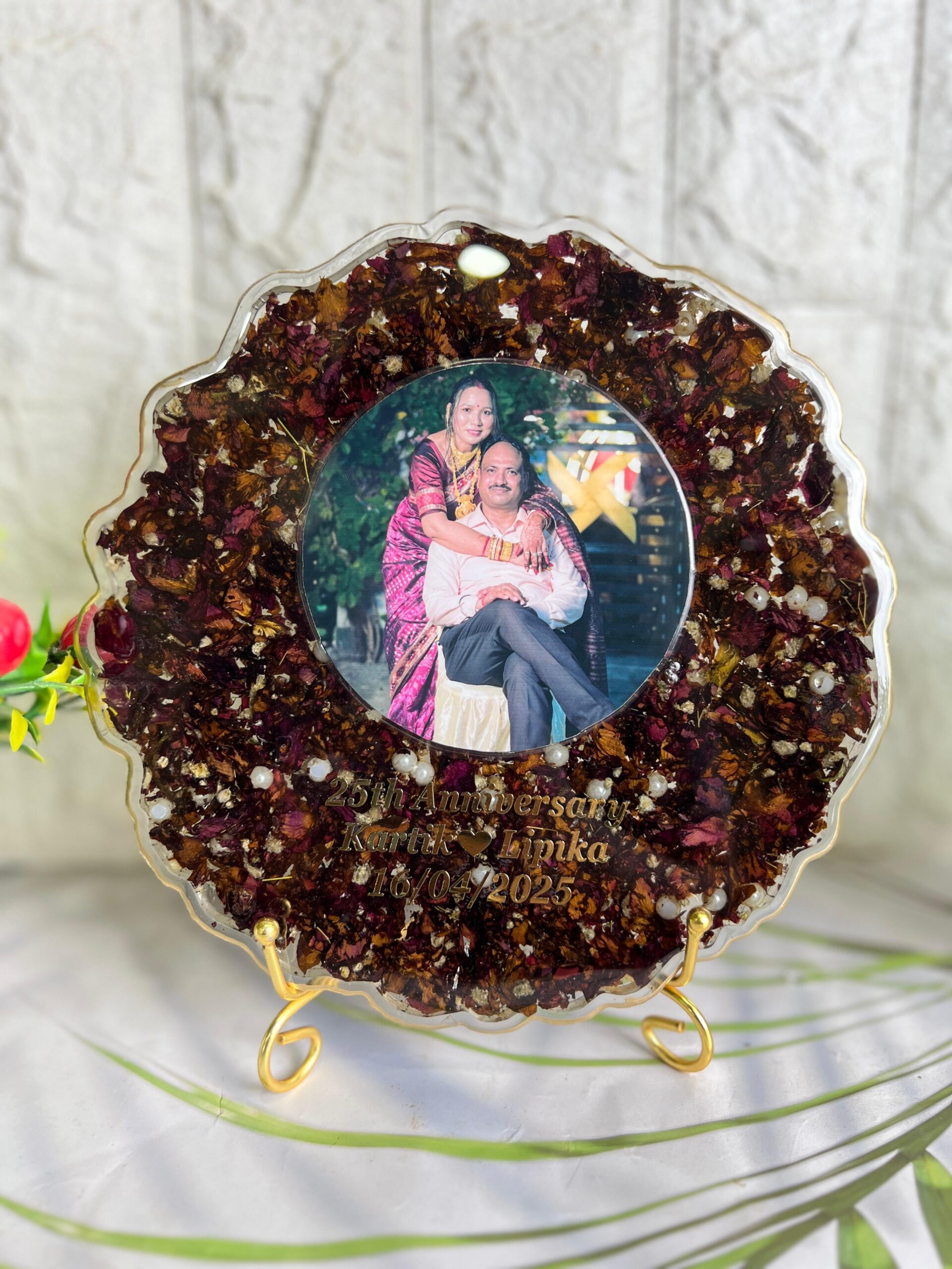 Celebrate a beautiful milestone with this Round Resin Anniversary Frame. Designed with love, this piece features a center couple photo, surrounded by real dried rose petals, golden flakes, and white pearls, all safely sealed inside clear, shining resin.