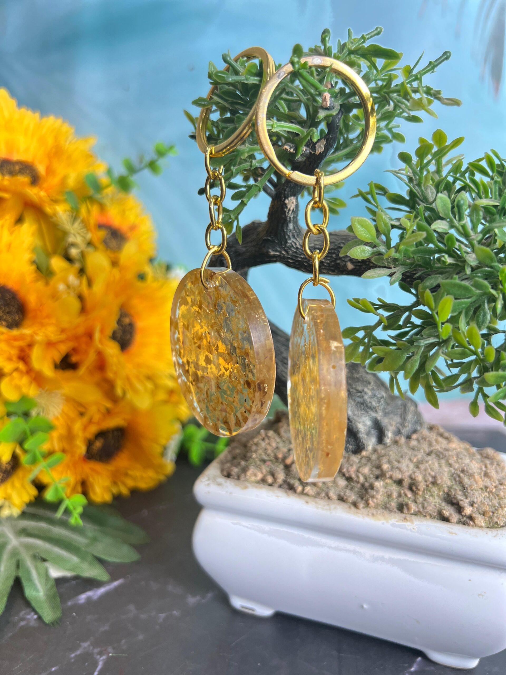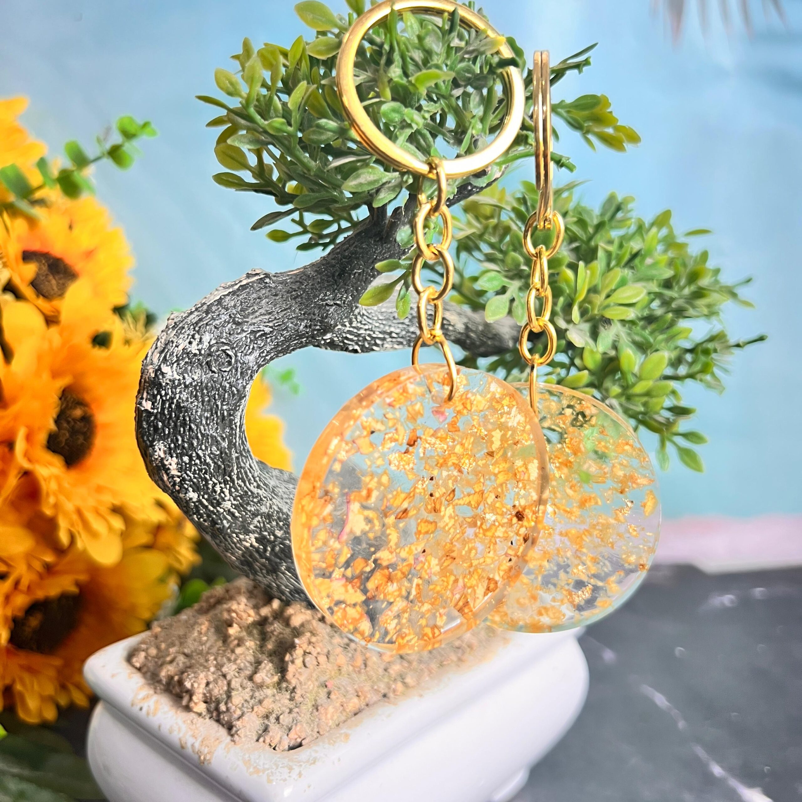 These round resin keychains are made with love using real dried golden flowers and gold flakes. The clear resin gives a glass-like shine, and the golden keyrings make them look rich and classy. Each keychain is handcrafted to keep the beauty of nature safe forever. It is lightweight, easy to carry, and strong enough for daily use. This is a perfect small gift for someone special or even for yourself.