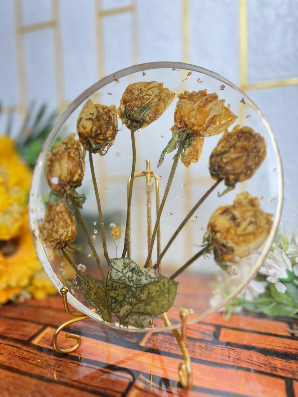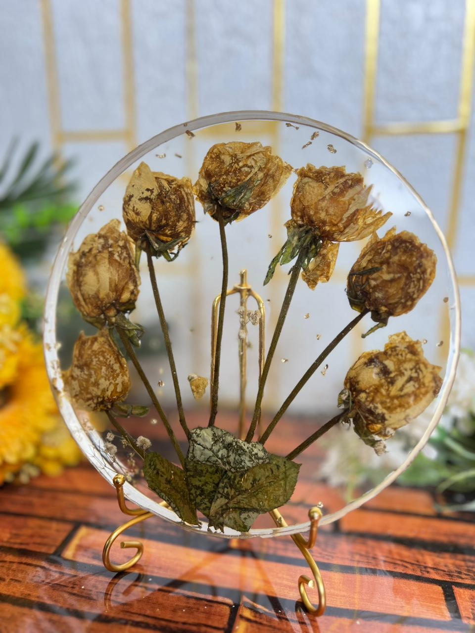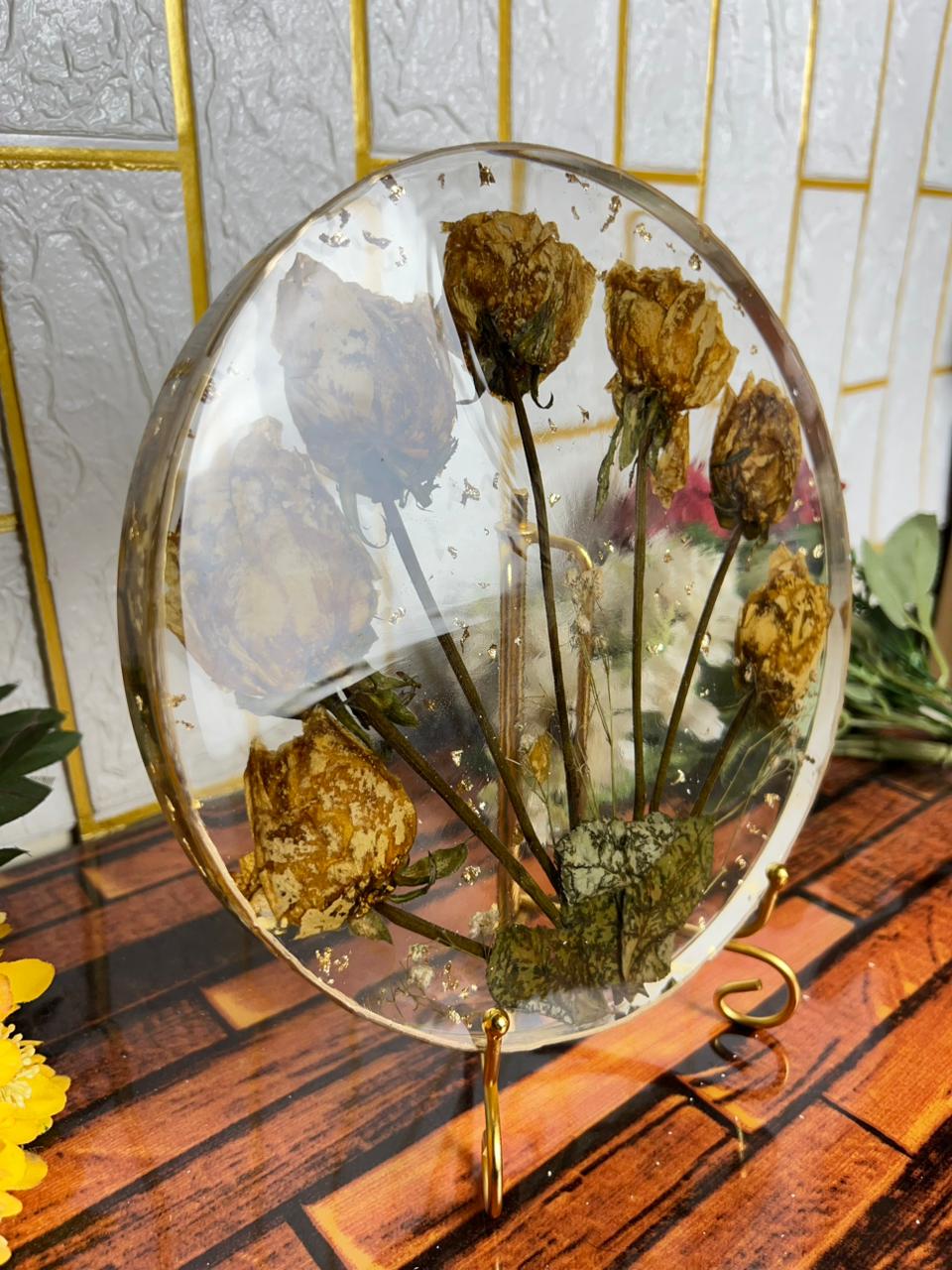This round resin flower frame keeps your varmala roses safe in a simple and clean way. Each rose is placed with care so the whole piece looks soft, natural, and full of emotions. The circle shape gives a calm and neat look that blends well in any room.