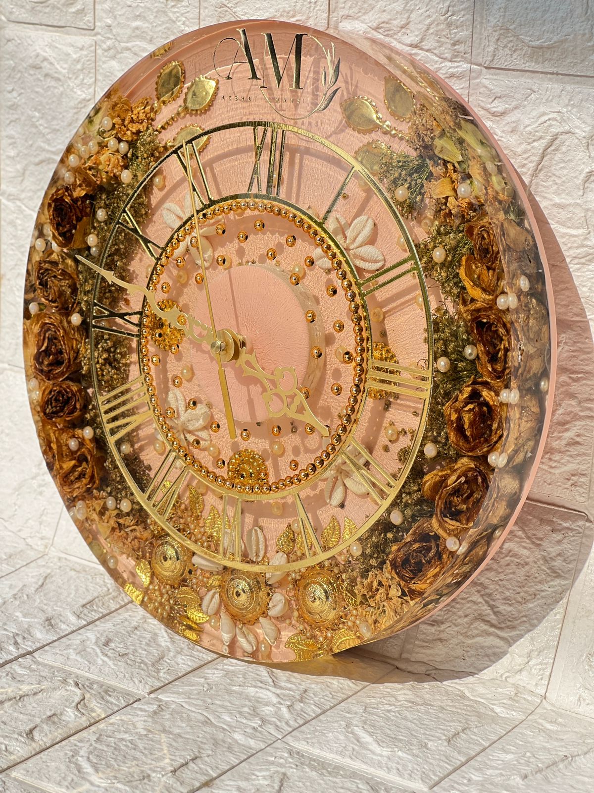 Product Description: This exquisite round deep casting clock is a unique way to celebrate your special moments. Featuring preserved wedding garland flowers, Kalira, and delicate white pearls, all encapsulated in high-quality resin, this clock is not only a functional timepiece but also a beautiful keepsake. The couple's names and logo are thoughtfully added, making it a perfect personalized gift to cherish for years to come. It’s a timeless piece that captures your love and wedding memories. Features: