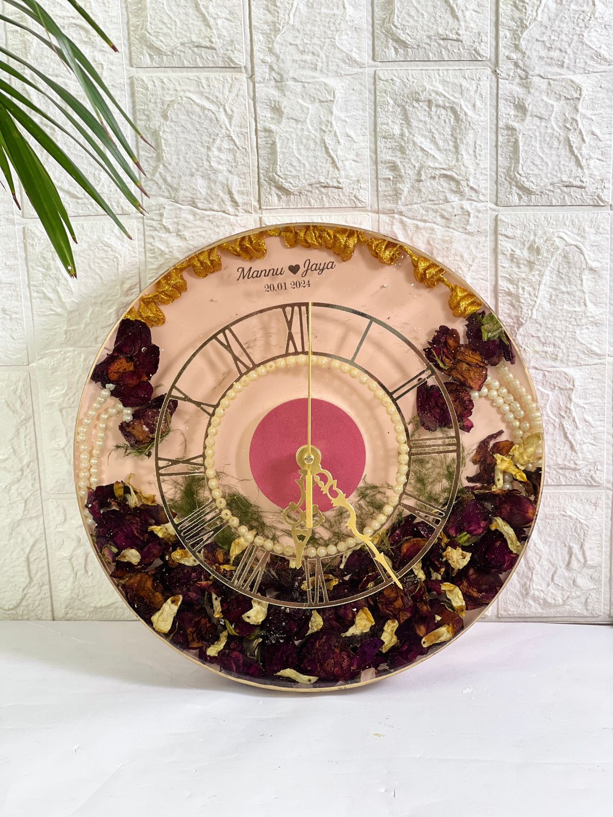 This 12-inch round deep casting resin wall clock is a unique and sentimental piece, beautifully preserving the essence of your wedding day. It features wedding varmala flowers, baby's breath, and white pearls, all delicately sealed in high-quality resin, creating an elegant and timeless design.