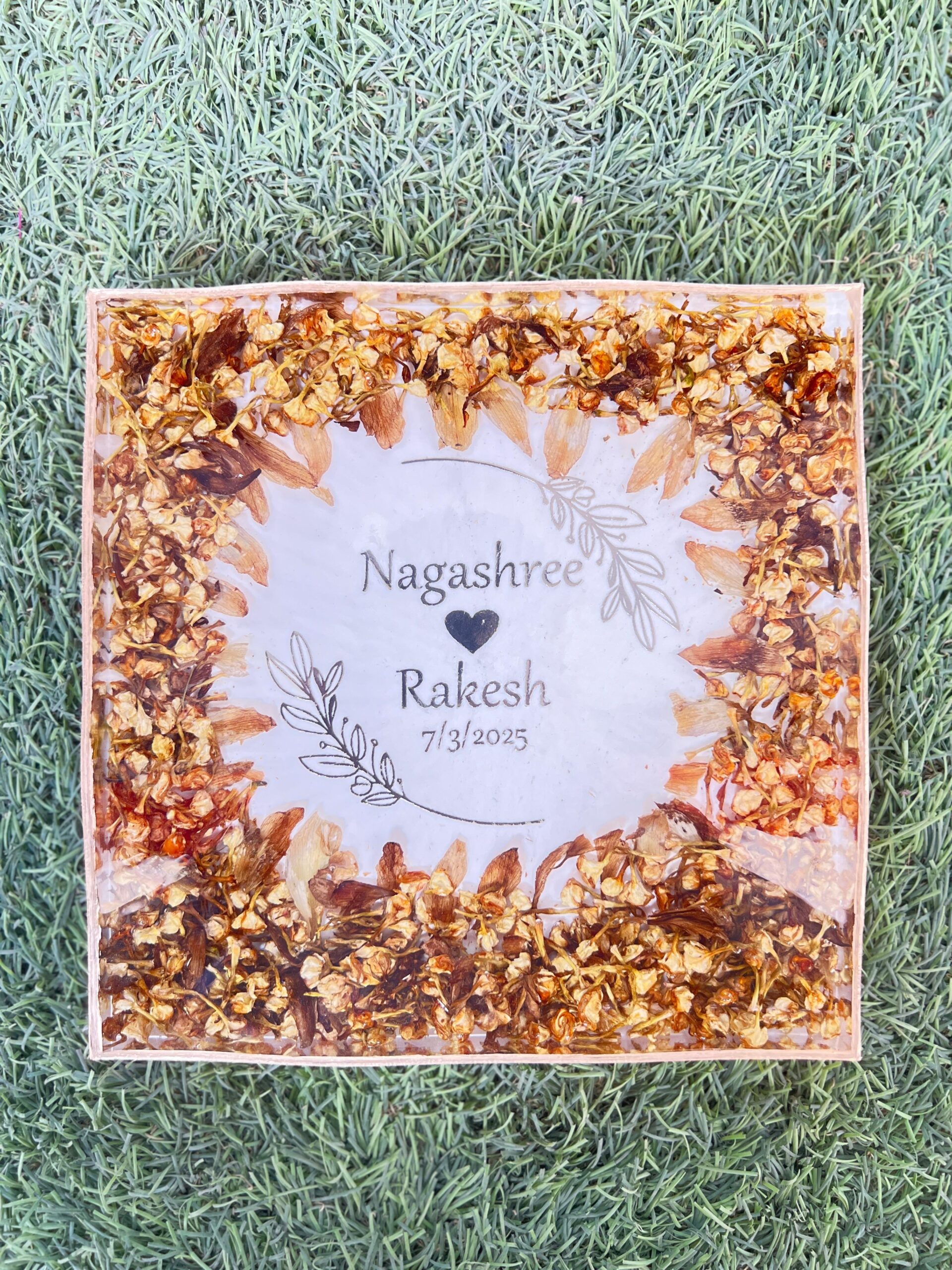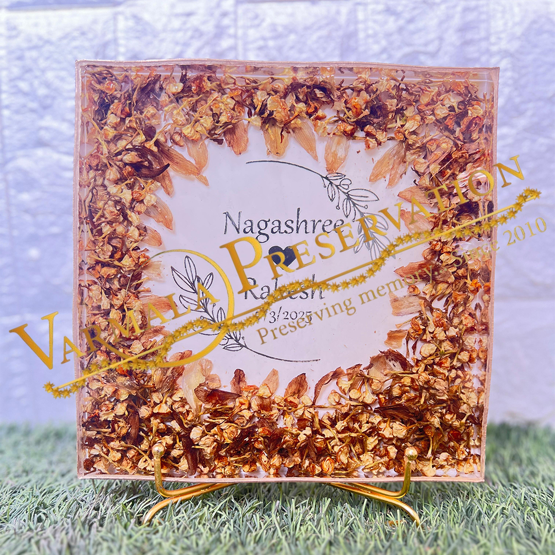 Celebrate your love with this Custom Varmala Preservation Resin Frame, crafted using real varmala flowers and personalized with your names and wedding date. The Square Epoxy Resin Frame features a rich floral border design, made with your original varmala petals, preserved forever in clear resin.