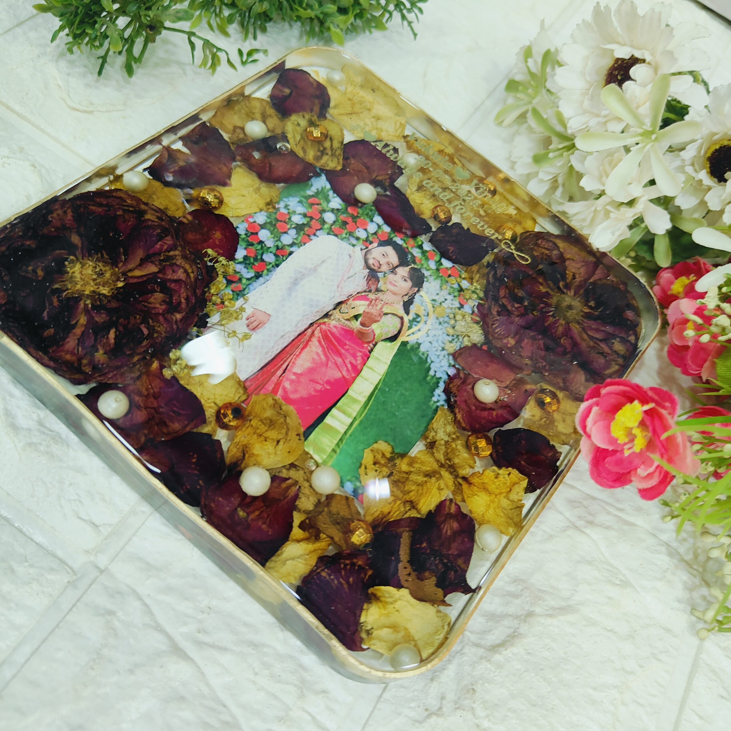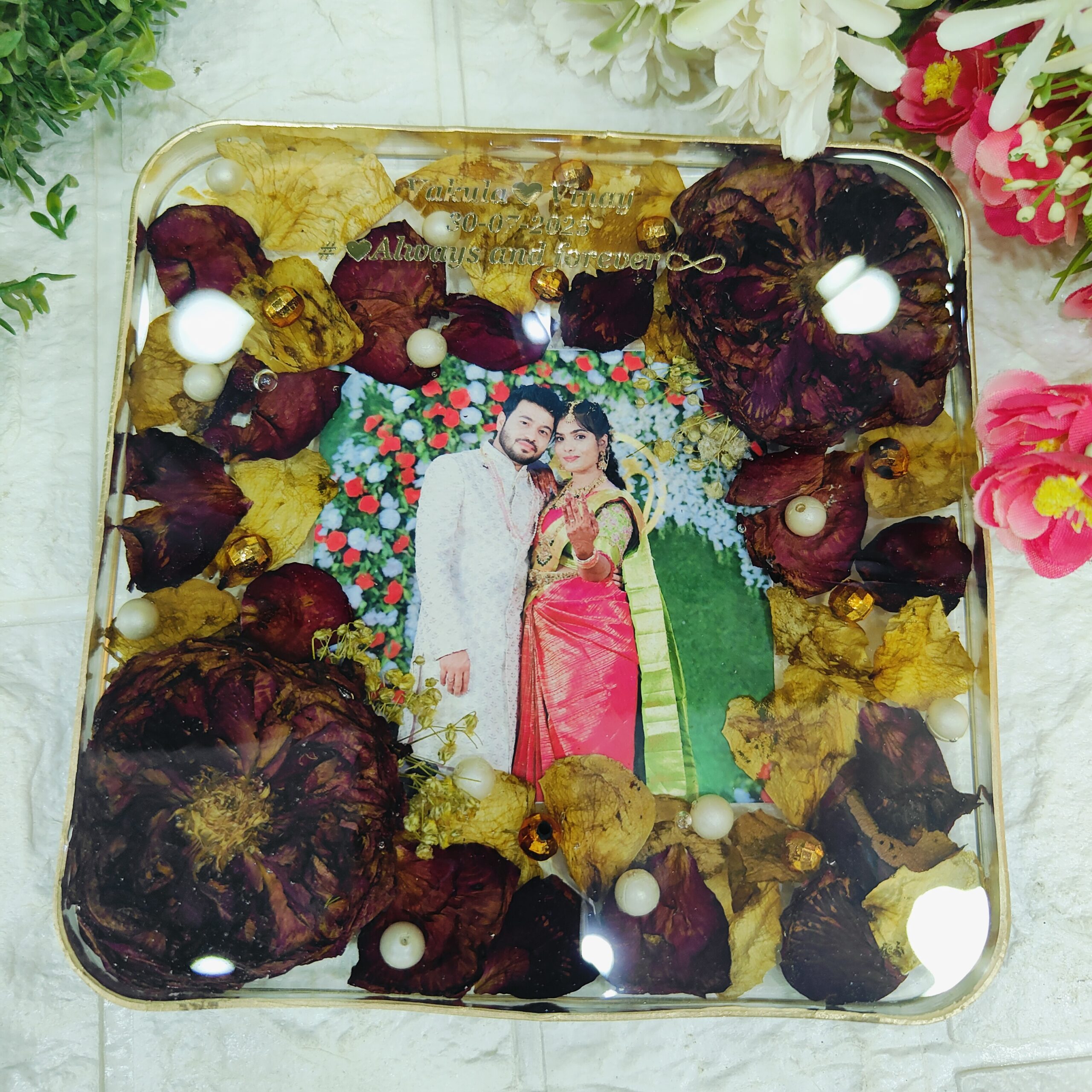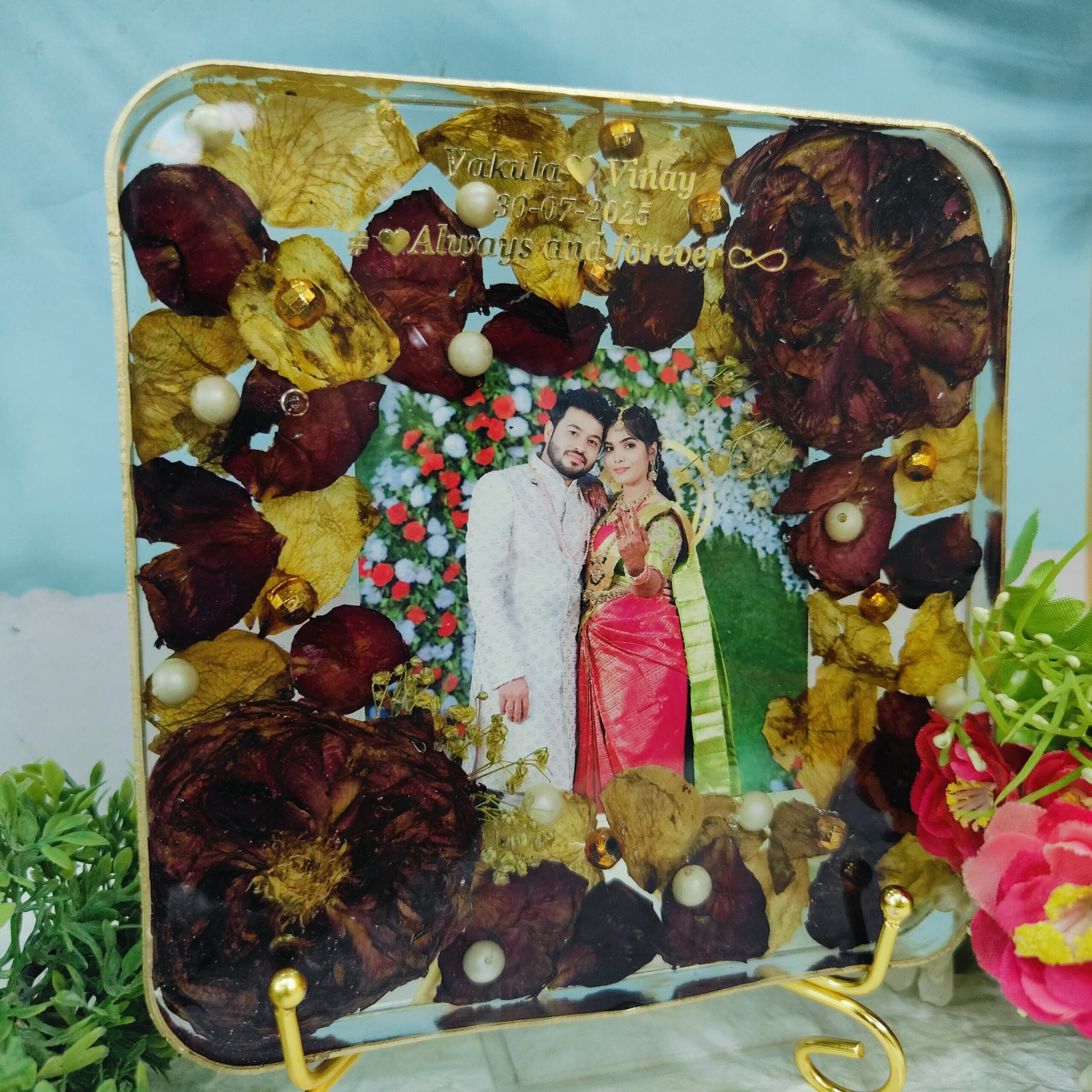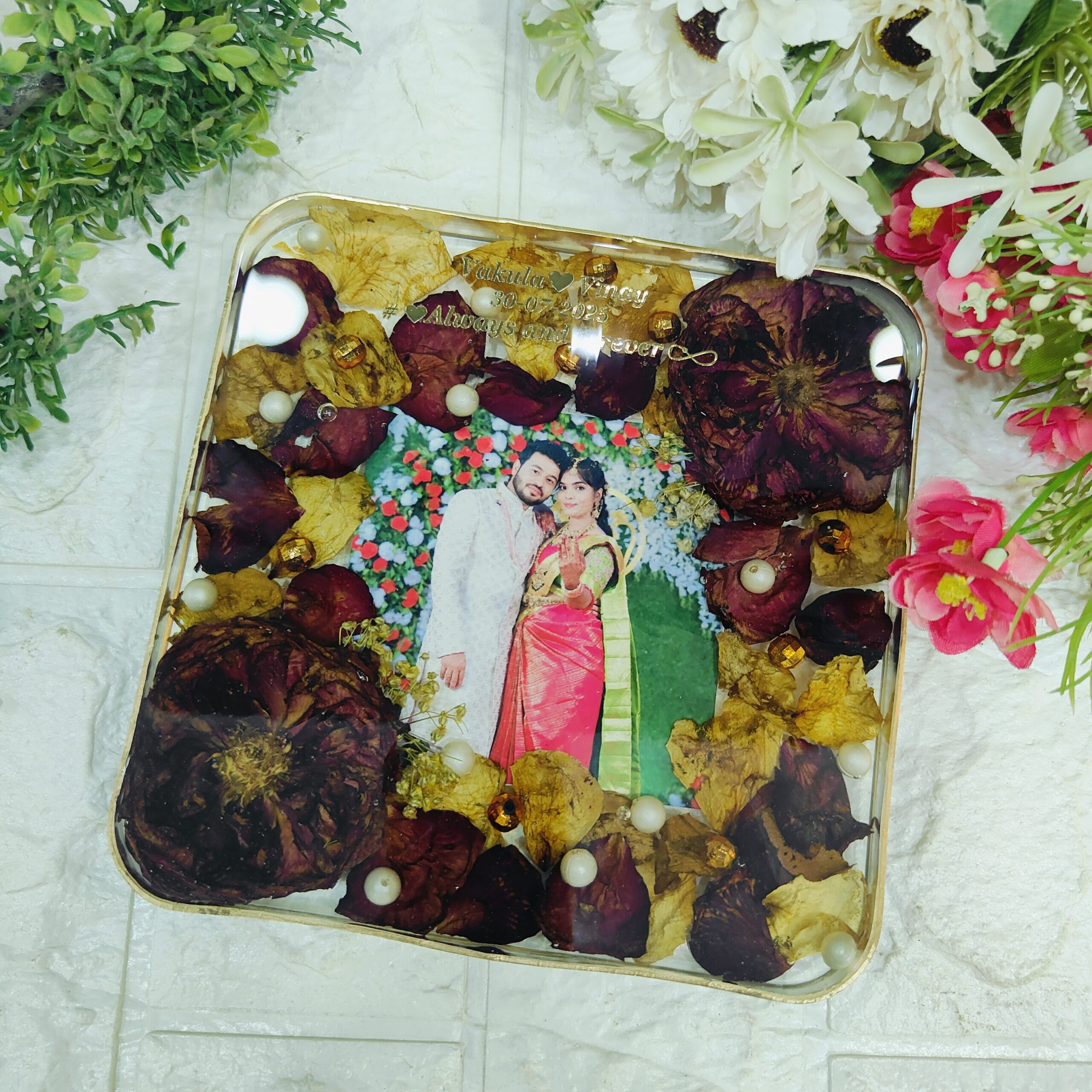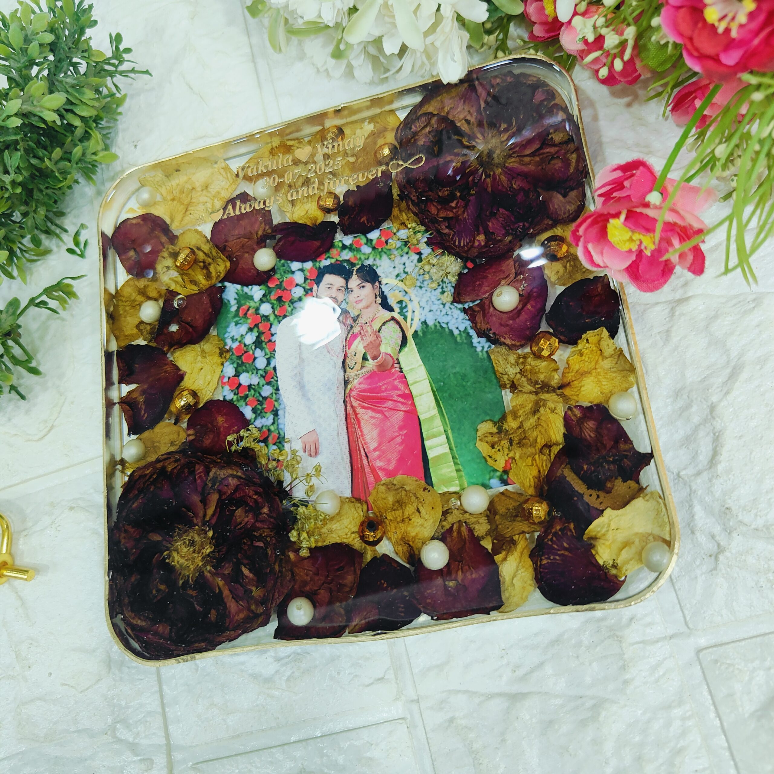 Celebrate your wedding memories forever with this beautiful square resin frame with preserved varmala flowers. We take your real varmala flowers and carefully preserve them in crystal-clear resin, along with your wedding photo, pearls, and gold accents. The square shape gives it a modern look, while the gold stand makes it perfect for display. Each piece is handmade with love to keep your special day alive for years to come.