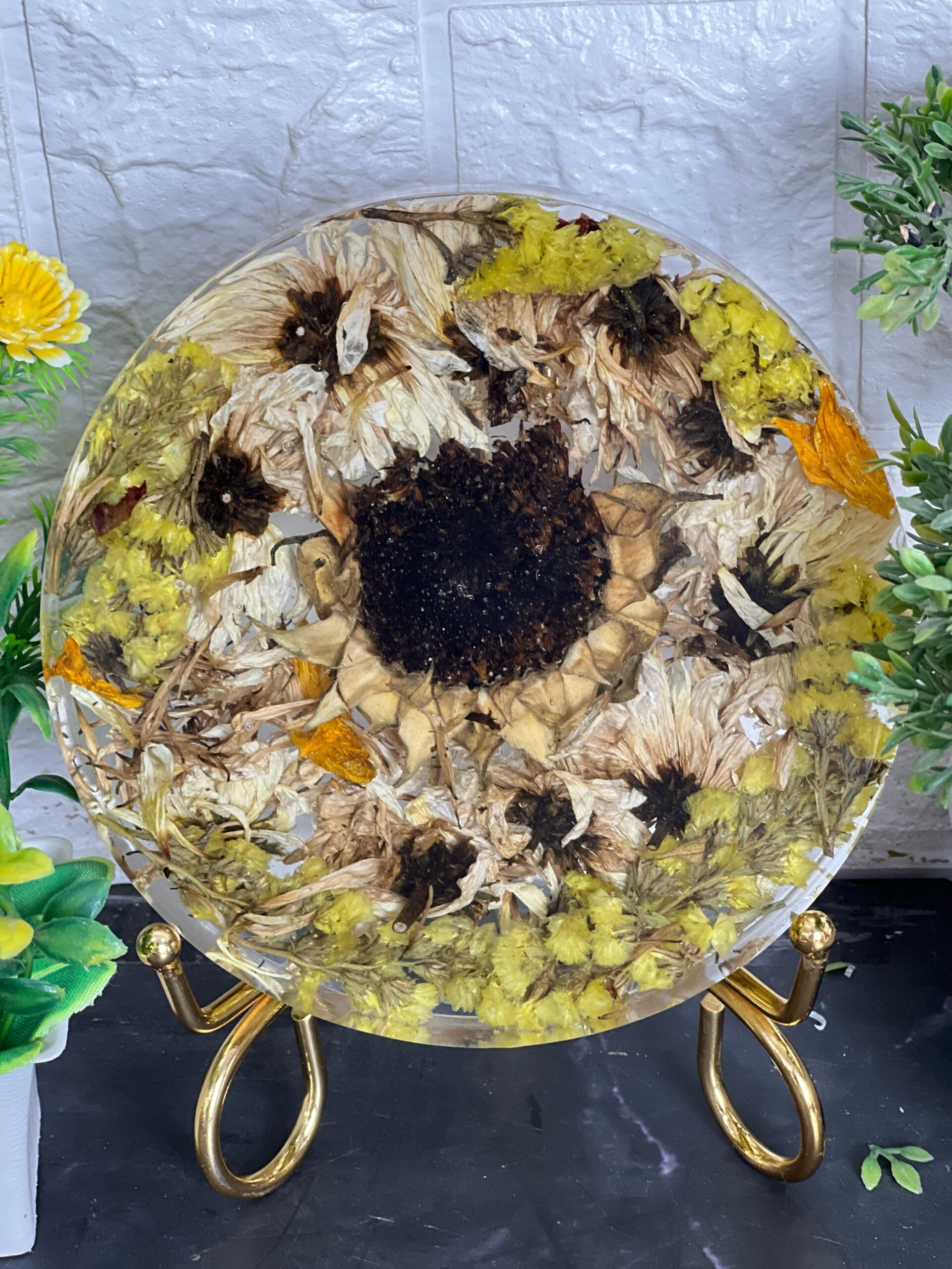 This handcrafted resin plate is a beautiful mix of sunflowers and dried yellow-white flowers, frozen in time using clear resin. The natural look of the plate brings a warm and earthy feel to any space. Each flower is real and carefully arranged to create a floral artwork that will never fade. This is more than just home decor – it's a way to keep special flowers safe forever, especially from your varmala or special occasions. The sunflower center adds brightness and positivity to the whole piece.