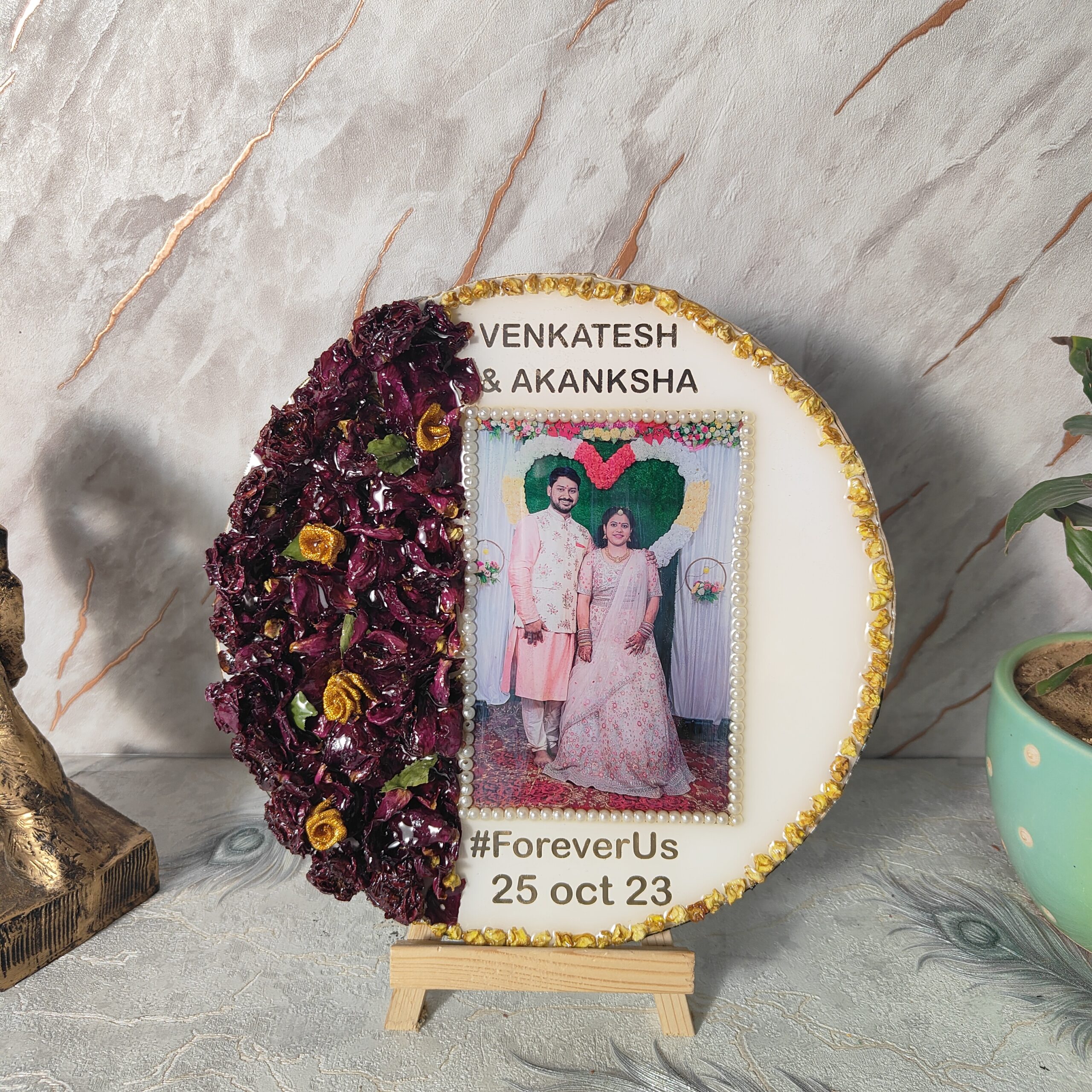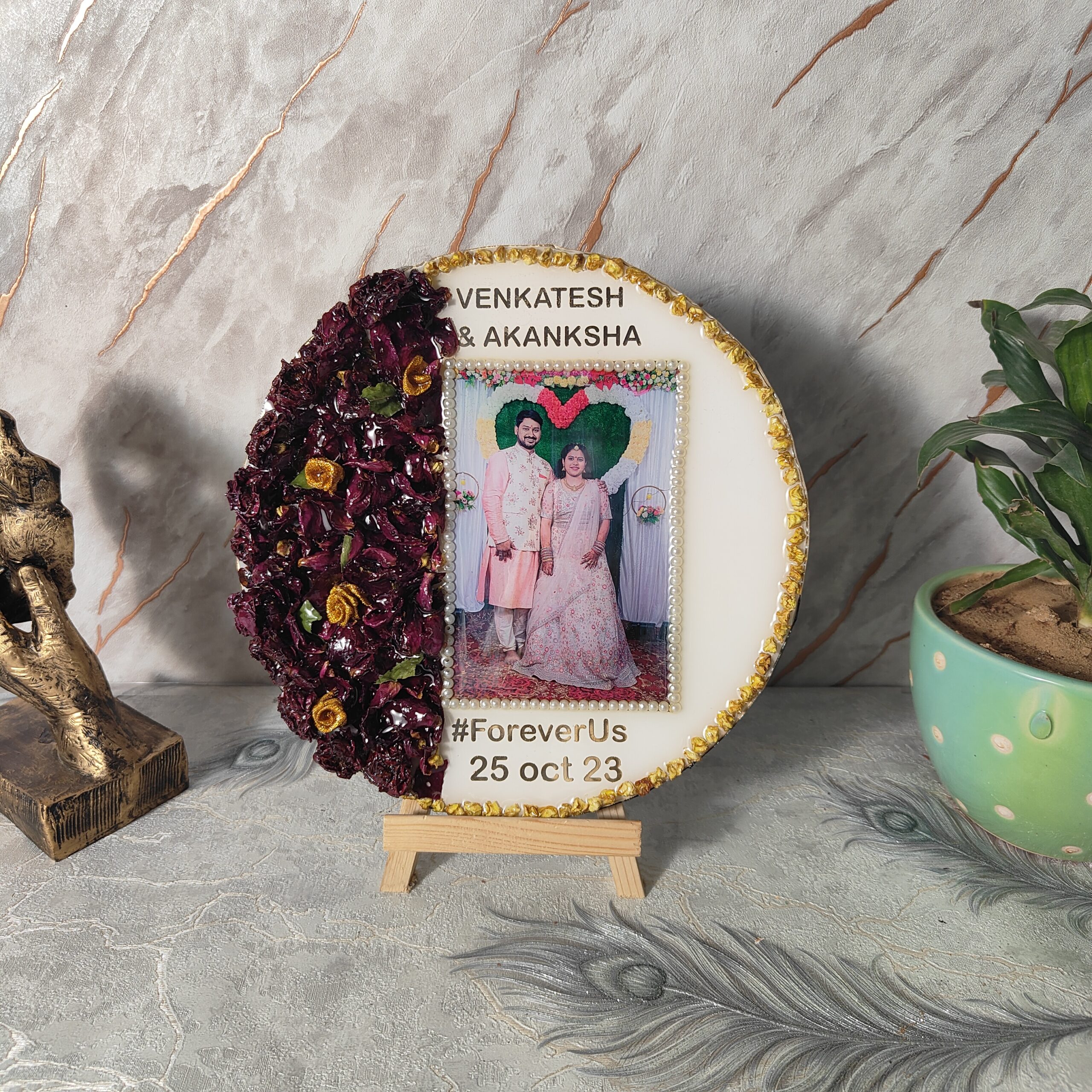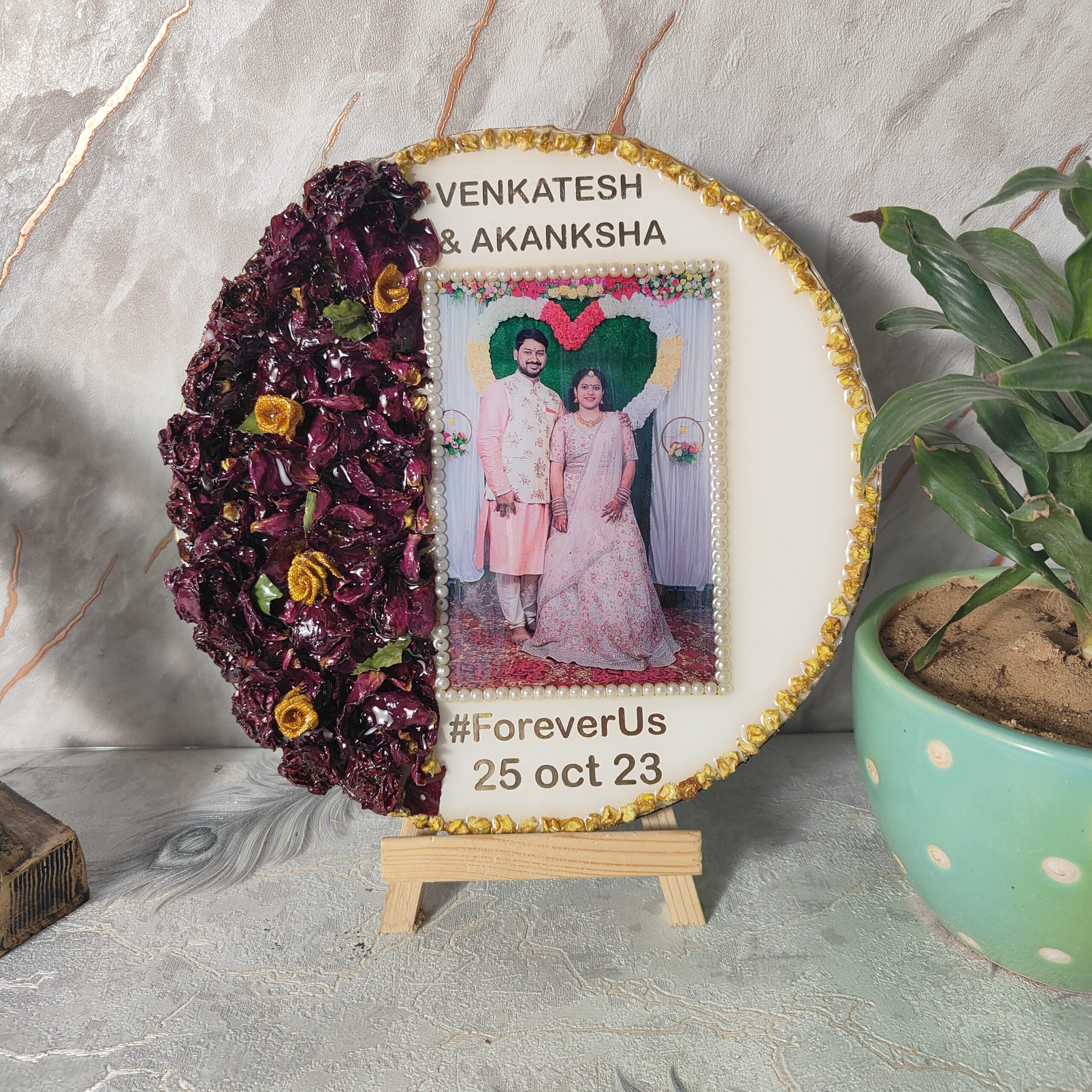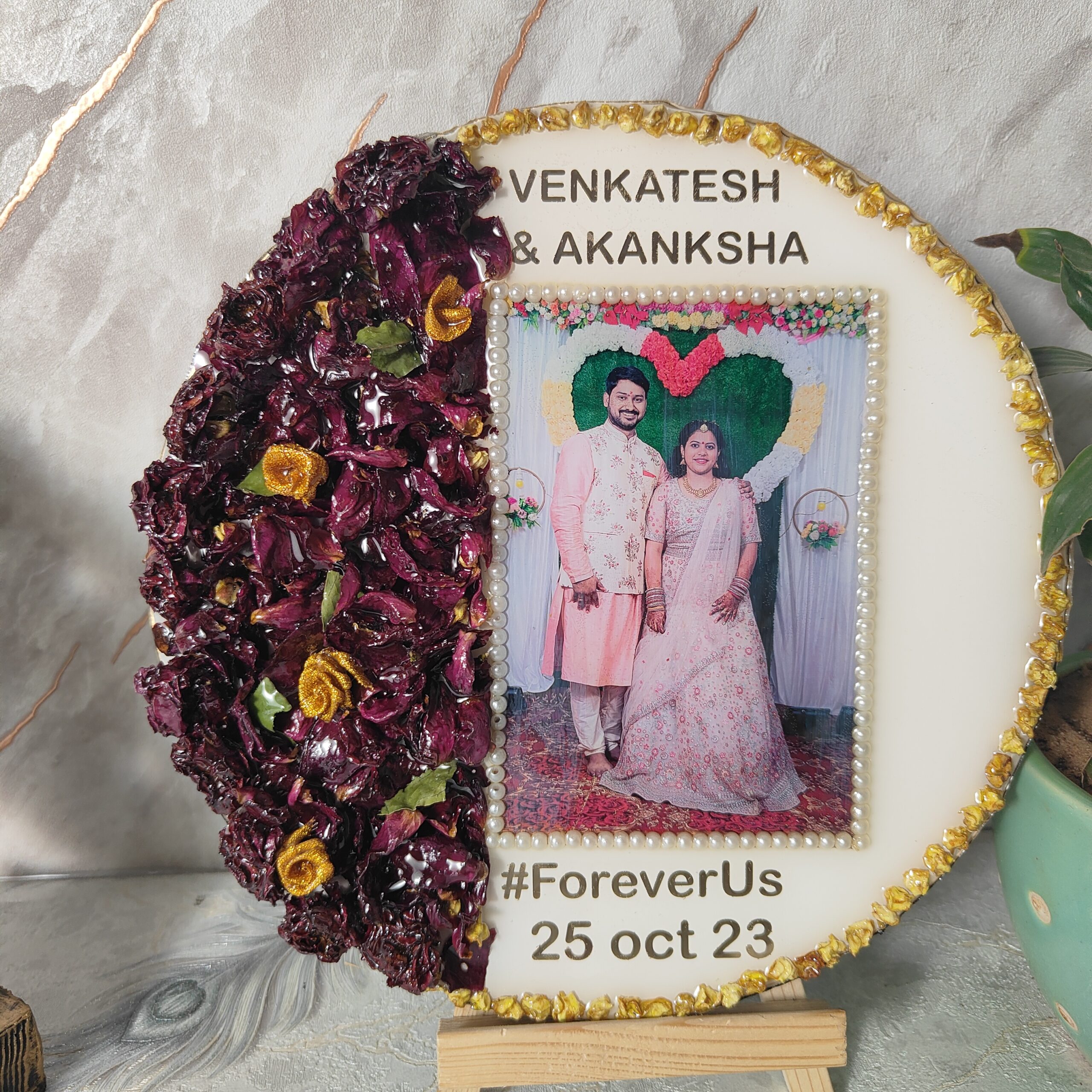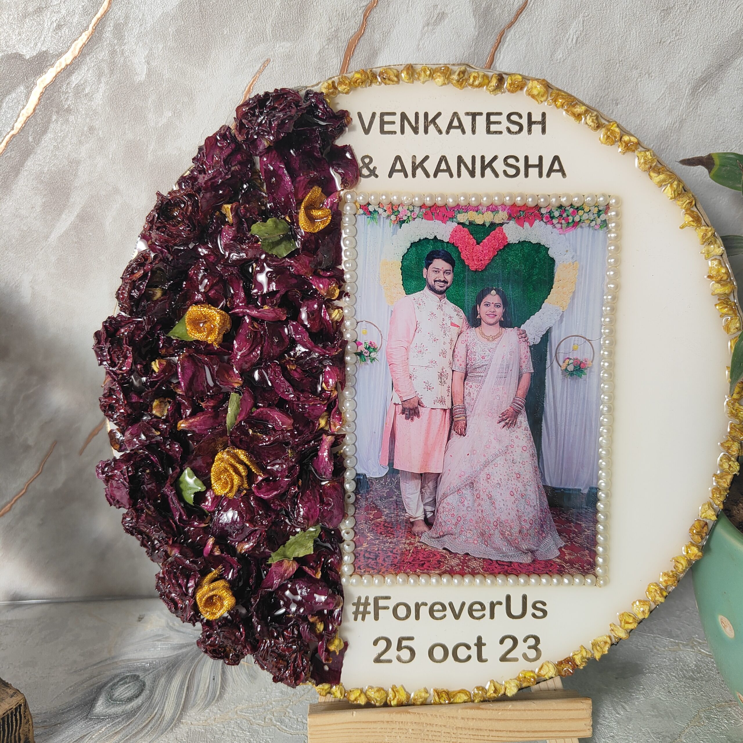 Preserve your special wedding memories with this 10-inch round deep-casting resin frame. Designed with a white base, this elegant frame beautifully encases the wedding varmala flowers and a couple’s wedding photo in high-quality resin. The wedding picture is carefully decorated with a white pearl border, adding a touch of grace. This frame also features the couple’s names, wedding date, and the heartfelt quote "FOREVER US", making it a perfect keepsake. Comes with a sturdy wooden stand, allowing it to be displayed effortlessly in any space.