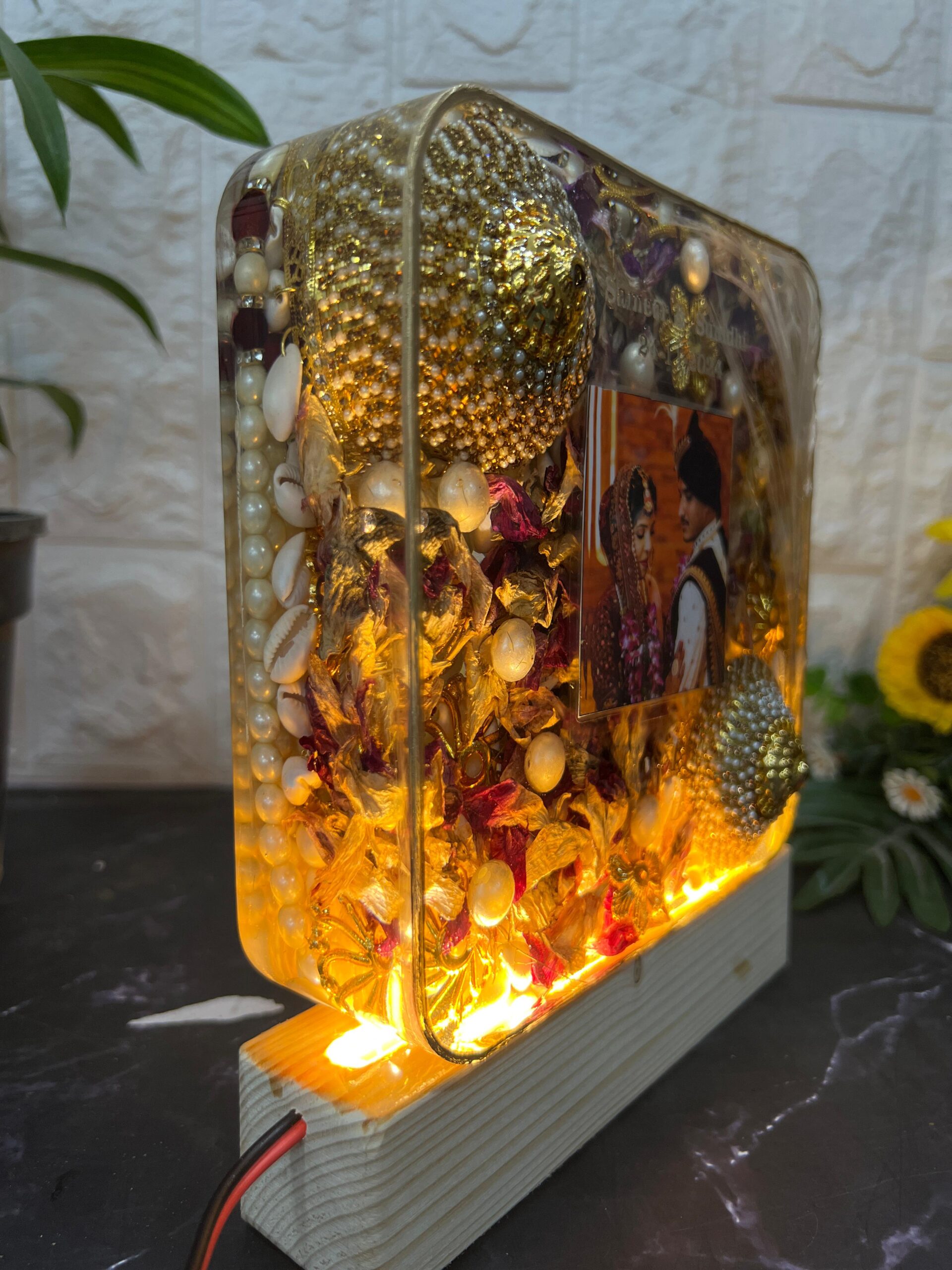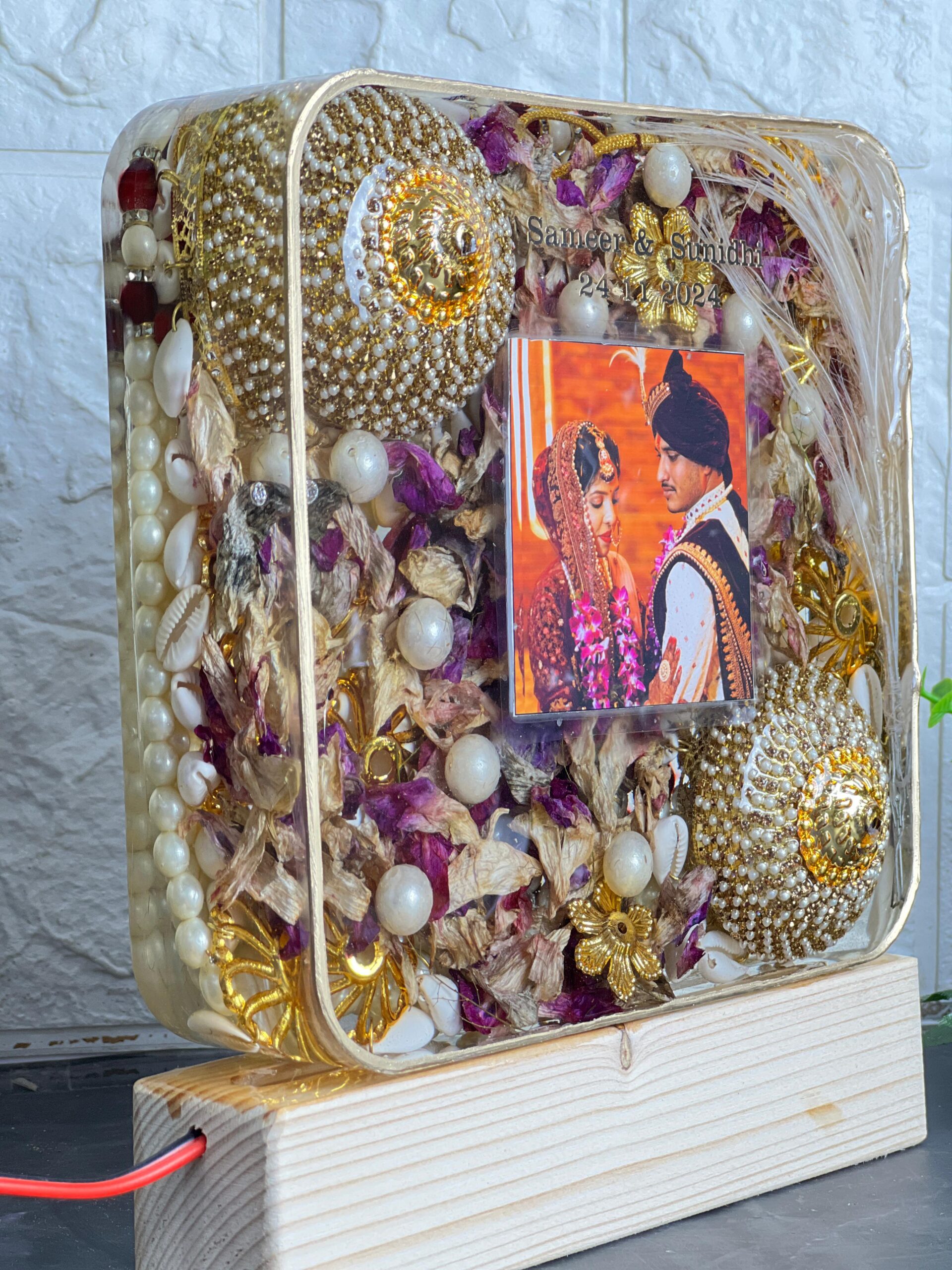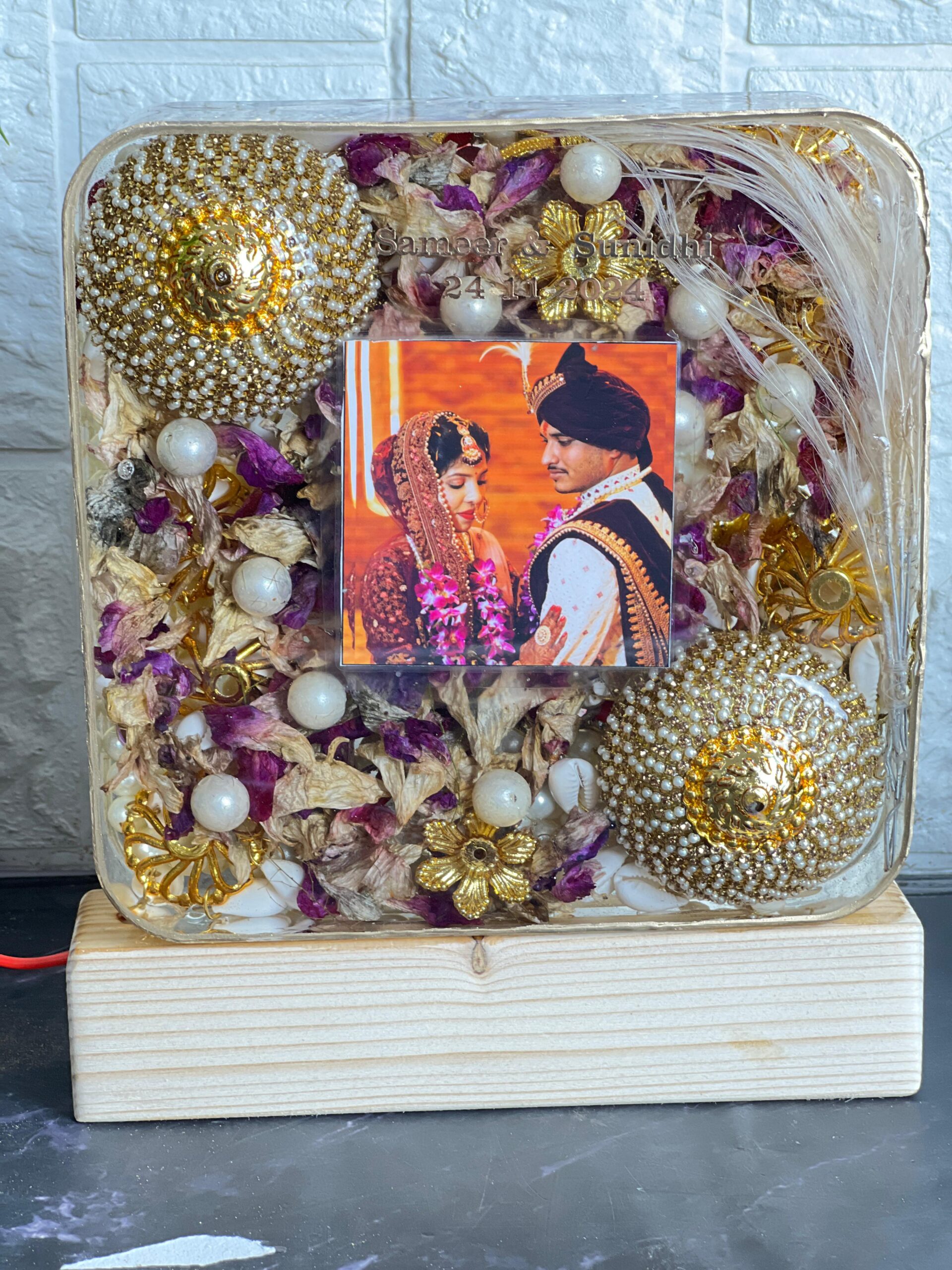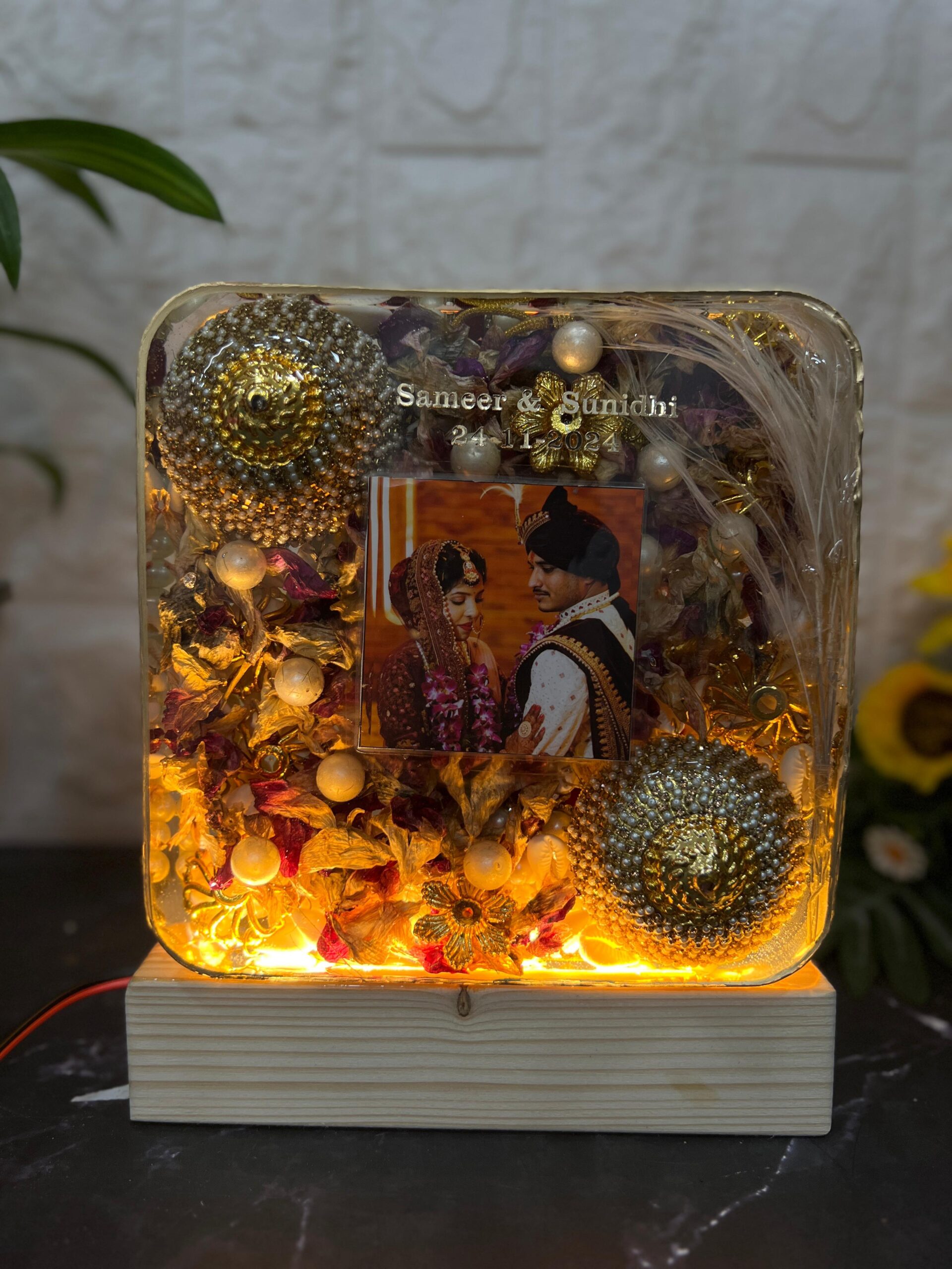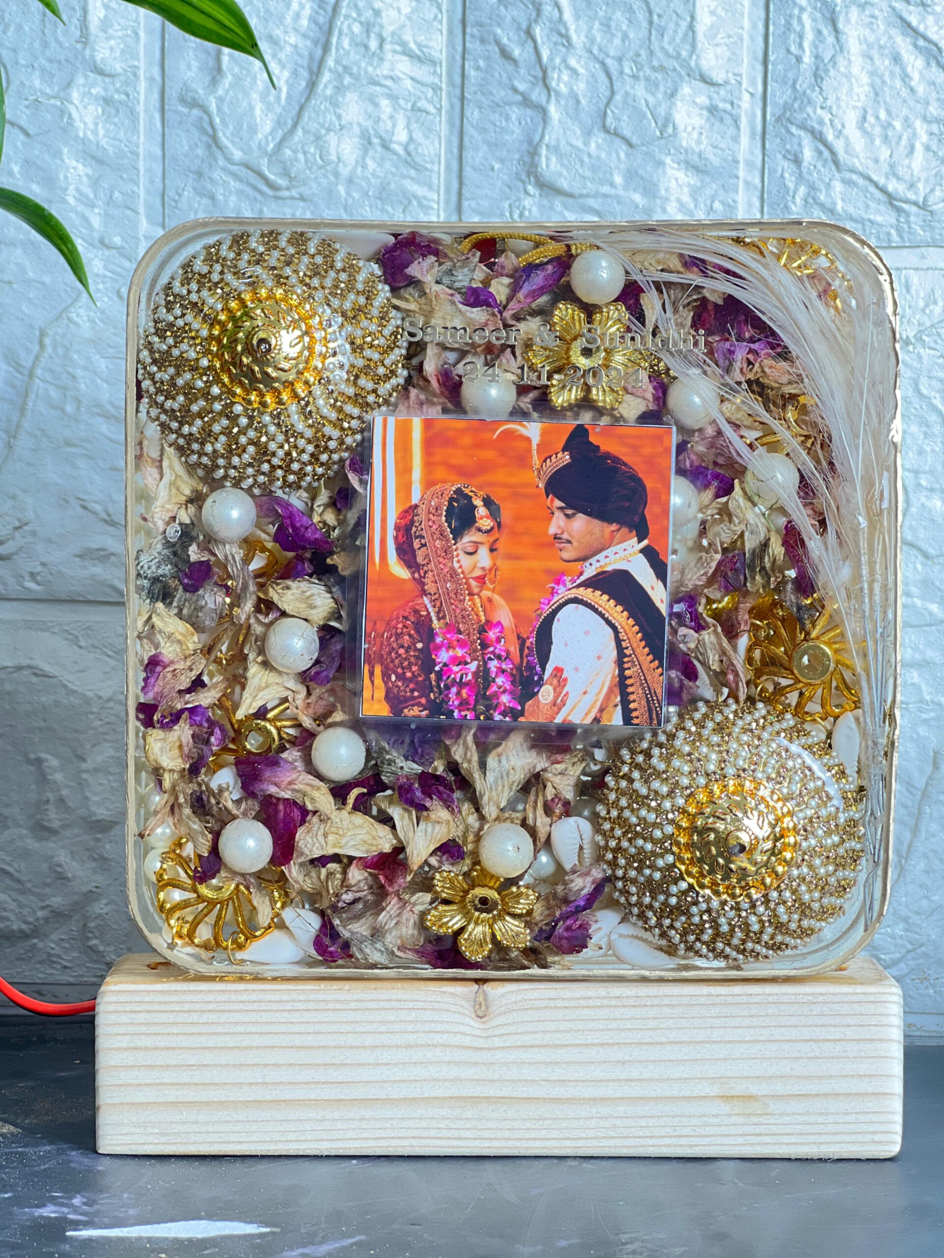 Wedding garland preservation in epoxy resin This deep-casting rectangular frame has Sameer and Sunidhi's wedding garland, with beautiful flower petals, their wedding photos, kaleerein, and kalangi, all carefully kept in clear resin. The frame sits on a wooden LED stand that gives a warm light, making your memories look even more special. It's the perfect way to remember and show off your wedding day.