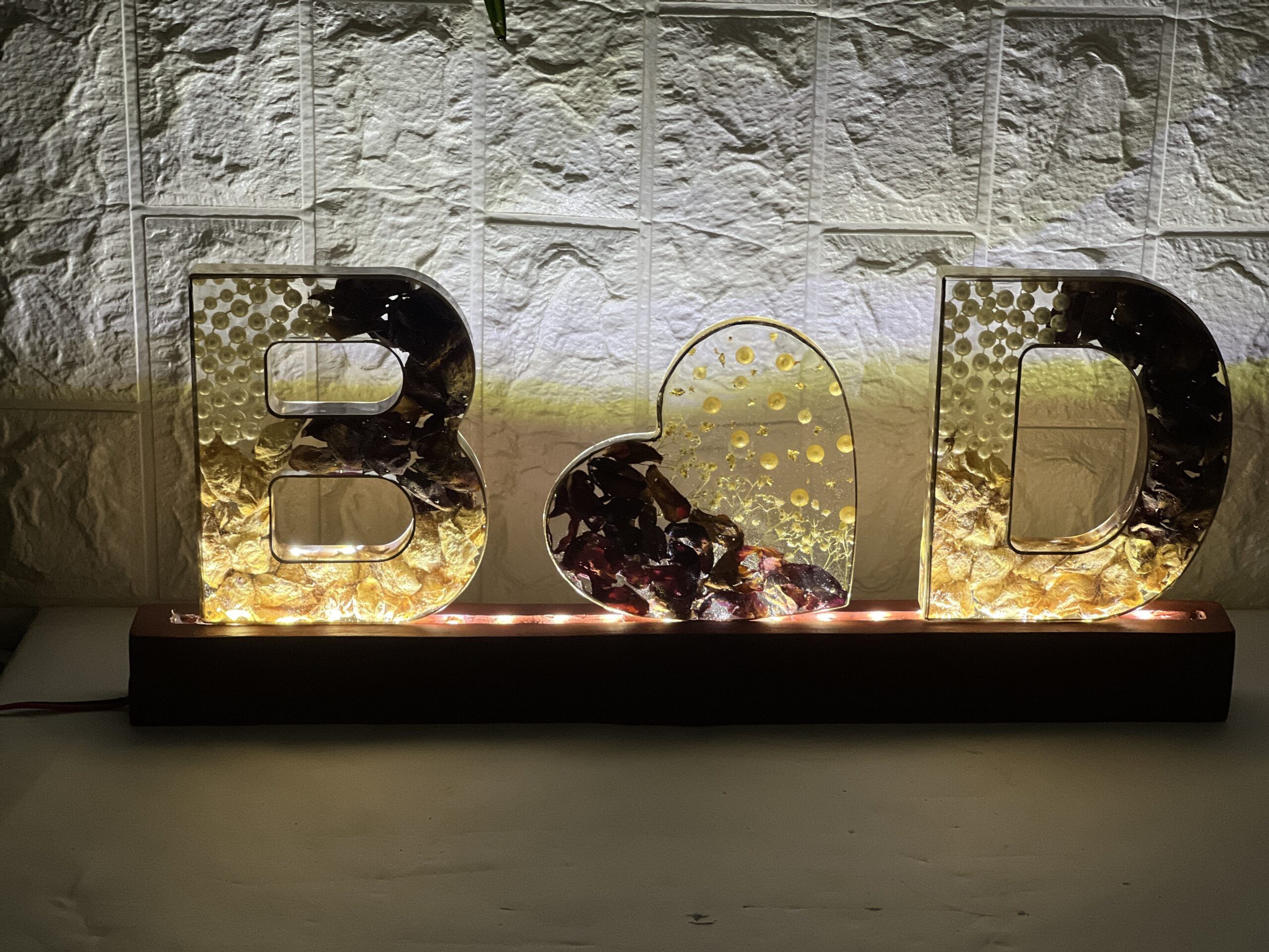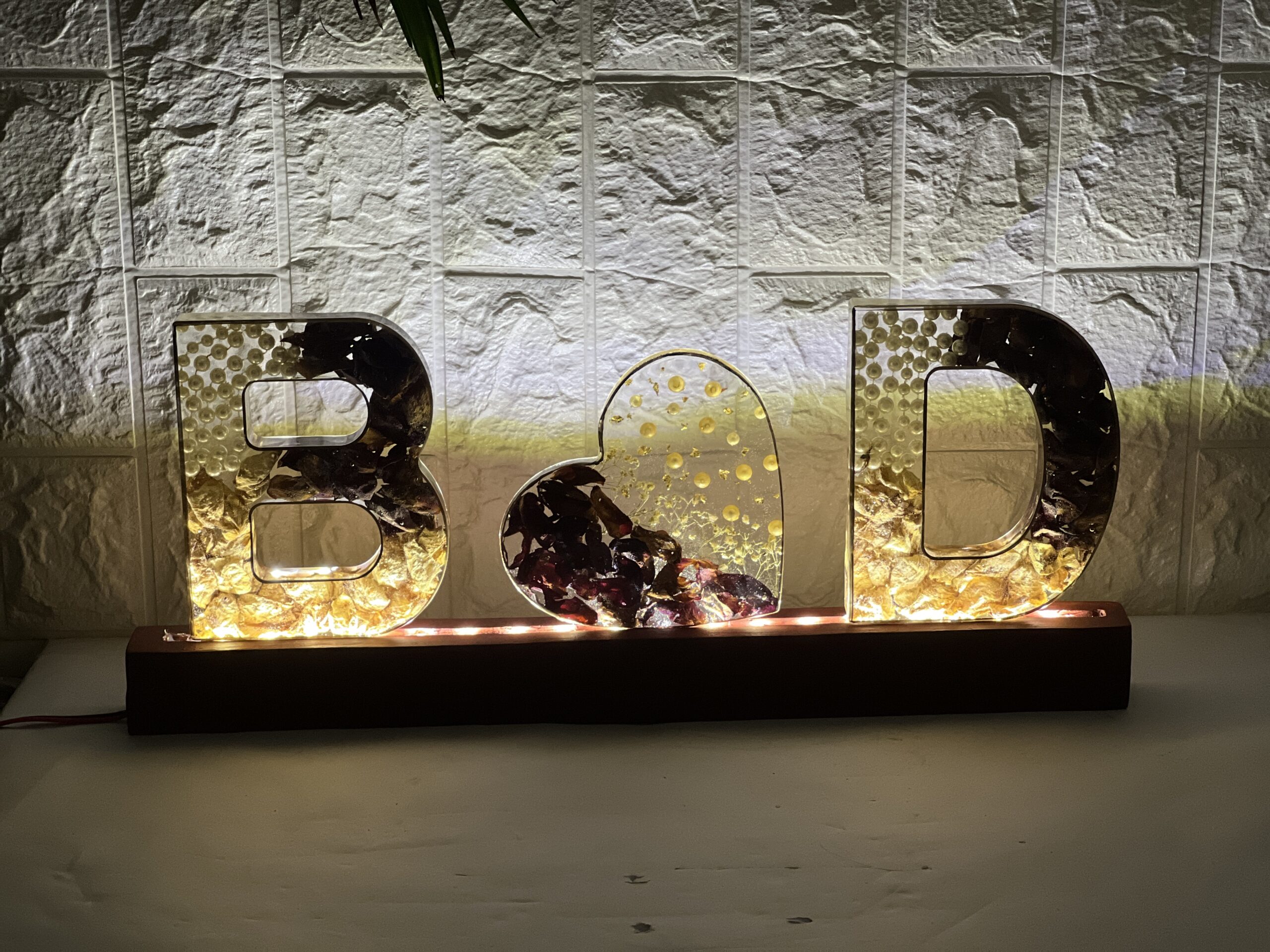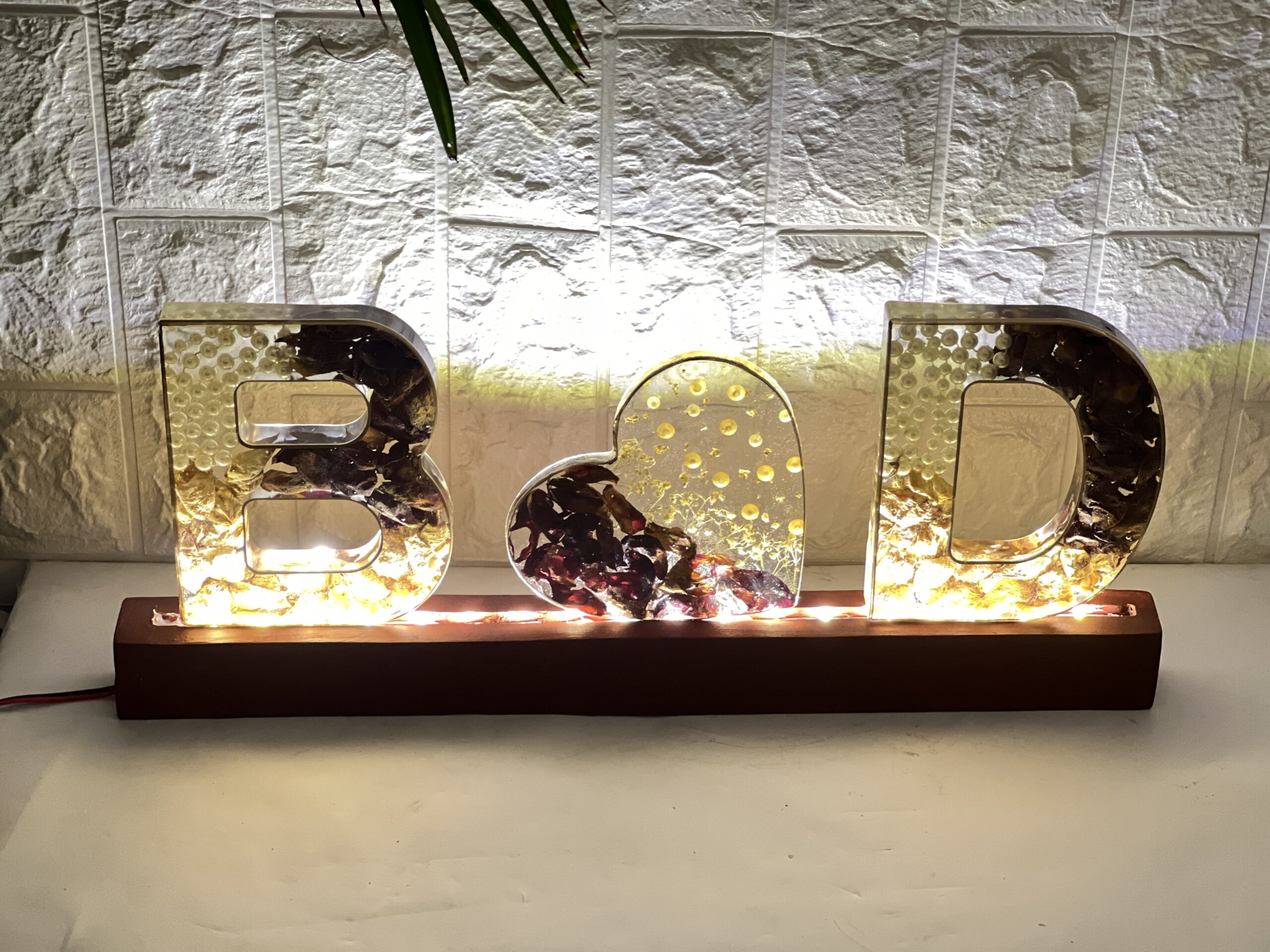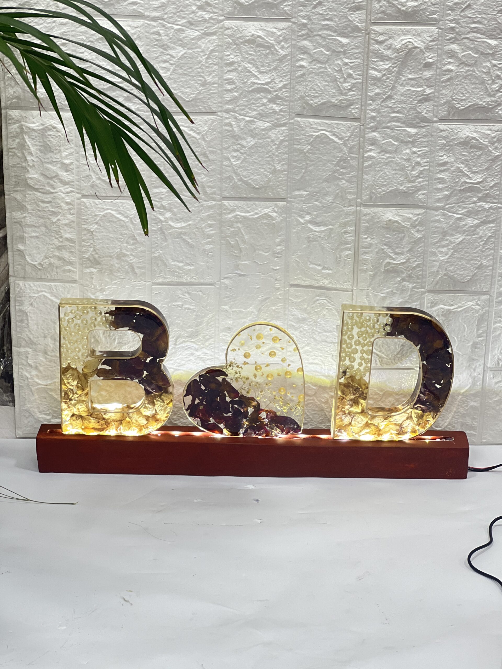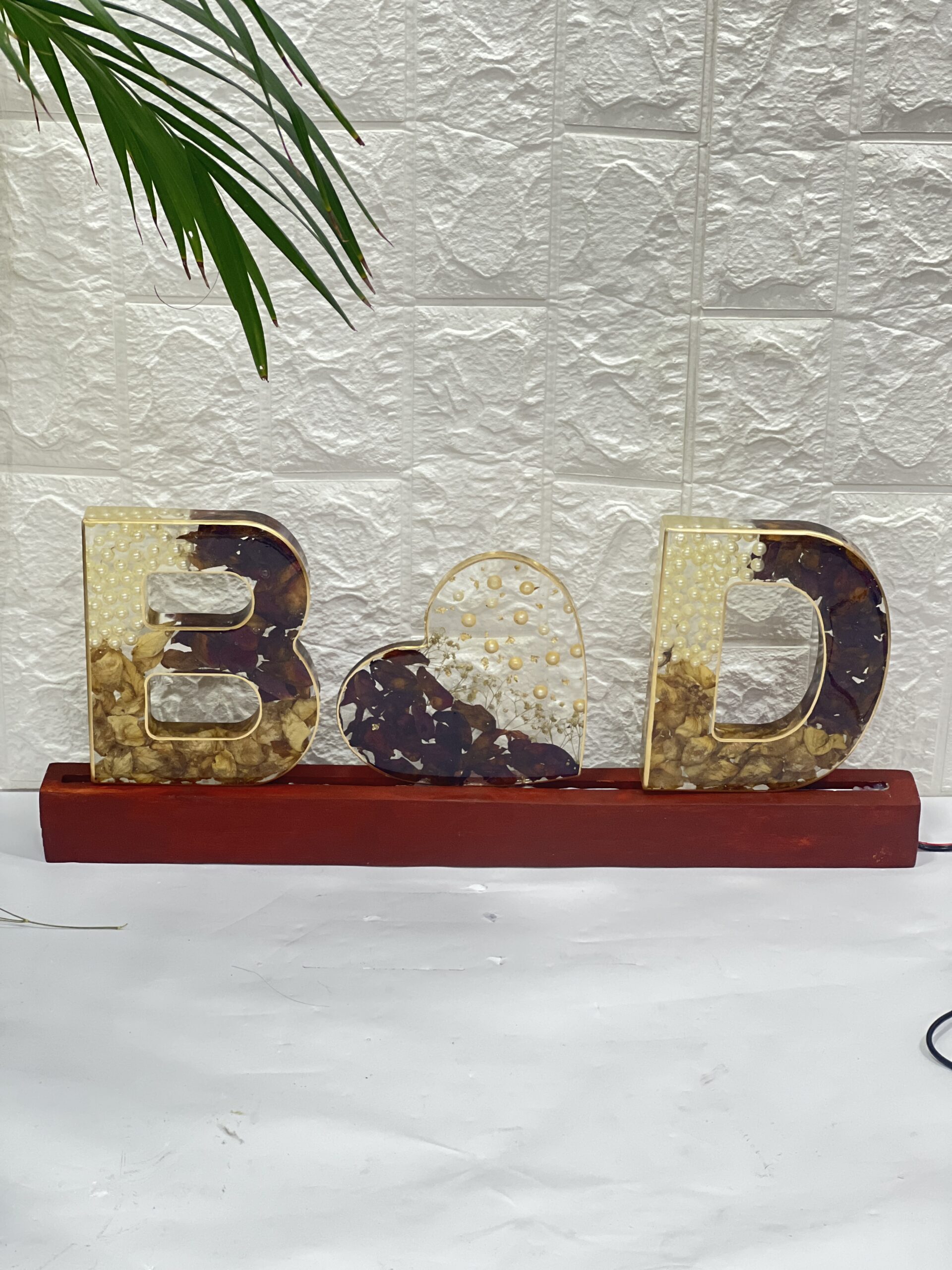 Make your love shine bright with this custom resin name letter frame. This handmade piece features two initials with a heart in between, beautifully crafted with real dried wedding varmala flowers and white pearls inside clear resin. The letters sit on a wooden LED base, creating a warm and romantic glow.