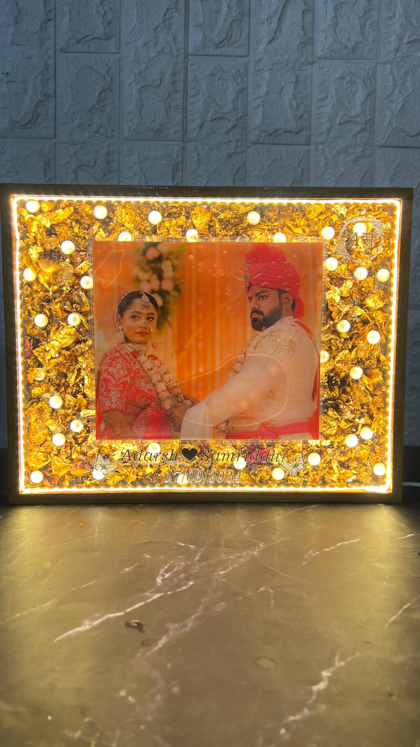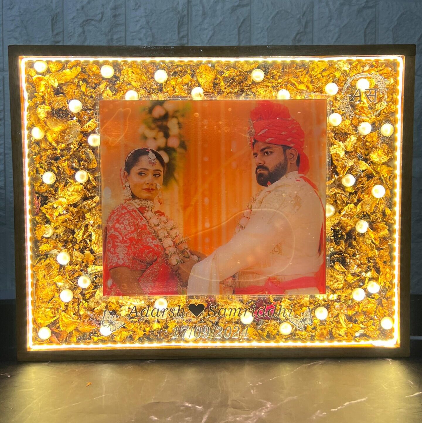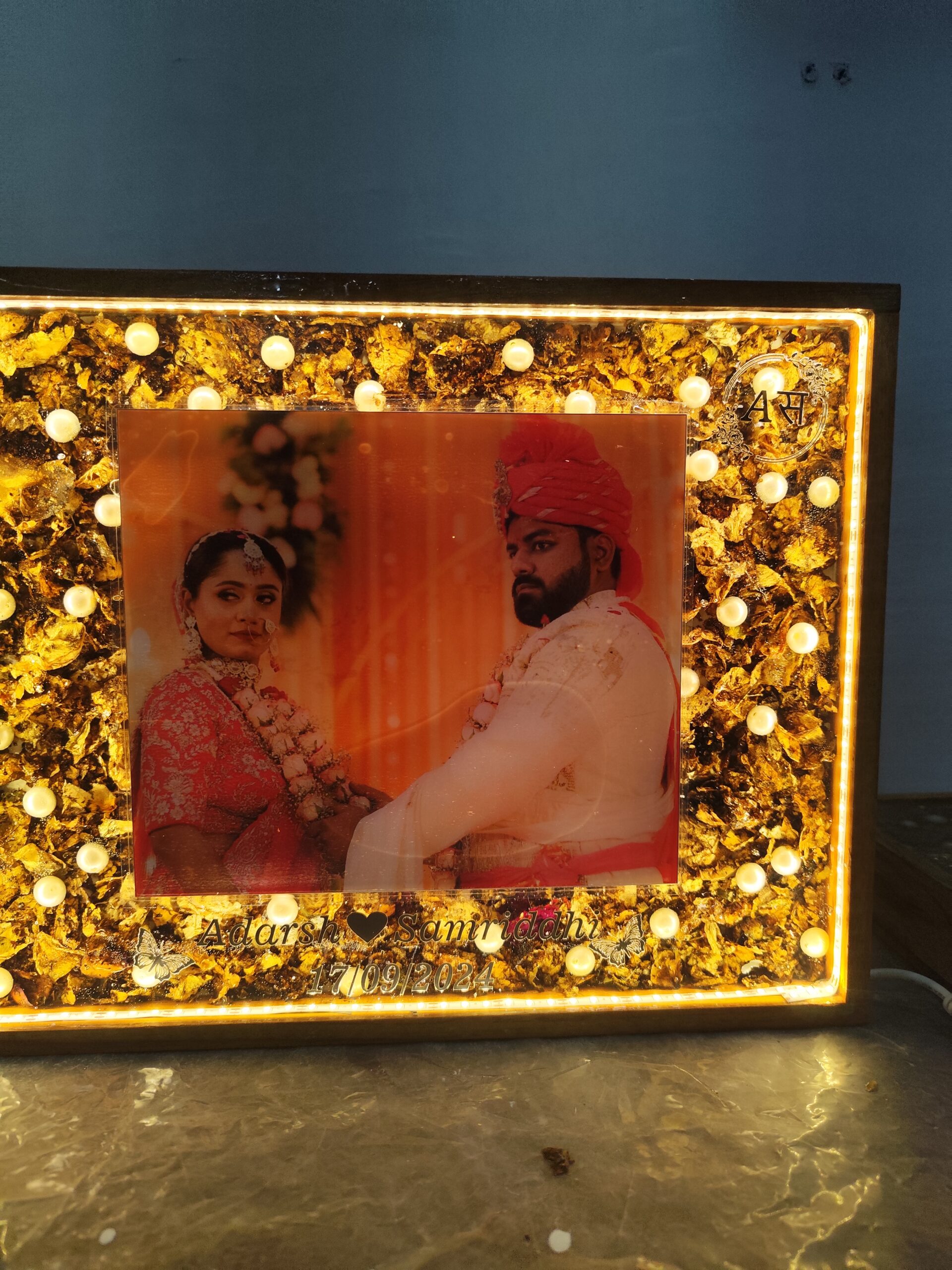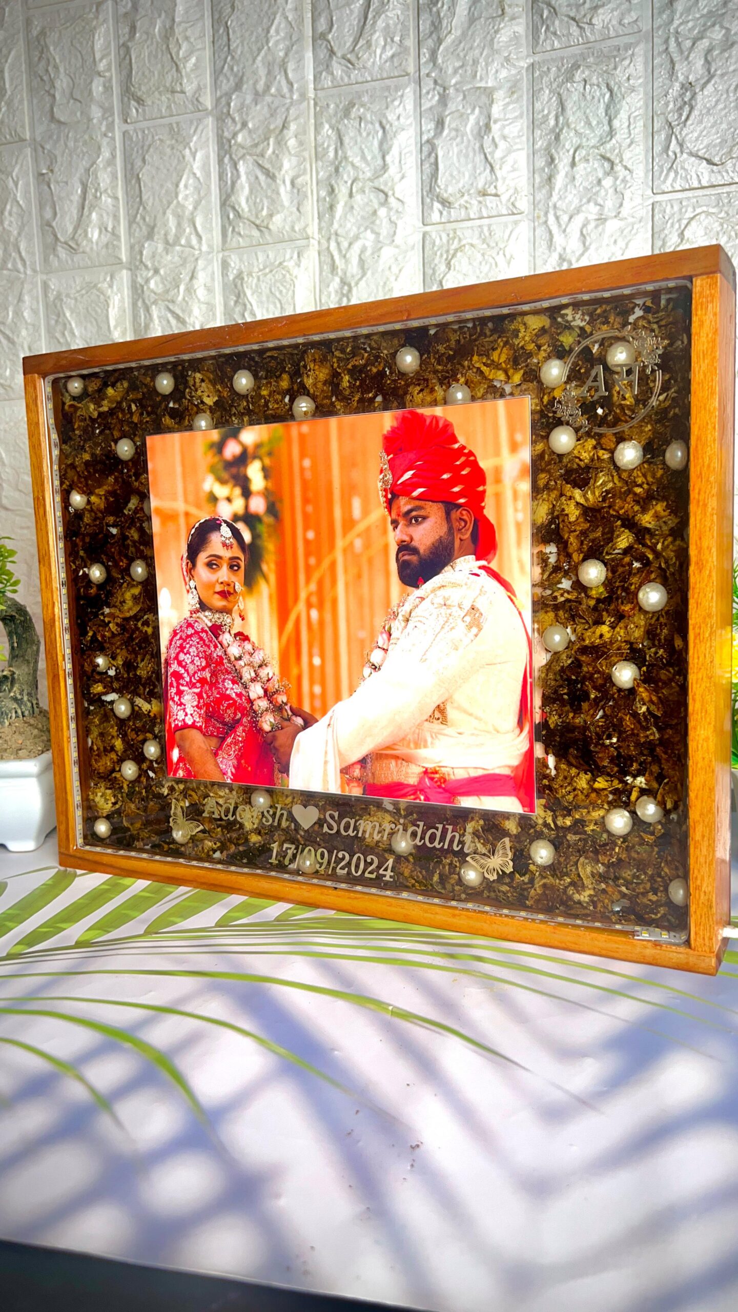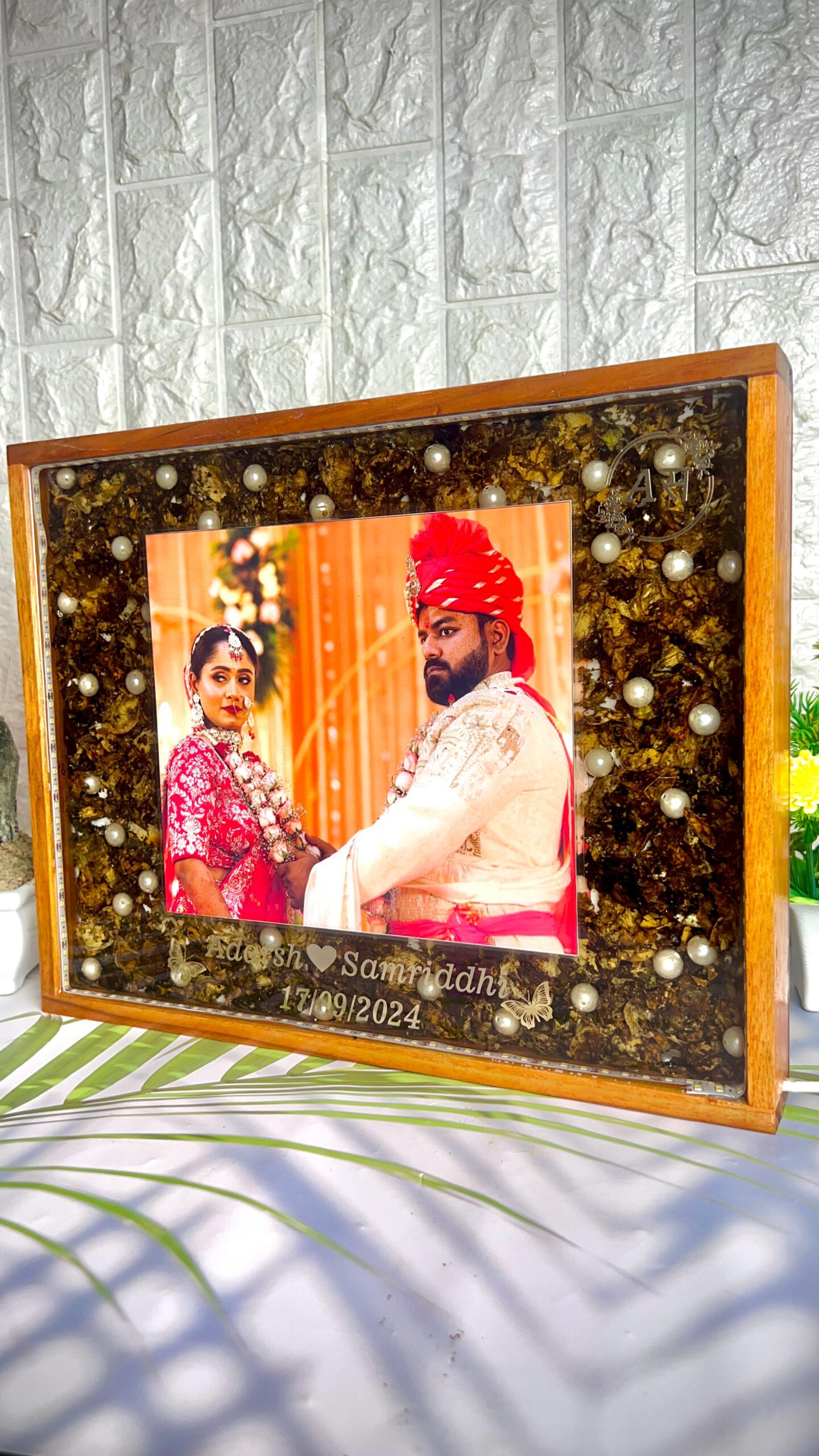 This teakwood LED frame beautifully preserves the special memories of Aadrsh and Samridhi's wedding day. The frame features their wedding photo, along with varmala flowers and white pearls, all carefully preserved in high-quality resin. The frame is personalized with the couple's names and wedding date, adding a special touch to this timeless keepsake.