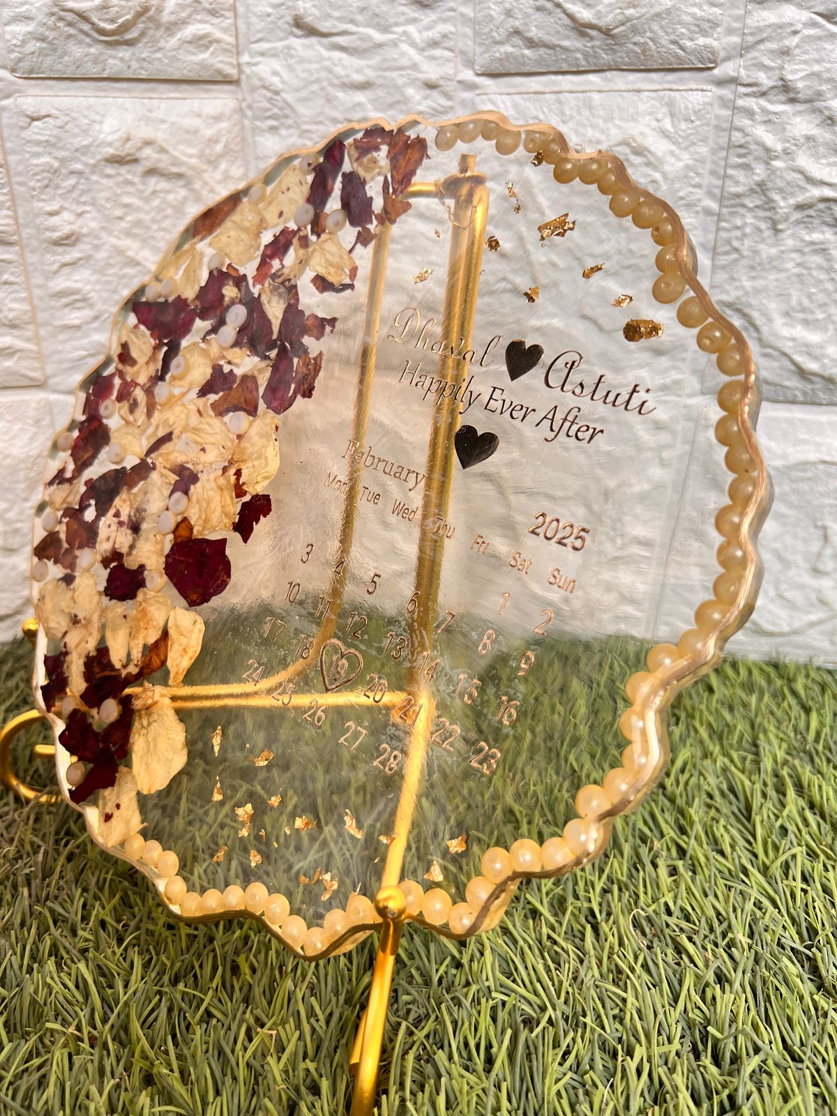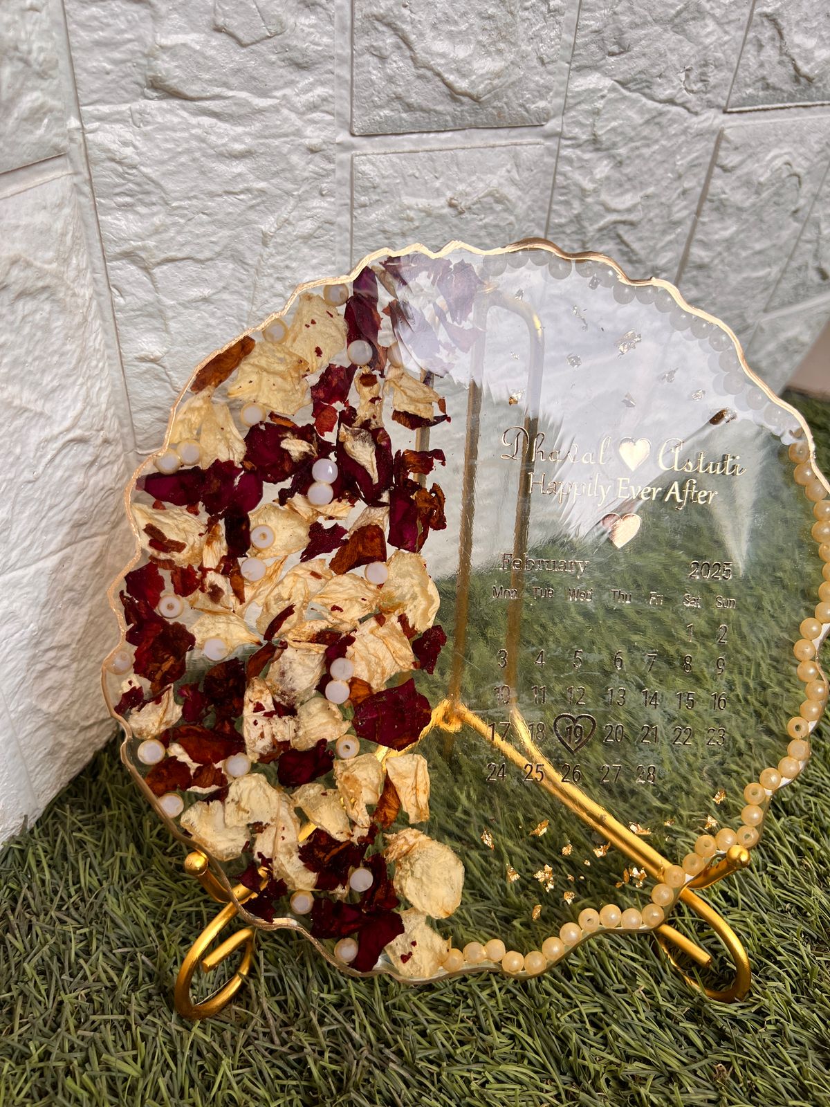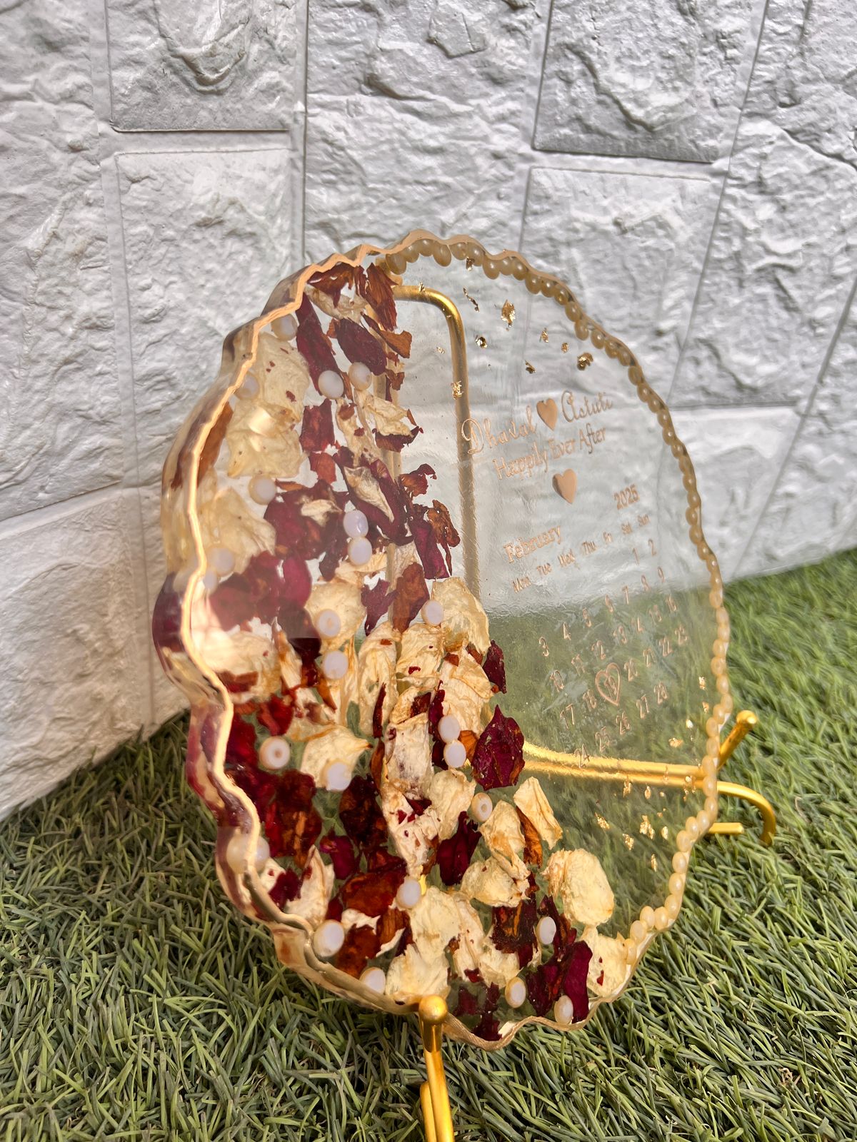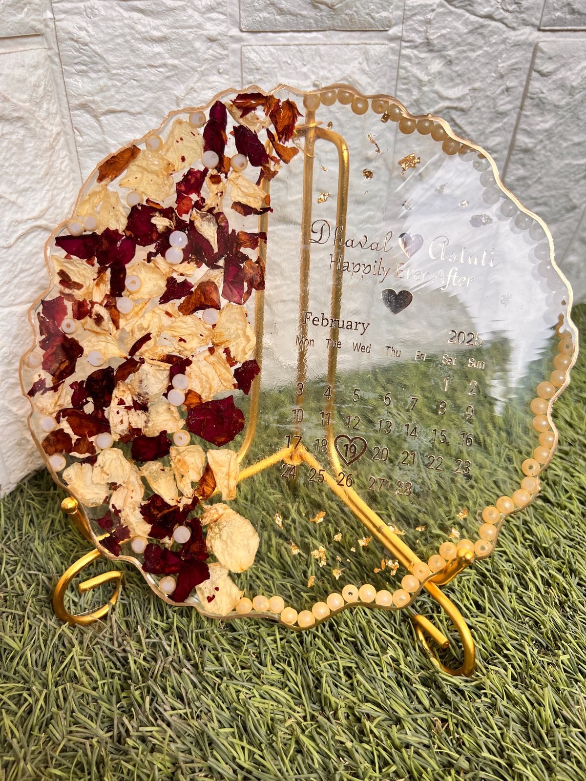 This Wedding Date Resin Calendar Frame with Dried Flowers is a stylish and emotional gift that marks your special date forever. Crafted in clear epoxy resin, it shows your wedding month calendar with your names and a loving quote. One side is beautifully filled with dried red and white rose petals, while the edge is lined with soft golden pearls.
