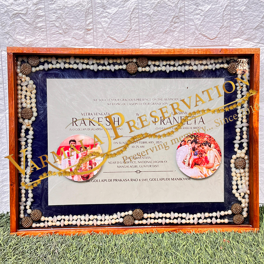 The frame is decorated with small white kapoor mala and golden accents, giving it a festive and elegant look. It comes in a sturdy wooden box frame, perfect for wall hanging or table display. A special way to preserve the invite card with love and style.