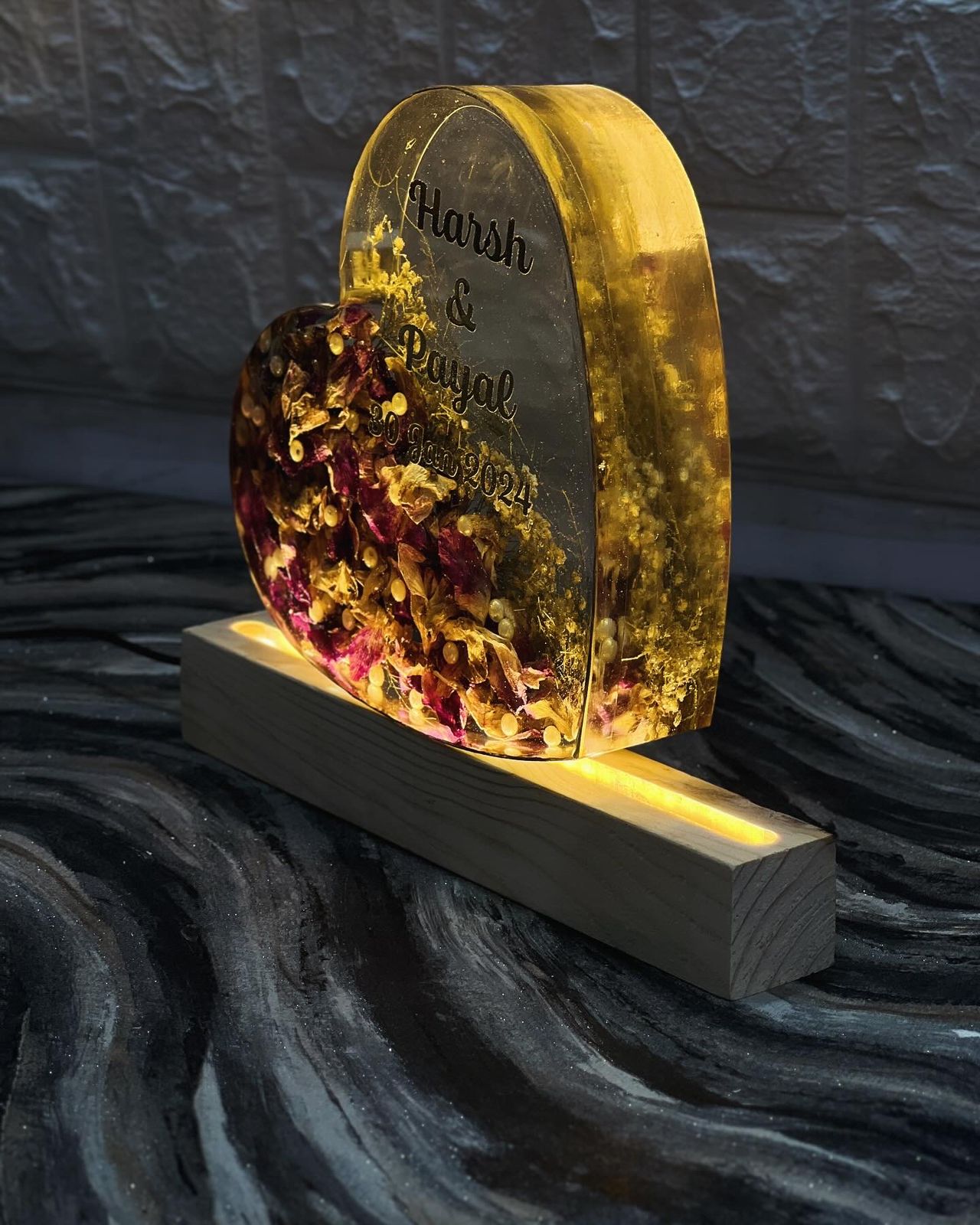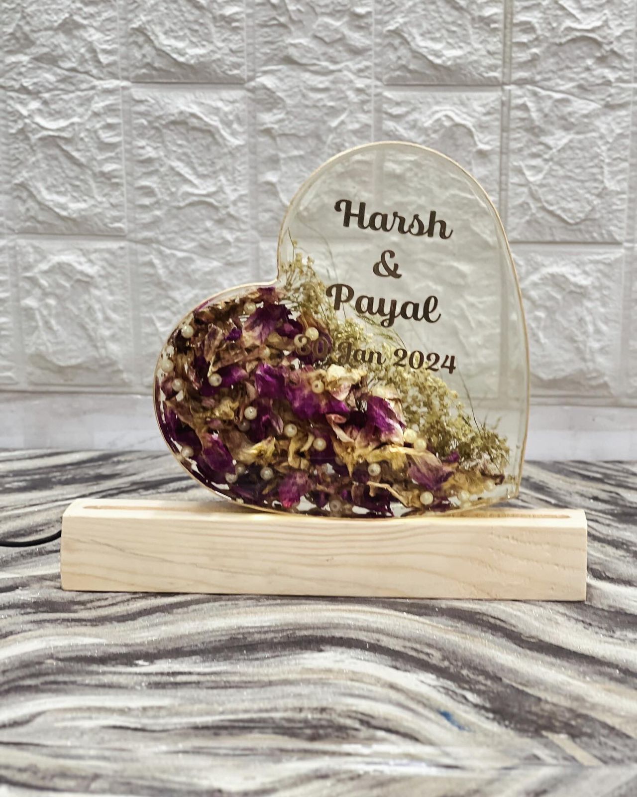 Product Description: This 8-inch heart-shaped deep casting frame is a romantic way to preserve your wedding garland, petals, and pearls. It’s designed to beautifully capture the essence of your wedding day with its delicate preserved flowers and elegant LED wooden stand. The personalized engraving of your names and wedding date adds a sentimental touch to this beautiful keepsake. This frame is a perfect tribute to your love and the memories you’ve shared. Features: