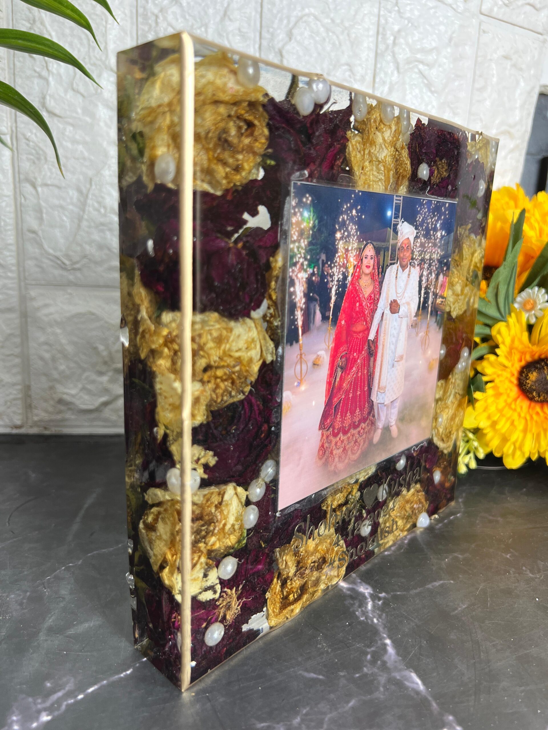 This beautiful resin preservation frame is a special way to keep your wedding memories alive forever. It has real dried flowers, pearls, and a clear resin finish that makes it long-lasting and elegant. Your wedding photo is placed in the center, making it a perfect keepsake for couples. The names and wedding date are also engraved on the frame for a personal touch. You can easily use our online varmala preservation services with home pickup and drop-off anywhere in India. Preserve your wedding or special memories in your preferred size and shape.