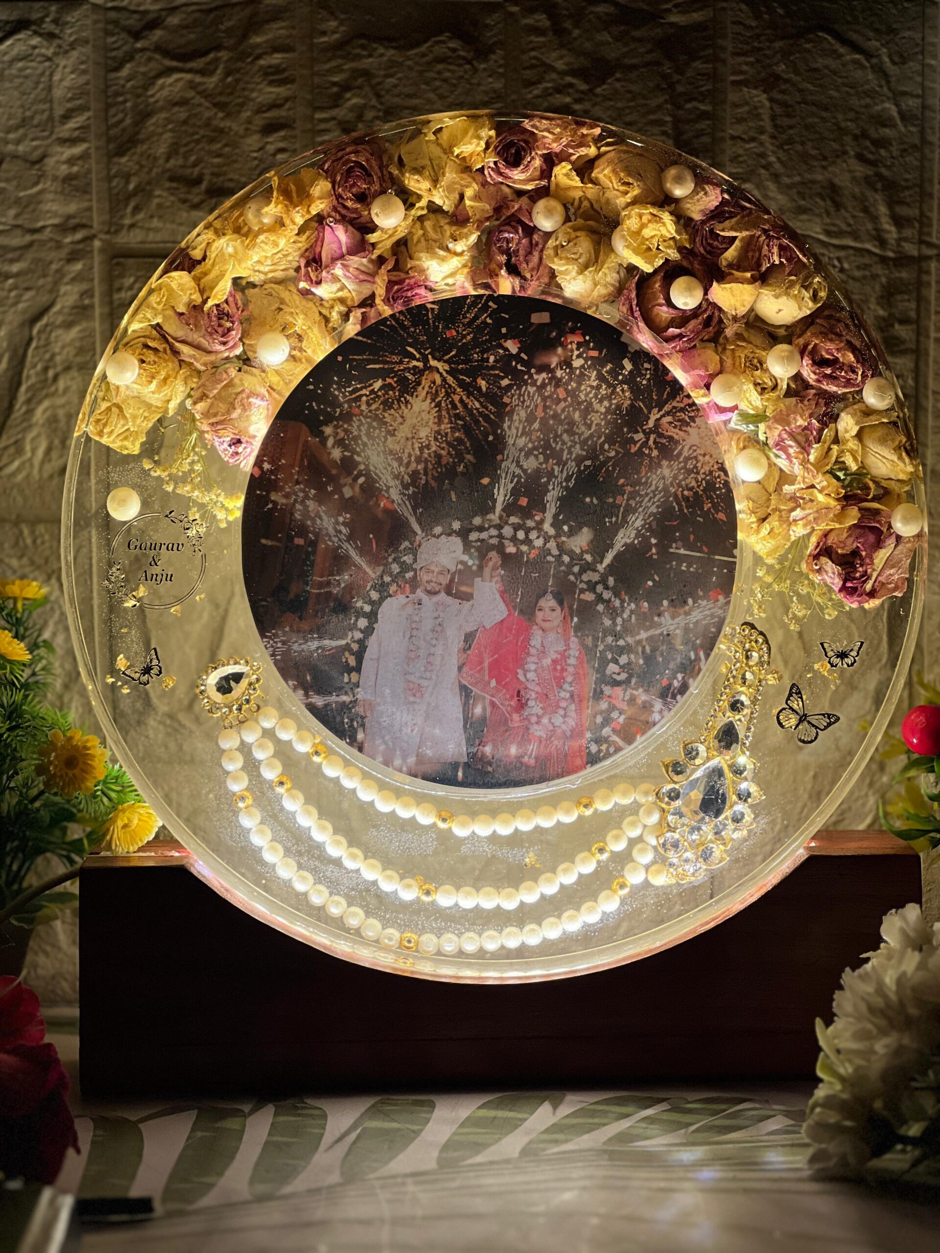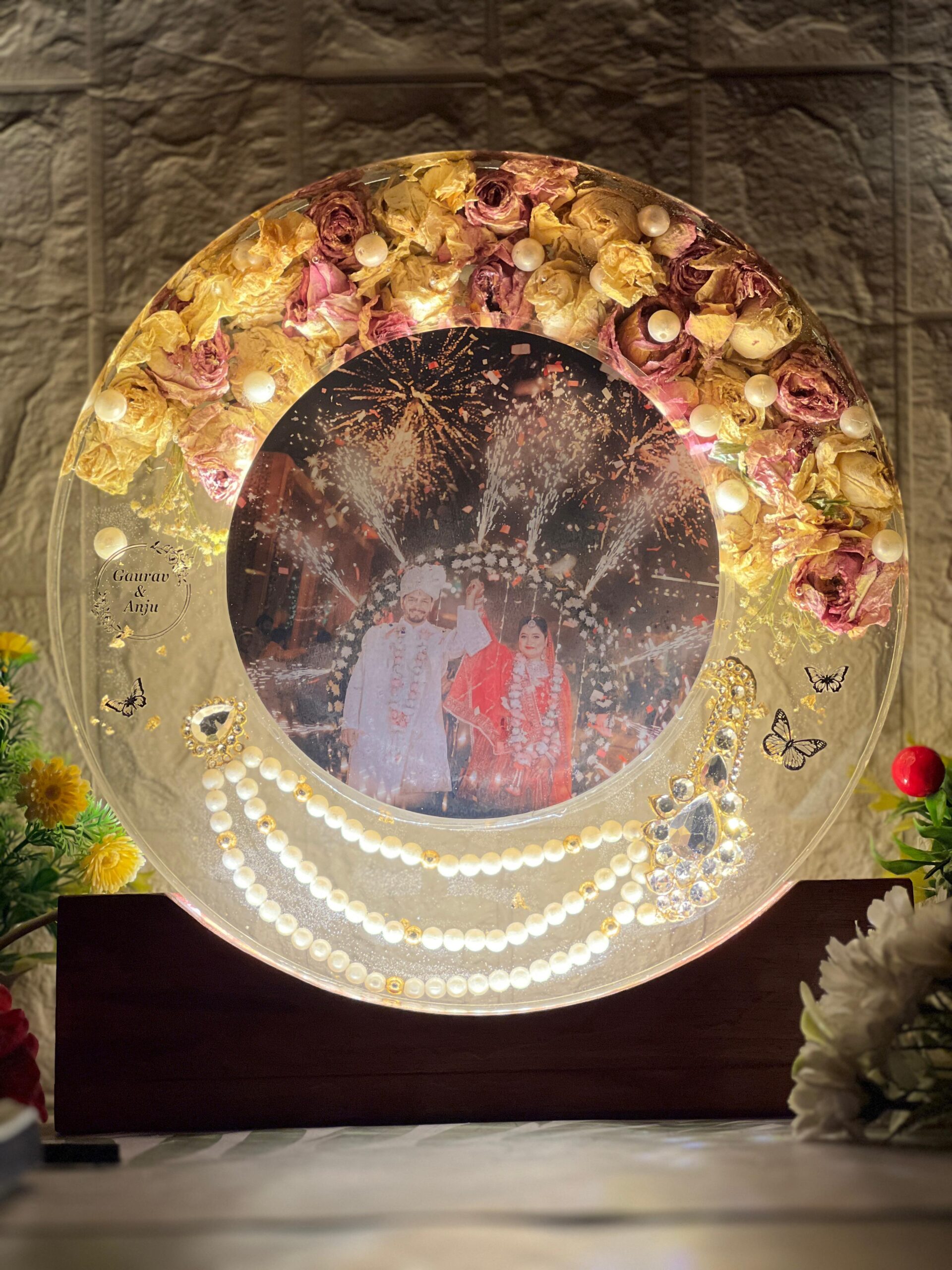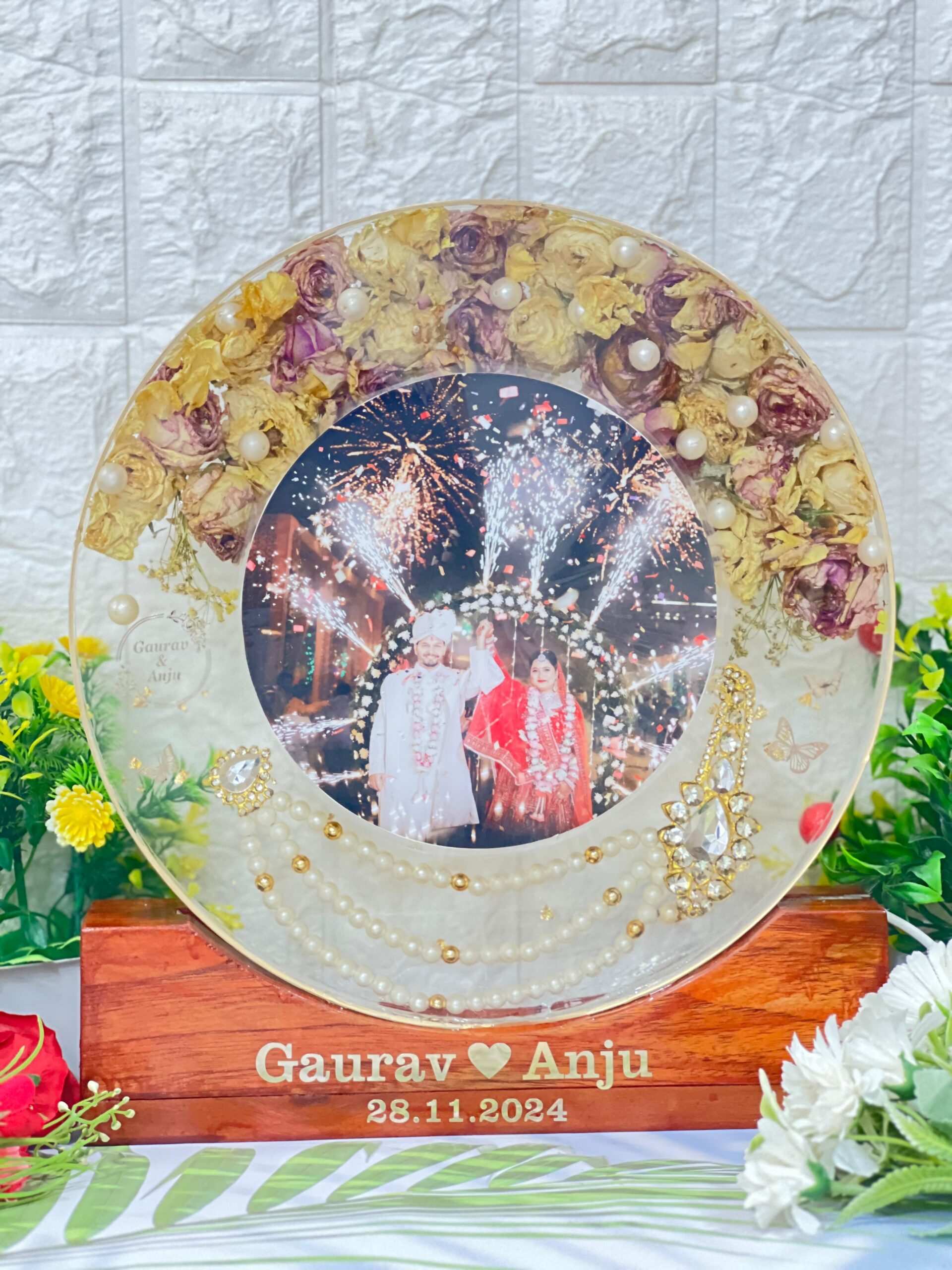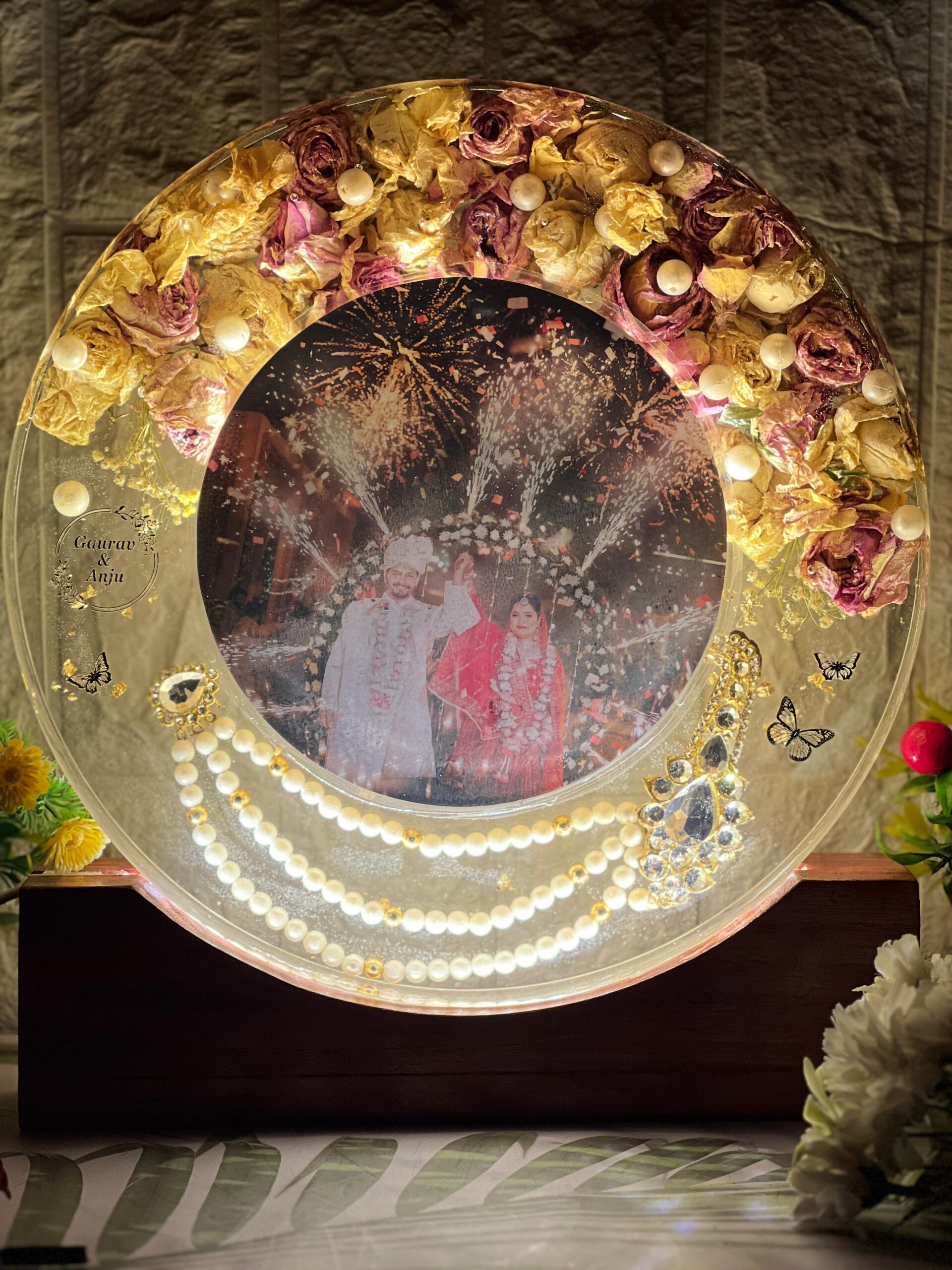 This circular resin frame turns your wedding picture into a grand display with rich floral beauty. It’s not just a frame — it’s a memory you can hold forever. The top half is filled with preserved red and yellow roses and soft pearls, giving it a royal look. The wood base adds a natural, classy finish that looks great anywhere.