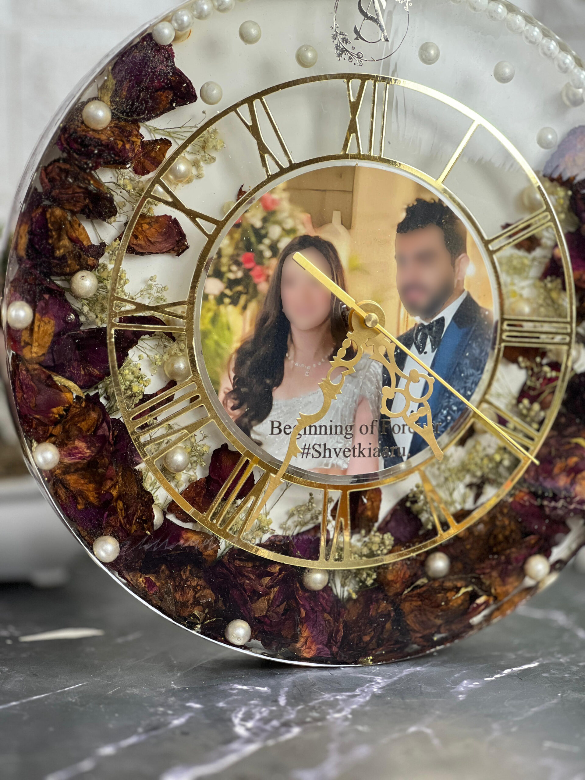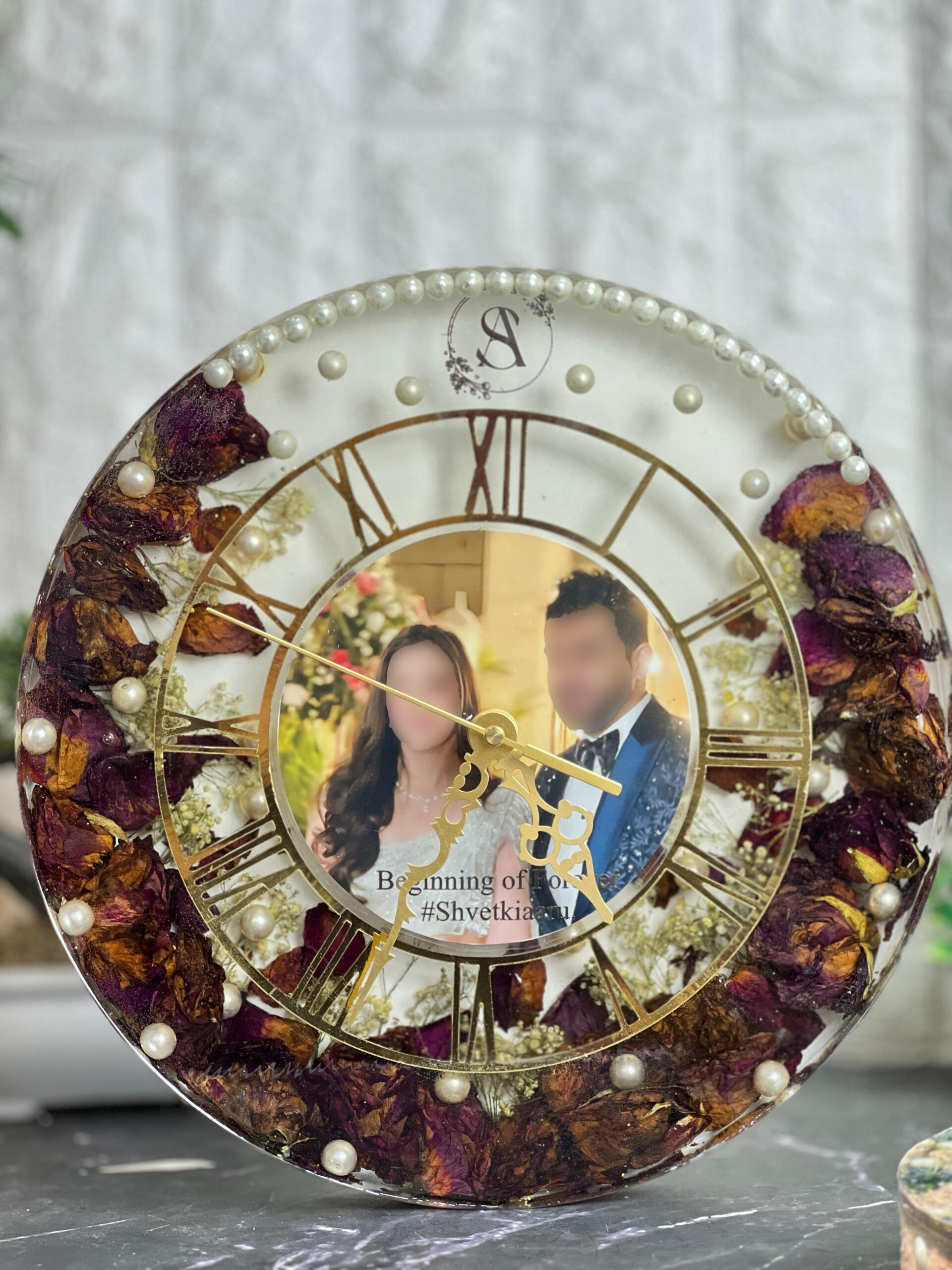 Around the photo, real dry flowers, white baby breath, and pearls are arranged with love. The golden roman numbers and hands give it a royal and modern look. You can fully customize the photo, text, and preserved items. This wall clock is not just for time—it’s a forever memory for your love story.