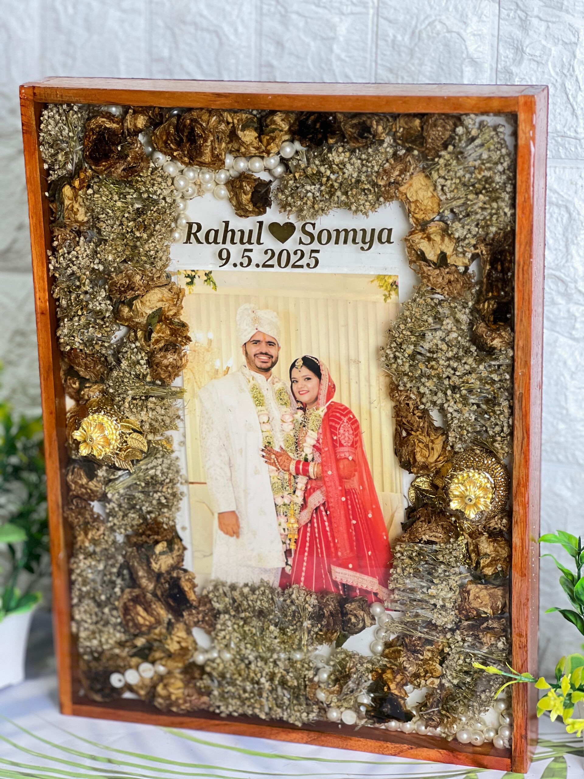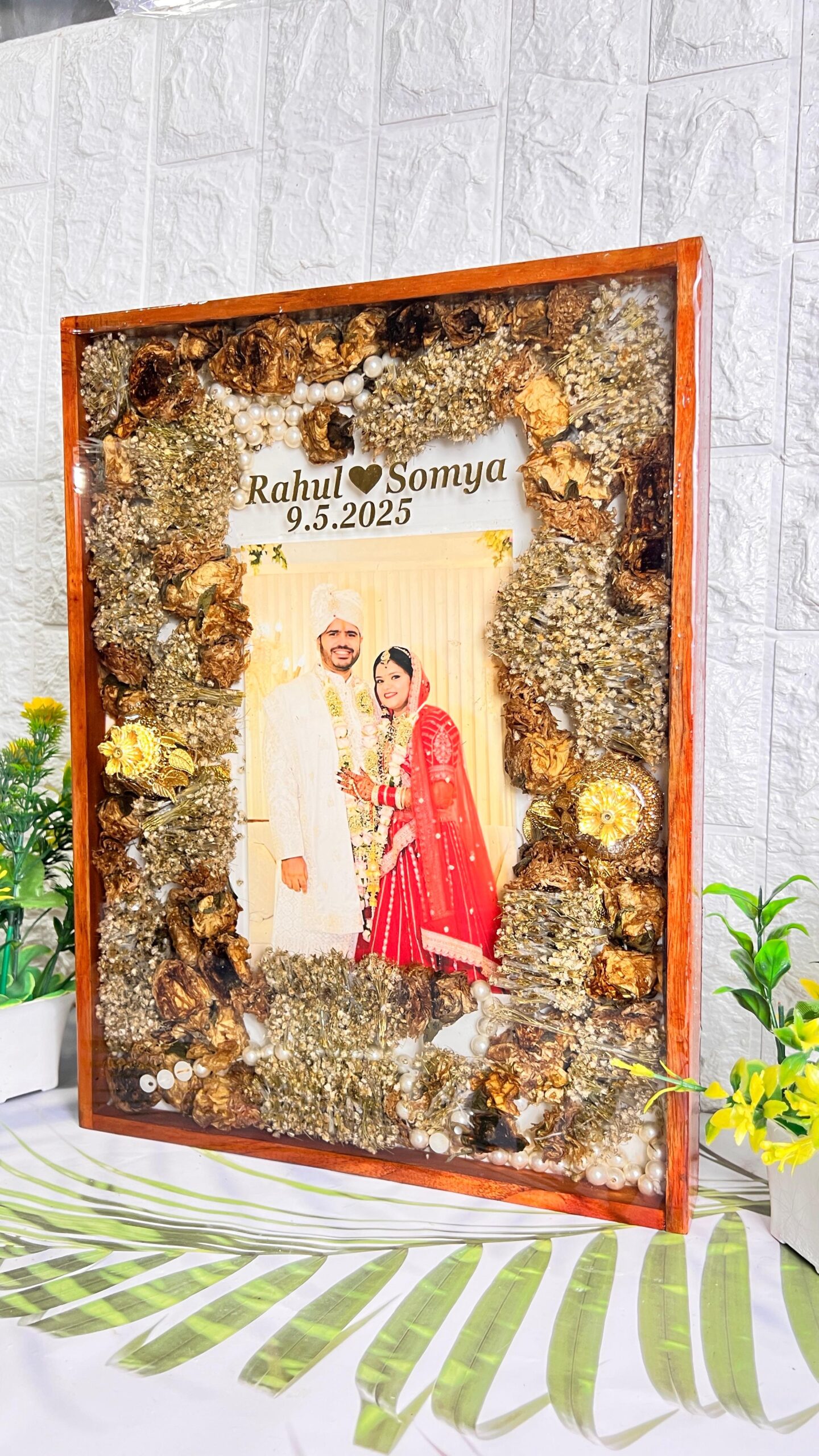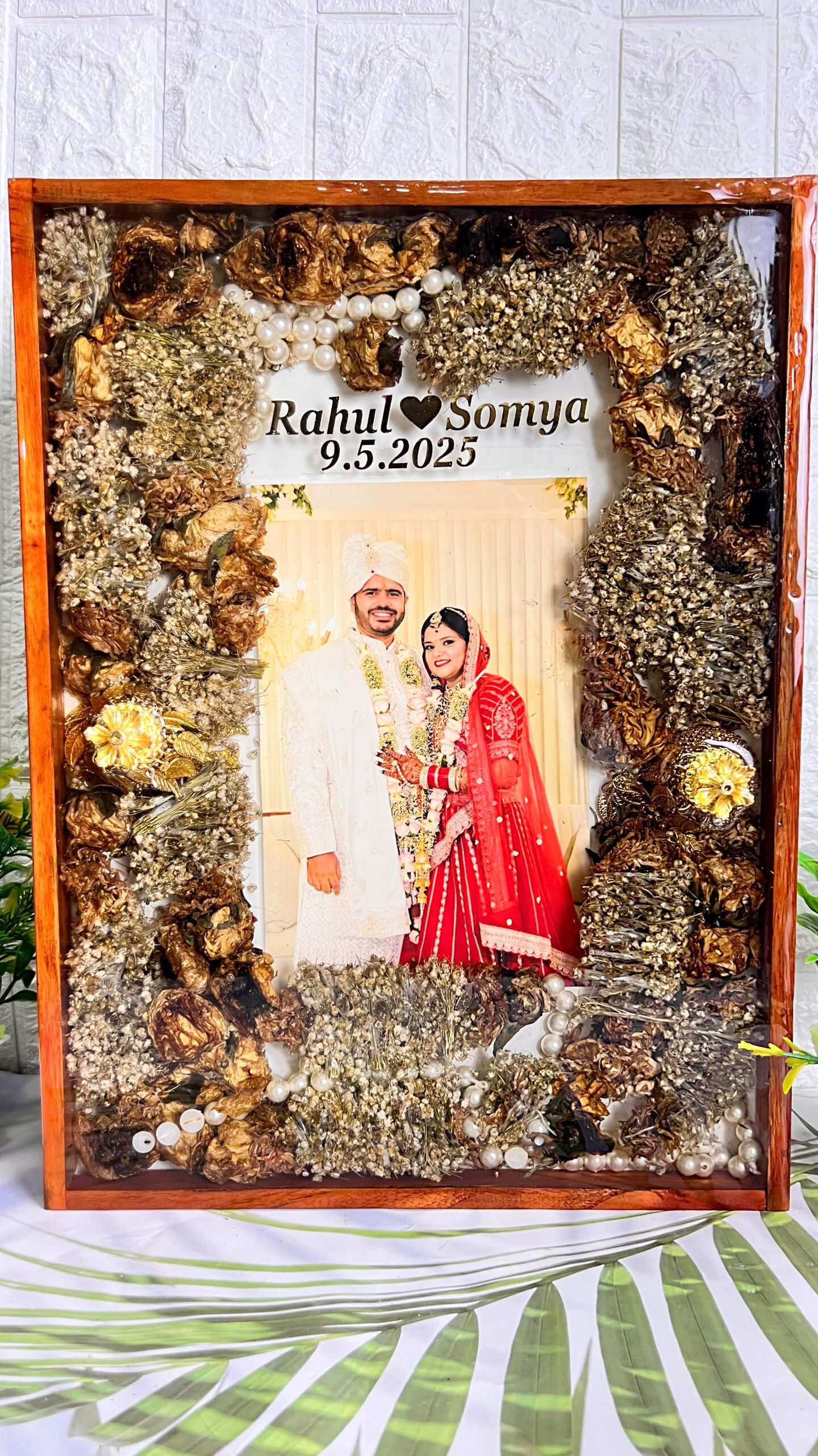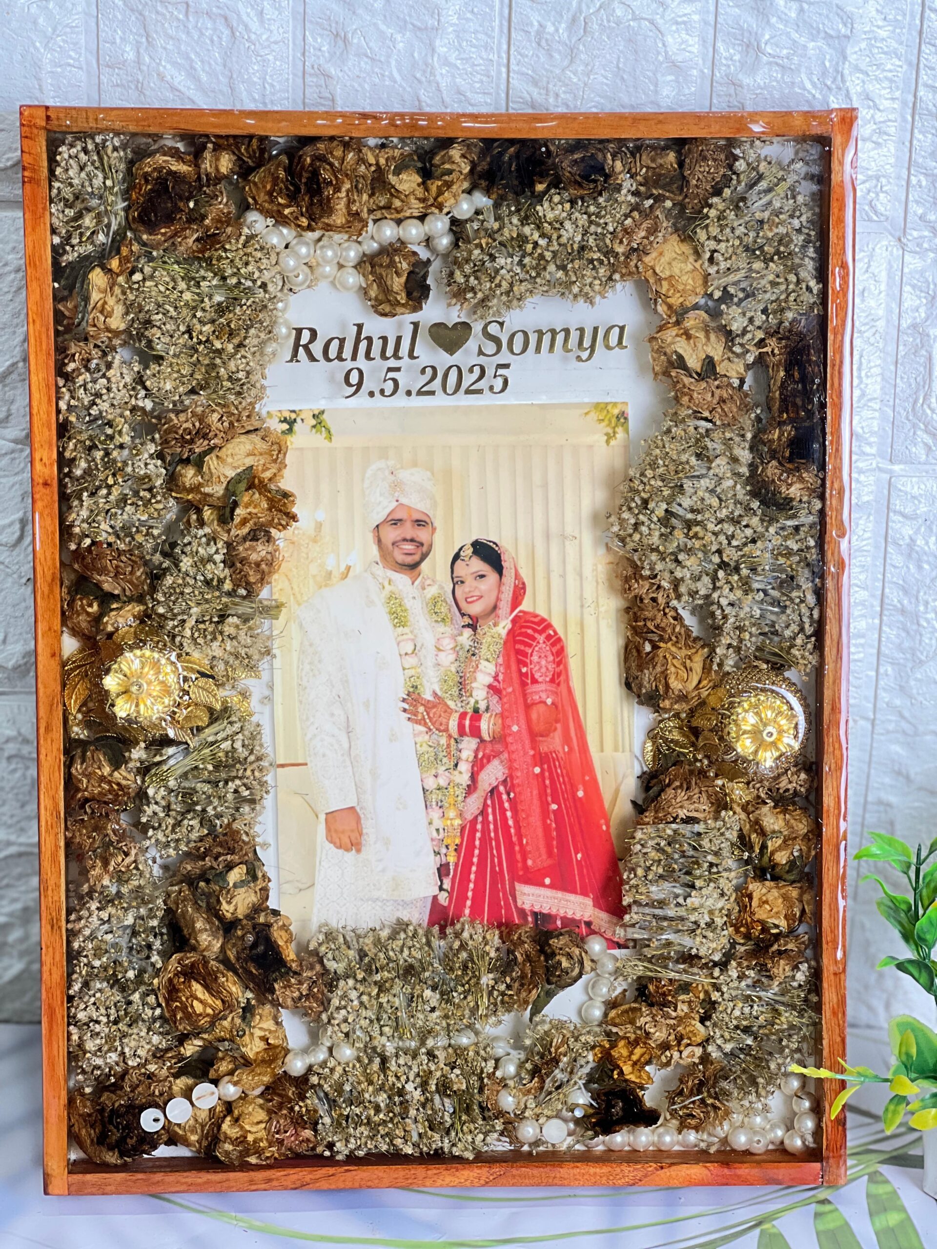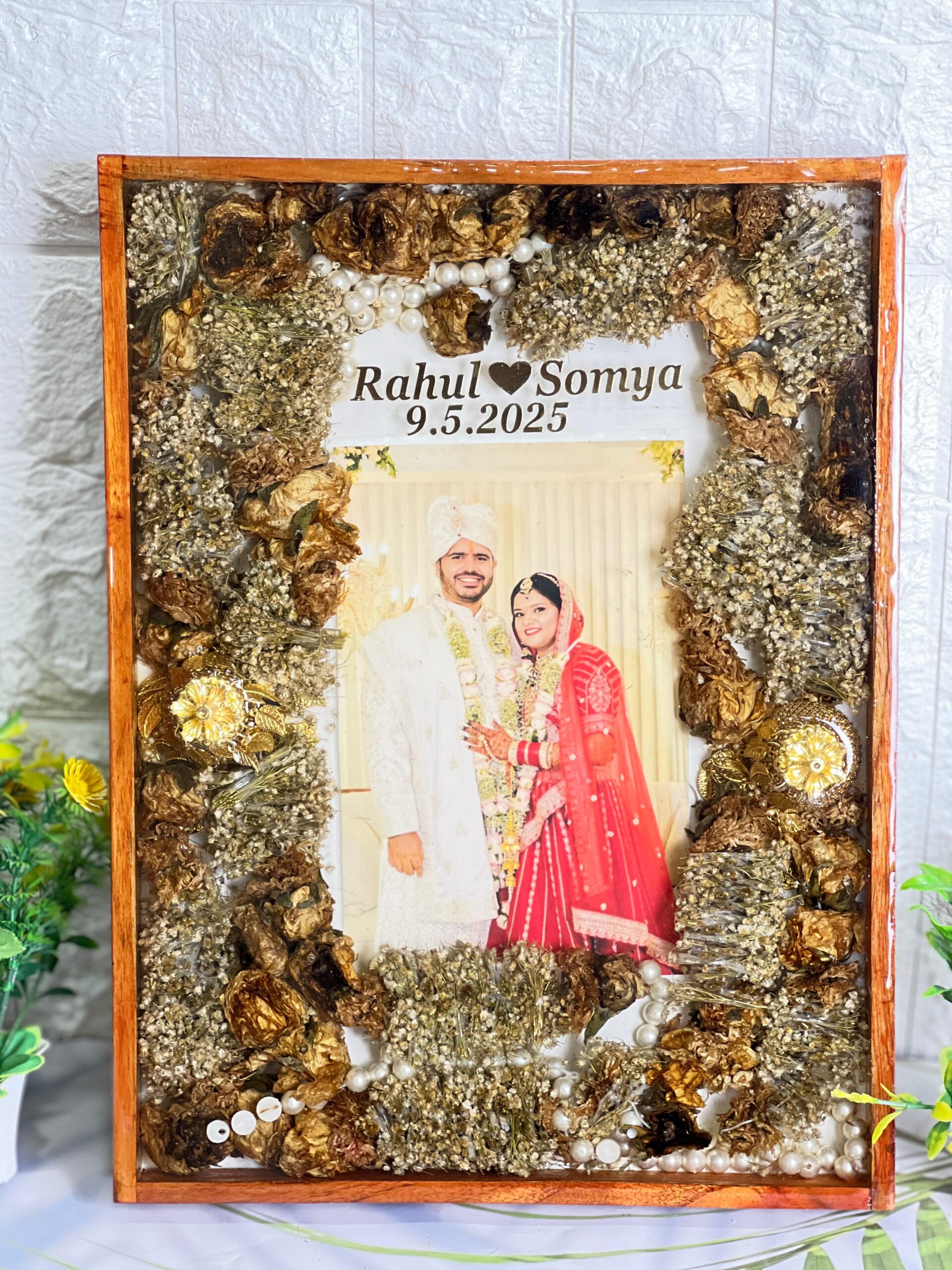 Celebrate your special day forever with this beautiful wedding resin Photo Frame. This frame is handmade using real varmala flowers, pearls, wedding photo, and other memorable decorations from your big day. The couple's name and wedding date are added at the top, giving it a personal touch.