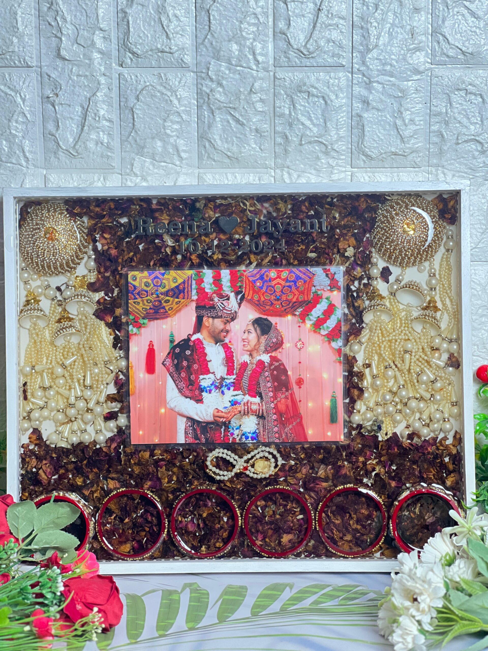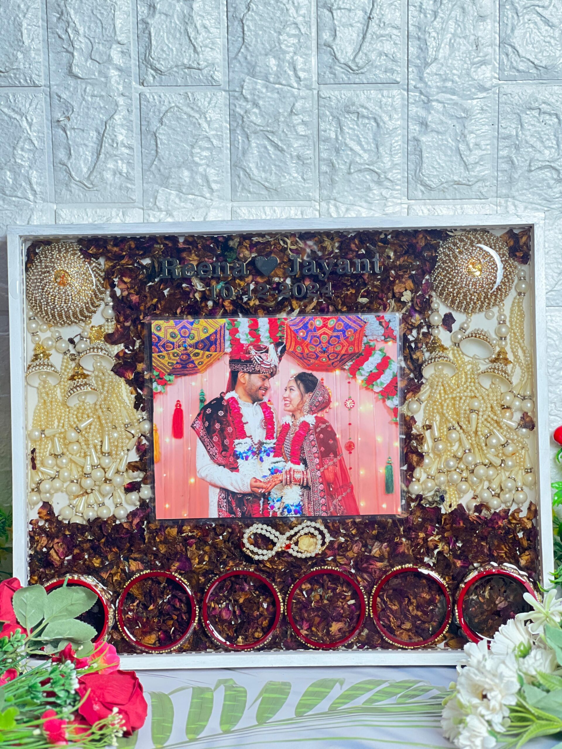 This unique wedding frame is made with care and love. The center holds your special wedding photo, and around it are stunning designs with dry petals, kaleera, gold pearls, and bright lights. The frame looks like a celebration in itself.