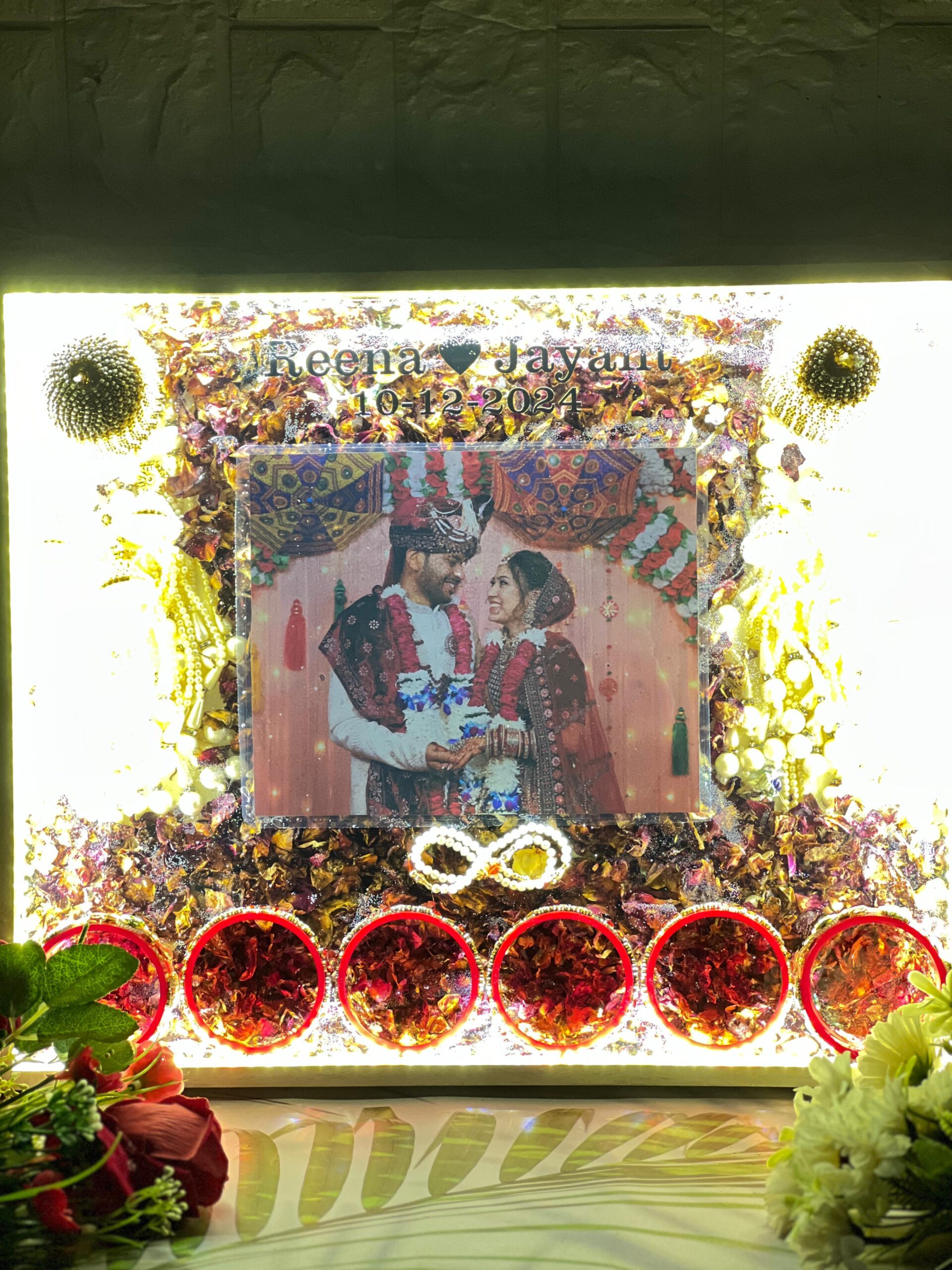 The bottom has 6 red bangle holders filled with petals, making the frame both useful and artistic. Lights all around make your picture shine beautifully, even in the dark.
