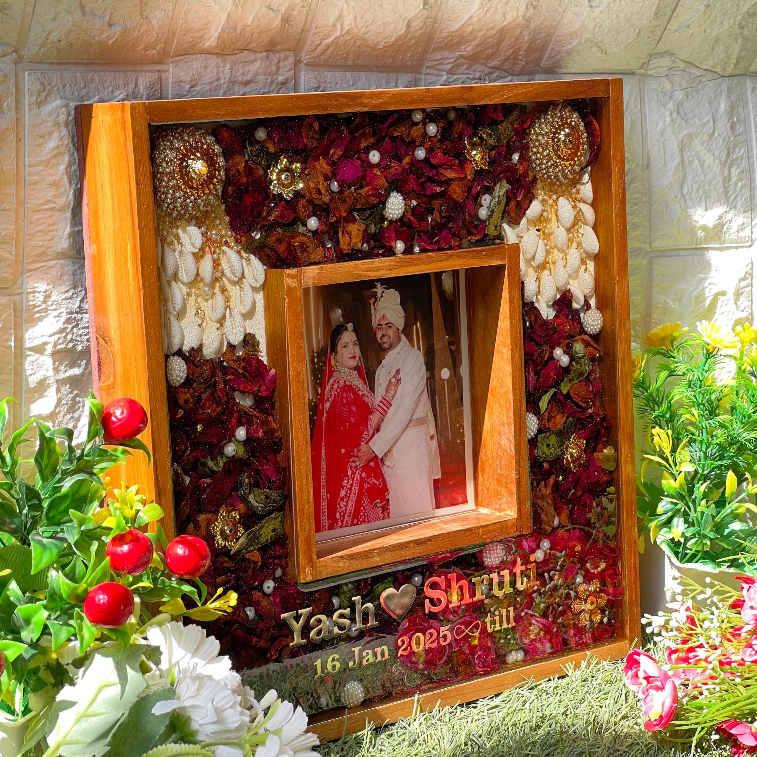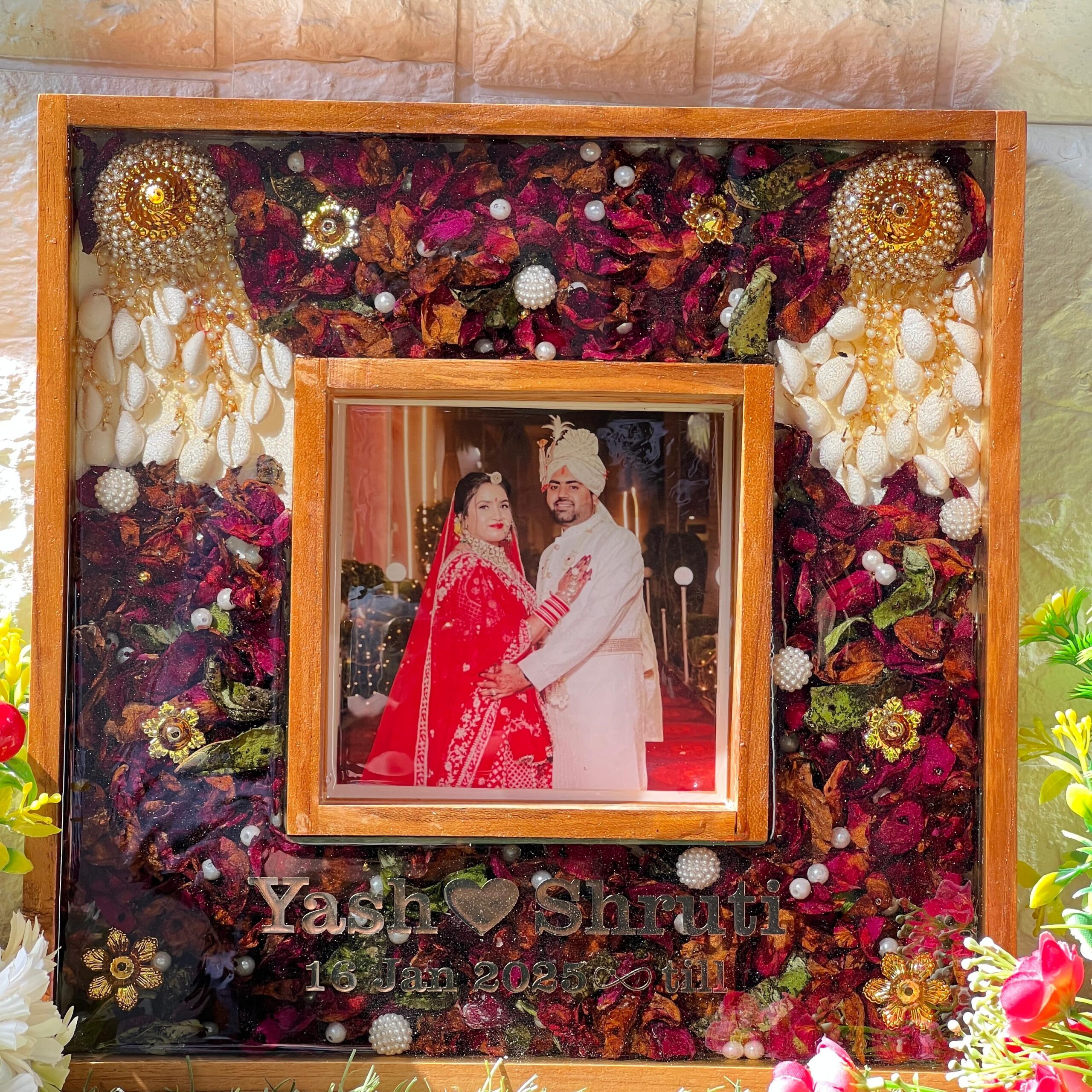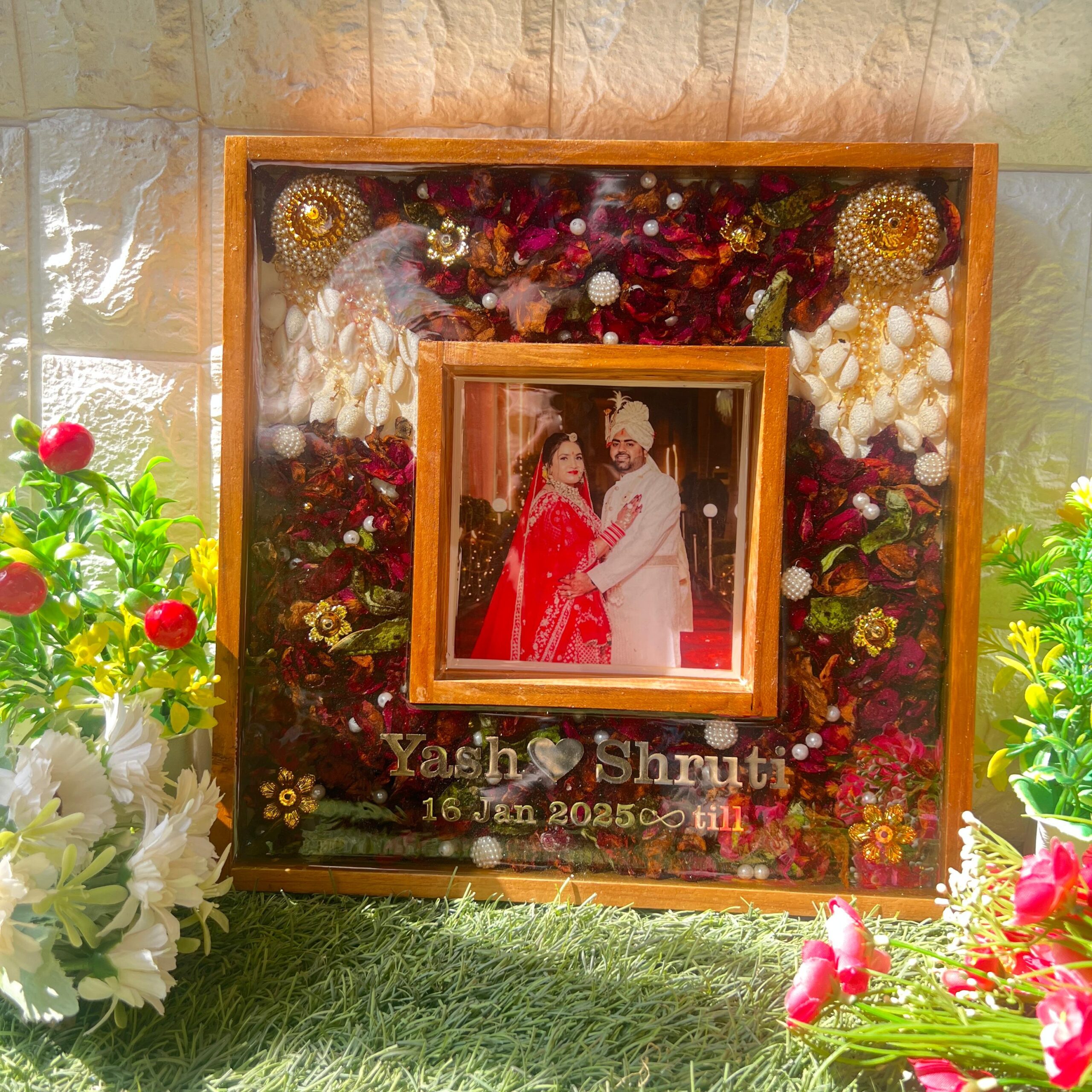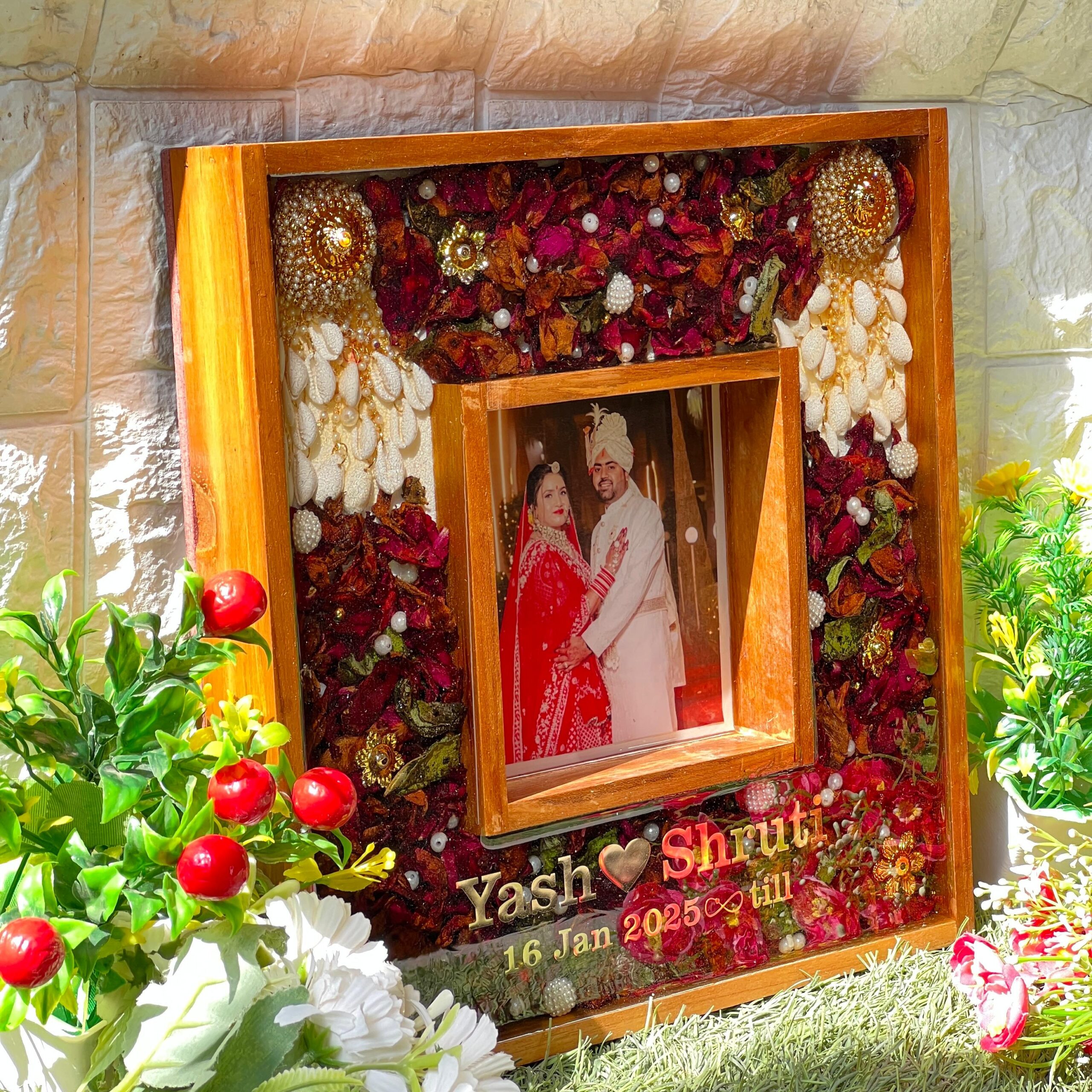 Turn your wedding day into a piece of forever art with this square-shaped wedding varmala preservation resin frame. Designed with real preserved wedding flowers and elegant bridal jewelry, this custom memory frame keeps your love story alive in the most beautiful way.
