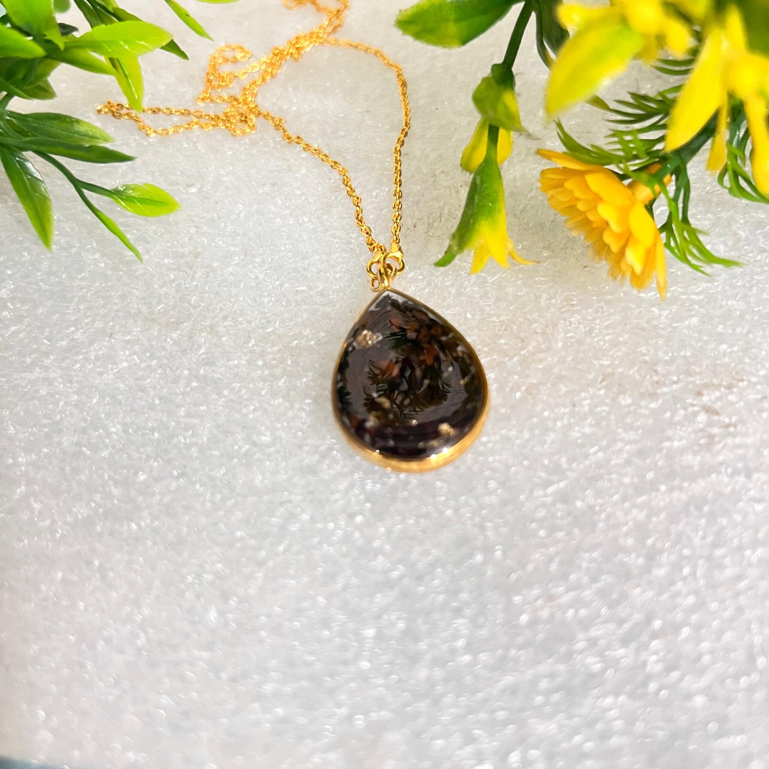 In this design, we have carefully preserved your varmala petals inside premium resin, adding golden flakes to give it a sparkling, royal look. The heart pendant reflects your everlasting love, while the teardrop pendant symbolizes the emotions of that once-in-a-lifetime moment.