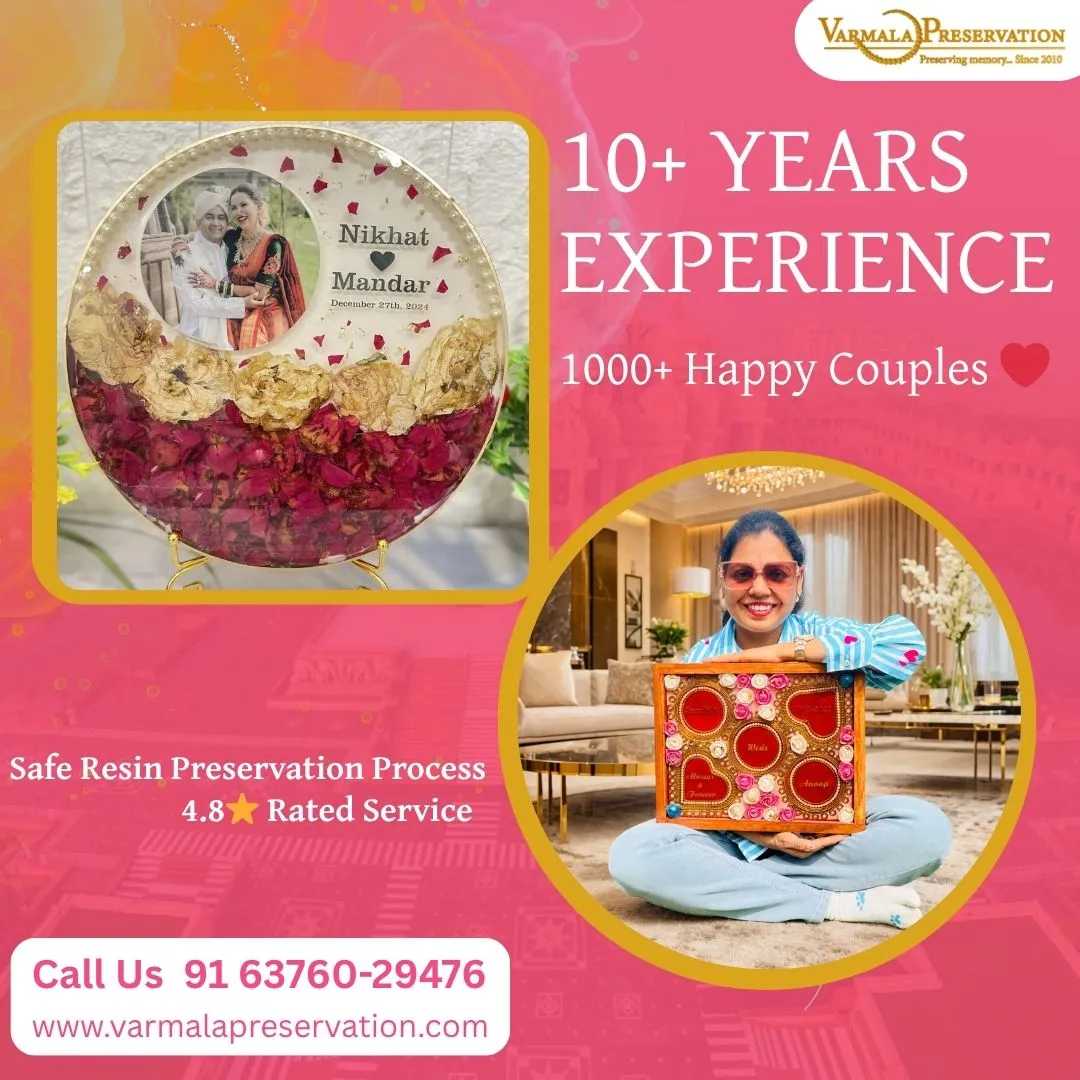 People in Nagpur choose us when they want "varmala preservation Nagpur" that stays strong for many years. When we seal flowers in resin, we keep the shape steady so it looks like a special keepsake, not a rushed craft.